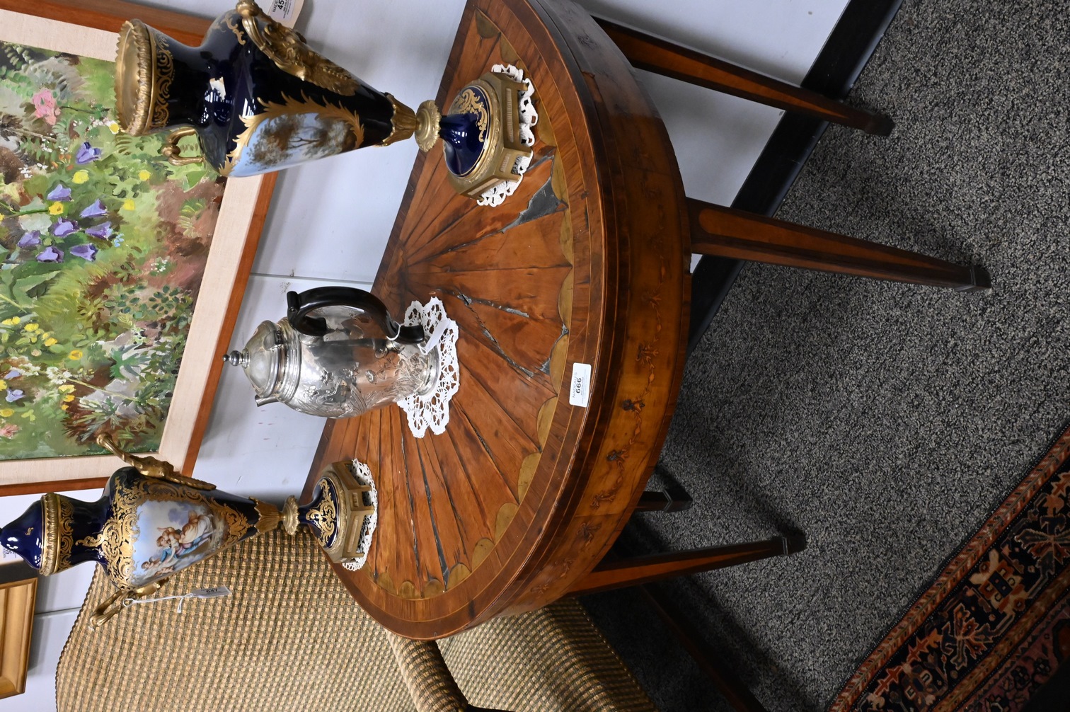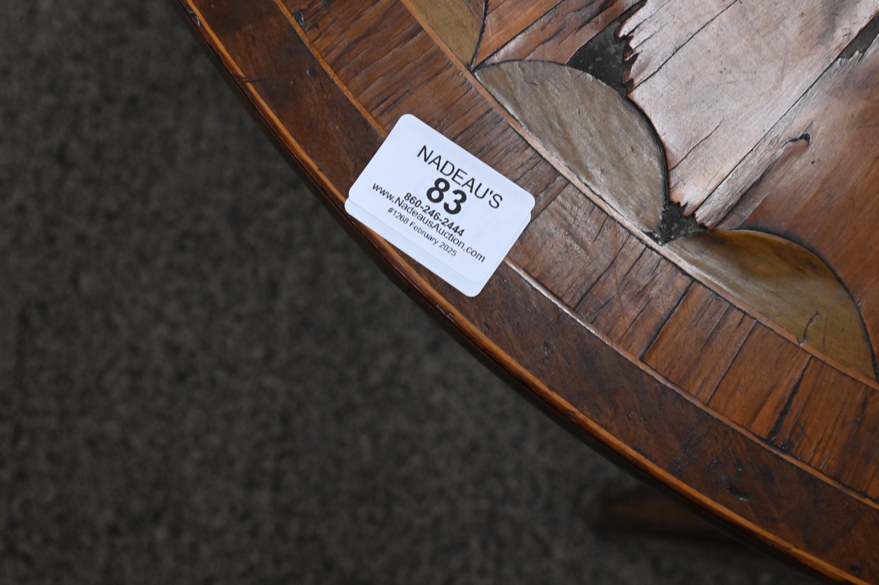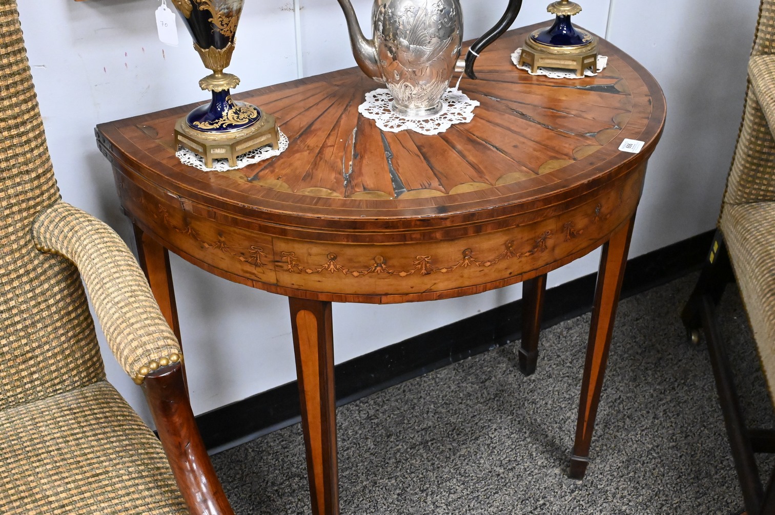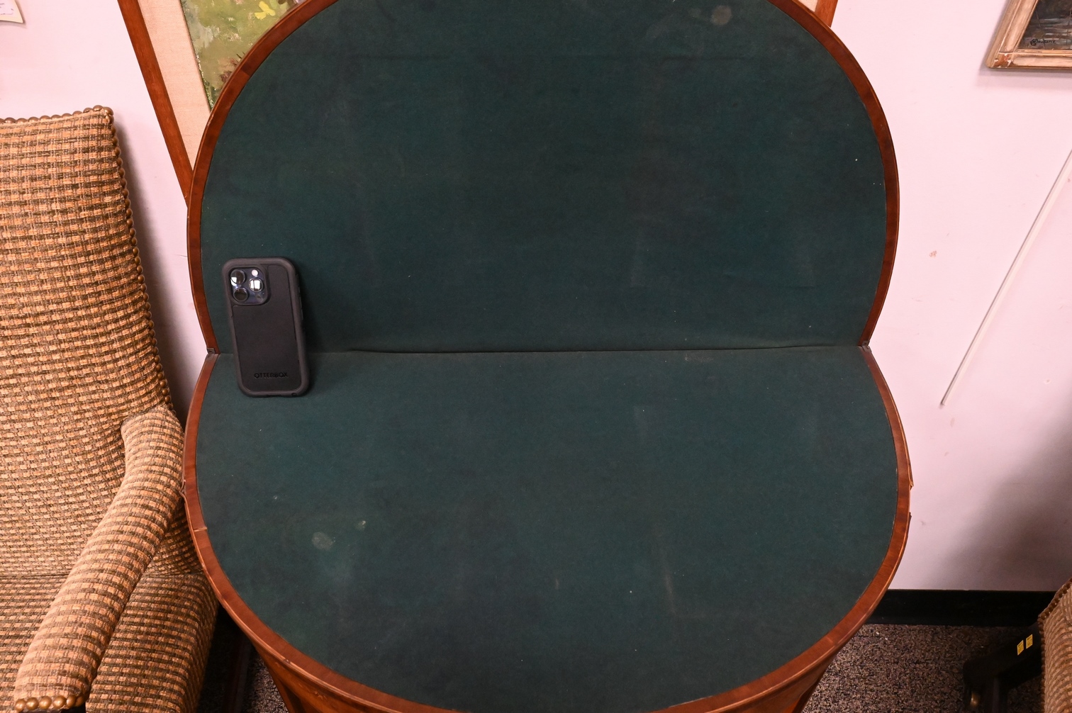 George III Demilune Games Tabletop having conch shell and fan inlay, satinwood inlaid skirt on satin panel, square tapered legs ending in pad feet, interior having green felt, top with veneer image (pieces of veneer missing), circa 1800