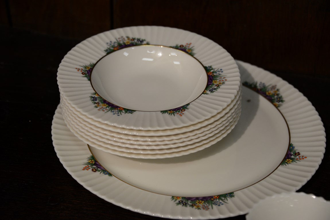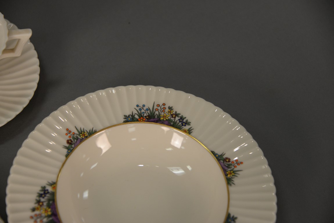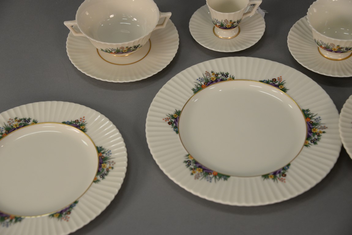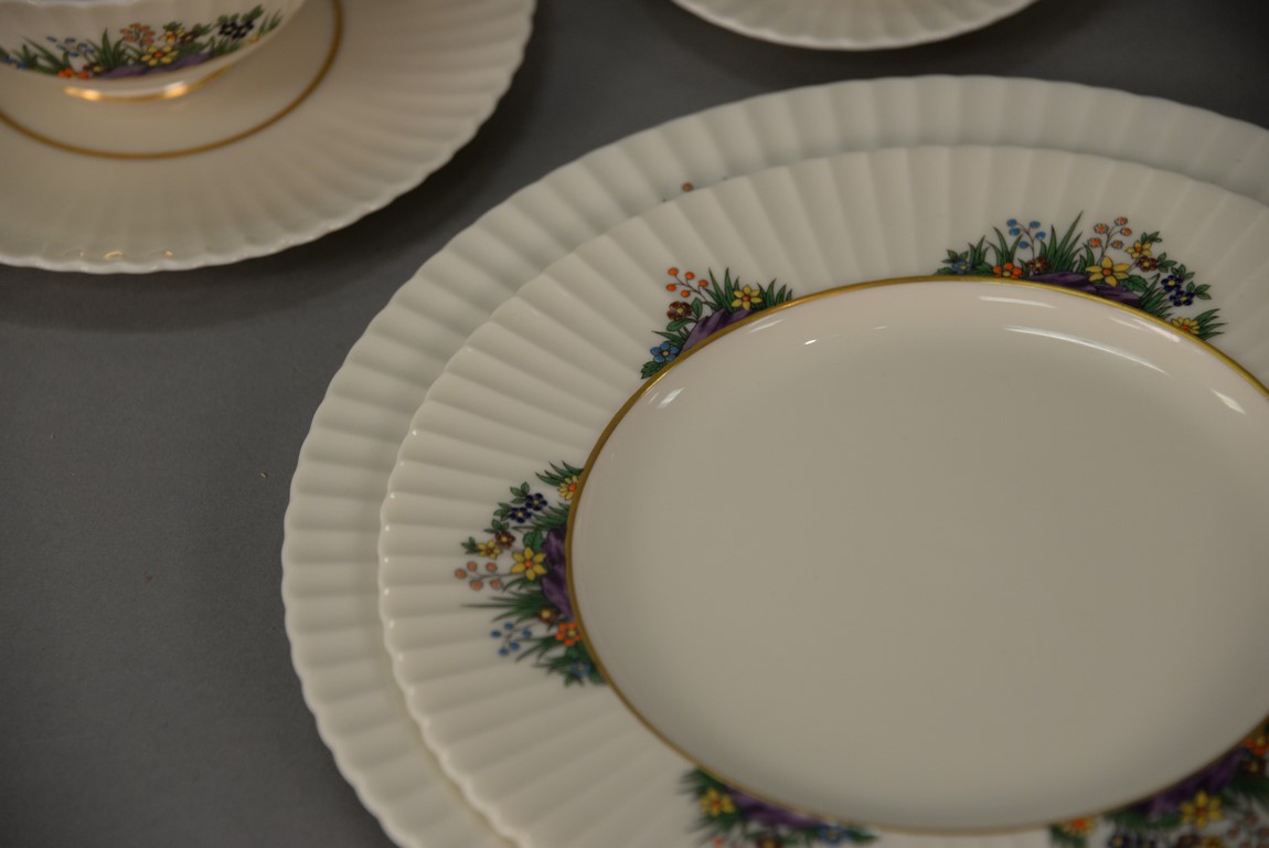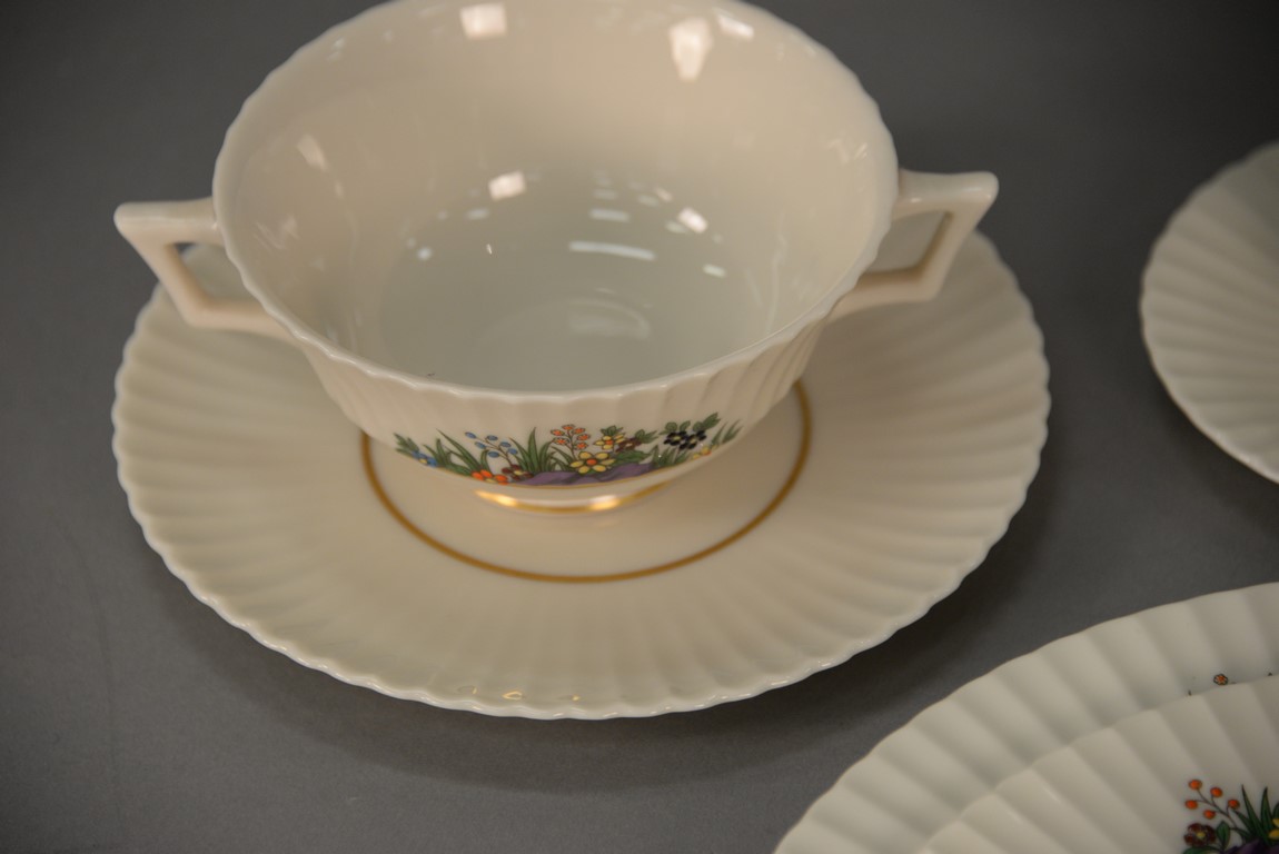 Lot 83: Lenox Rutledge dinner set with enameled flowers, setting for eight comprising of 17 dessert plates, 8 bread plates, 8 dinner plates, 11 salad plates, 8 berry bowls, 8 flat soups, 8 cream soups with handles, 8 cream soup liners, 9 cups with 9 saucers,