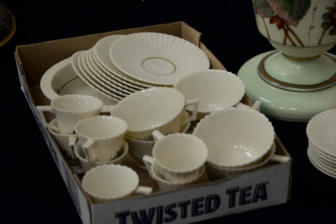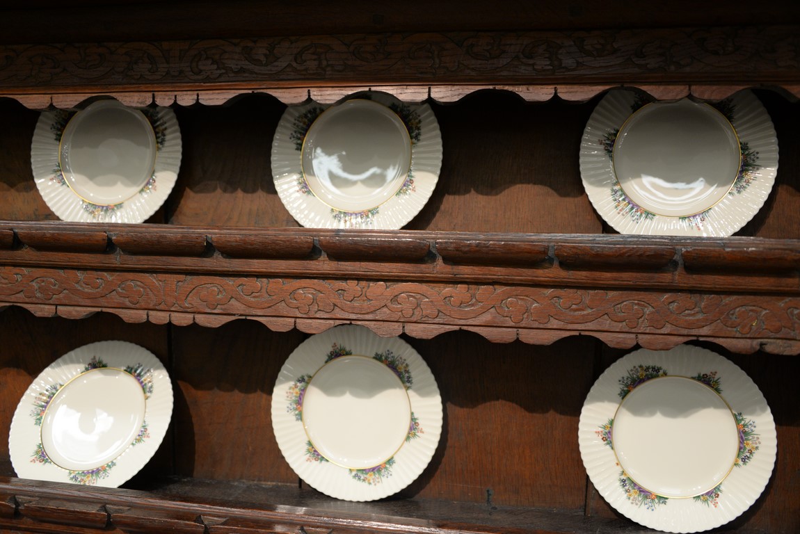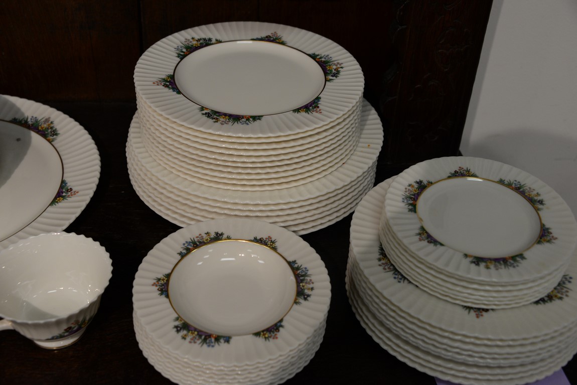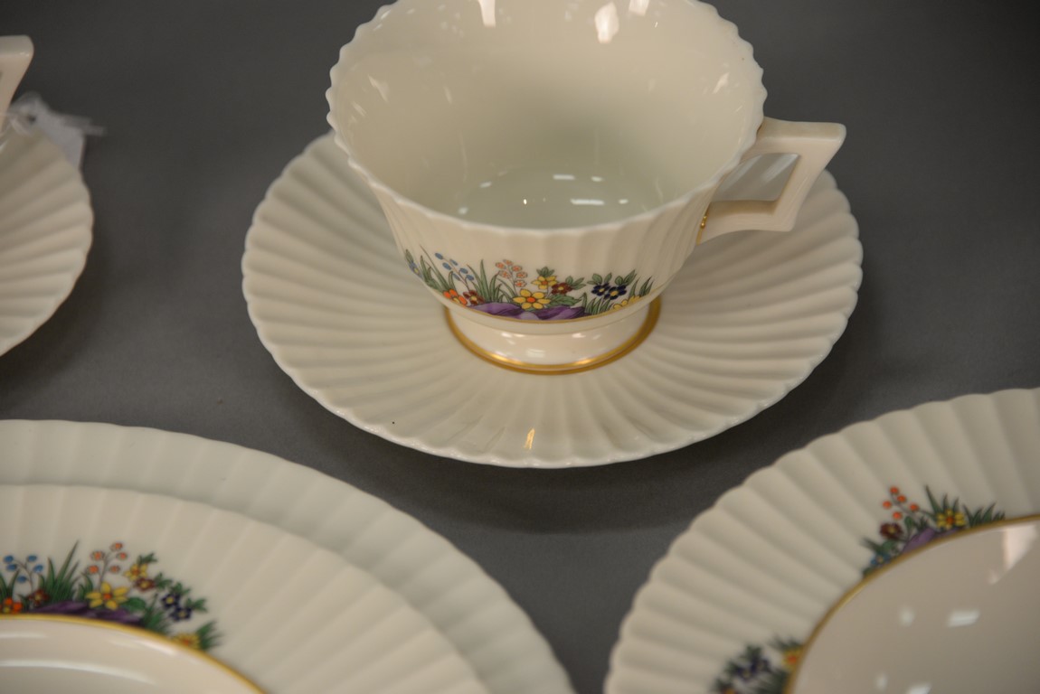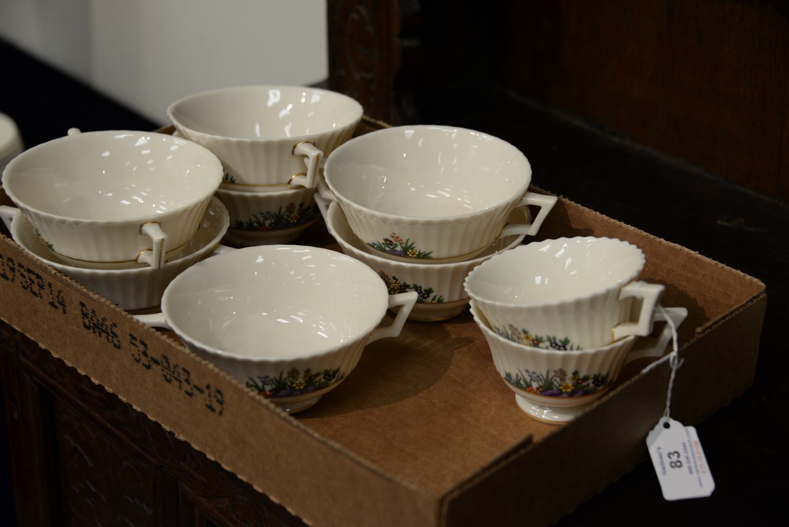 Lot 83: Lenox Rutledge dinner set with enameled flowers, setting for eight comprising of 17 dessert plates, 8 bread plates, 8 dinner plates, 11 salad plates, 8 berry bowls, 8 flat soups, 8 cream soups with handles, 8 cream soup liners, 9 cups with 9 saucers,