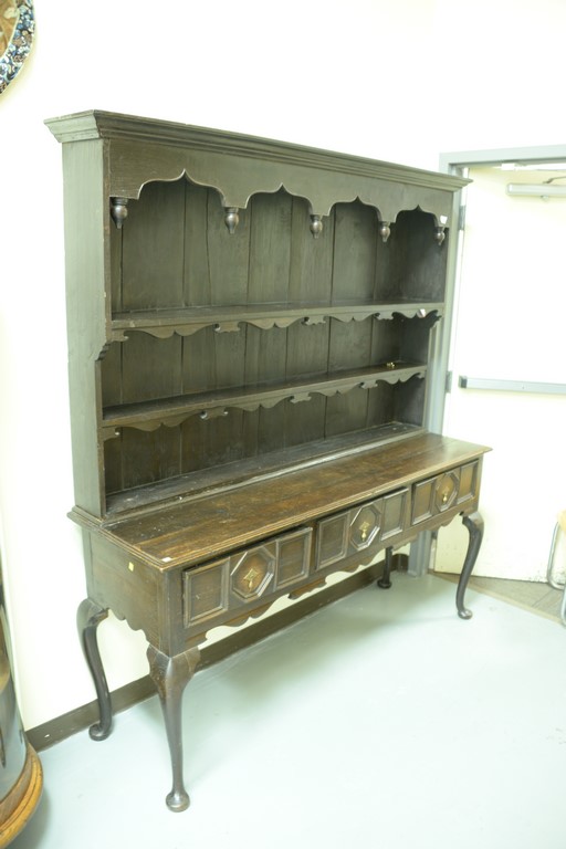 Oak Welsh cupboard in two parts, upper section having cornice molding over open shelves on lower section having three drawers set on cabriole legs ending in pad feet. ht. 77in., wd. 68 1/2in., dp. 20in.