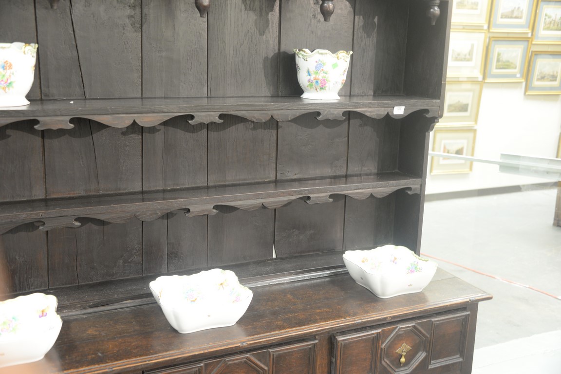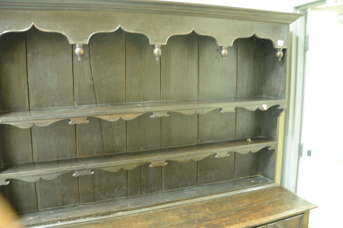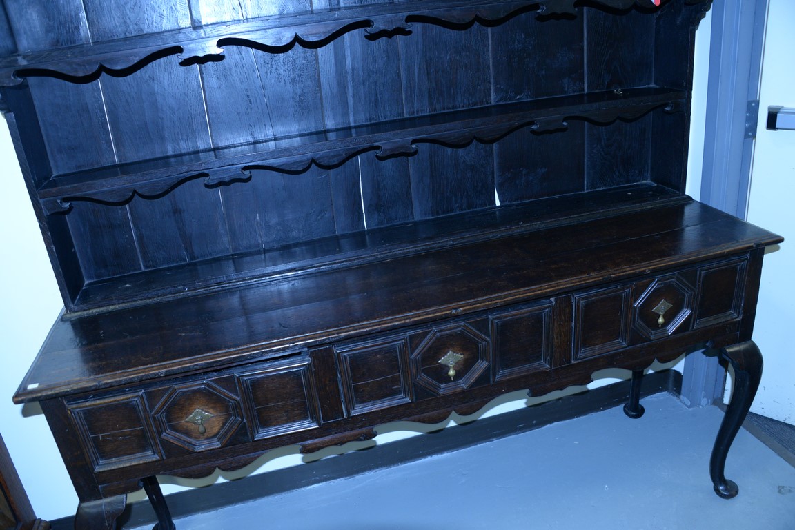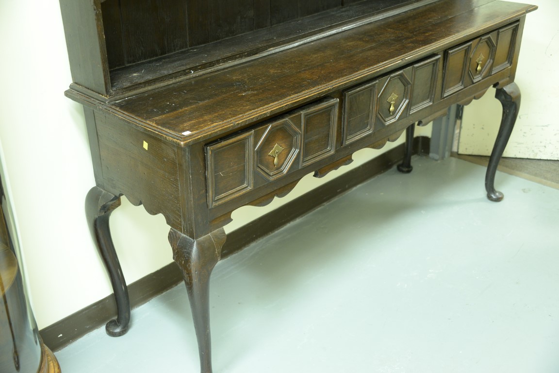 Lot 83: Oak Welsh cupboard in two parts, upper section having cornice molding over open shelves on lower section having three drawers set on…