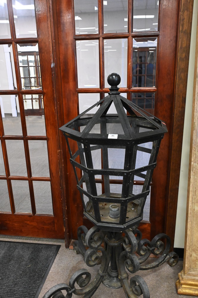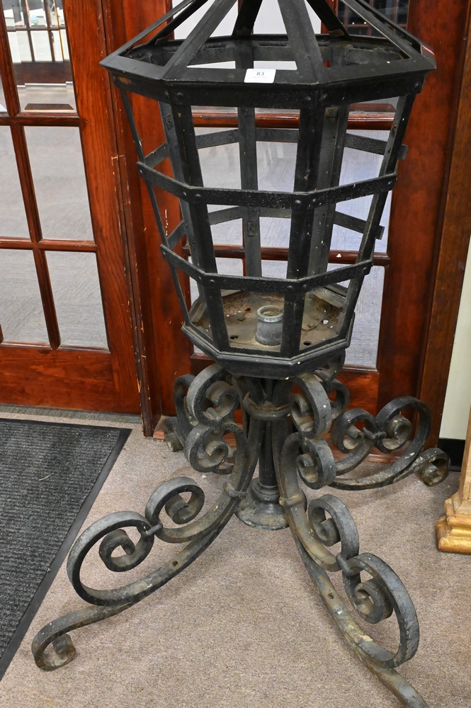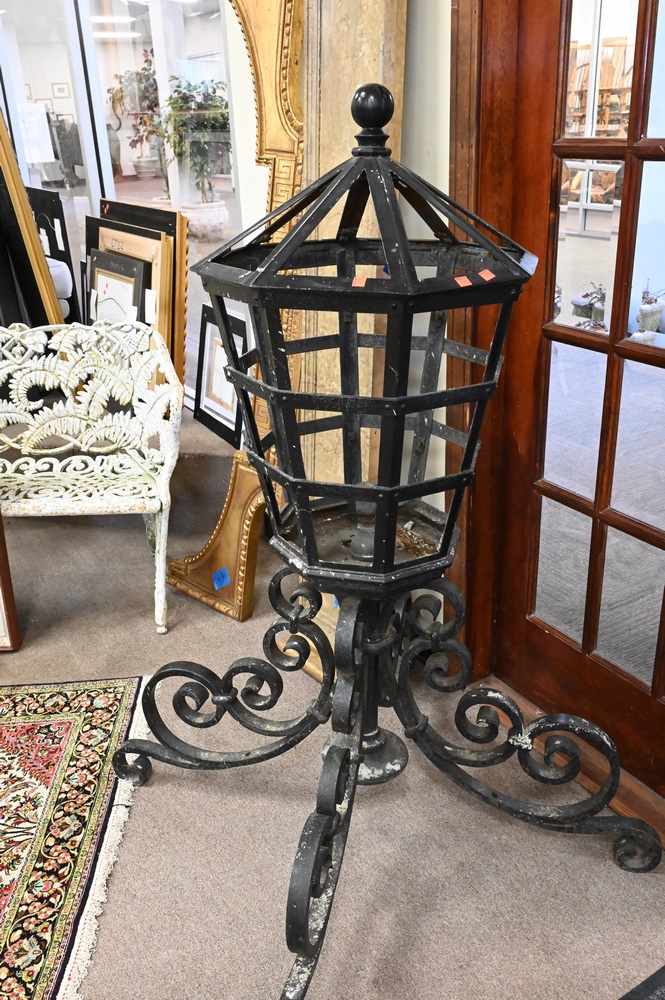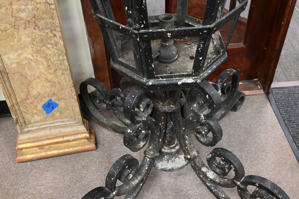 Pair of Large Iron Outdoor Lights, on scrolled iron bases, height 55 inches, width across base 48 inches.