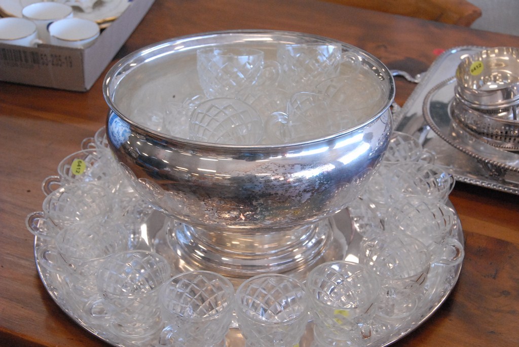 Ten piece silver plate lot punch bowl, underplate, trays, two wine coasters, and various small pieces along with two boxes of pressed glass punch cups.