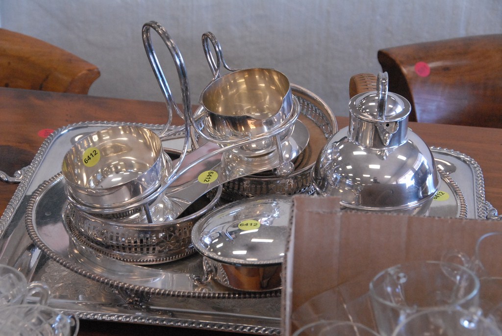 Lot 83: Ten piece silver plate lot punch bowl, underplate, trays, two wine coasters, and various small pieces along with two boxes of press…