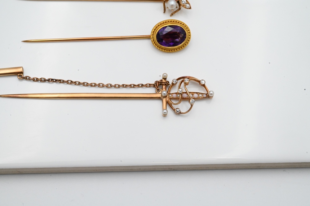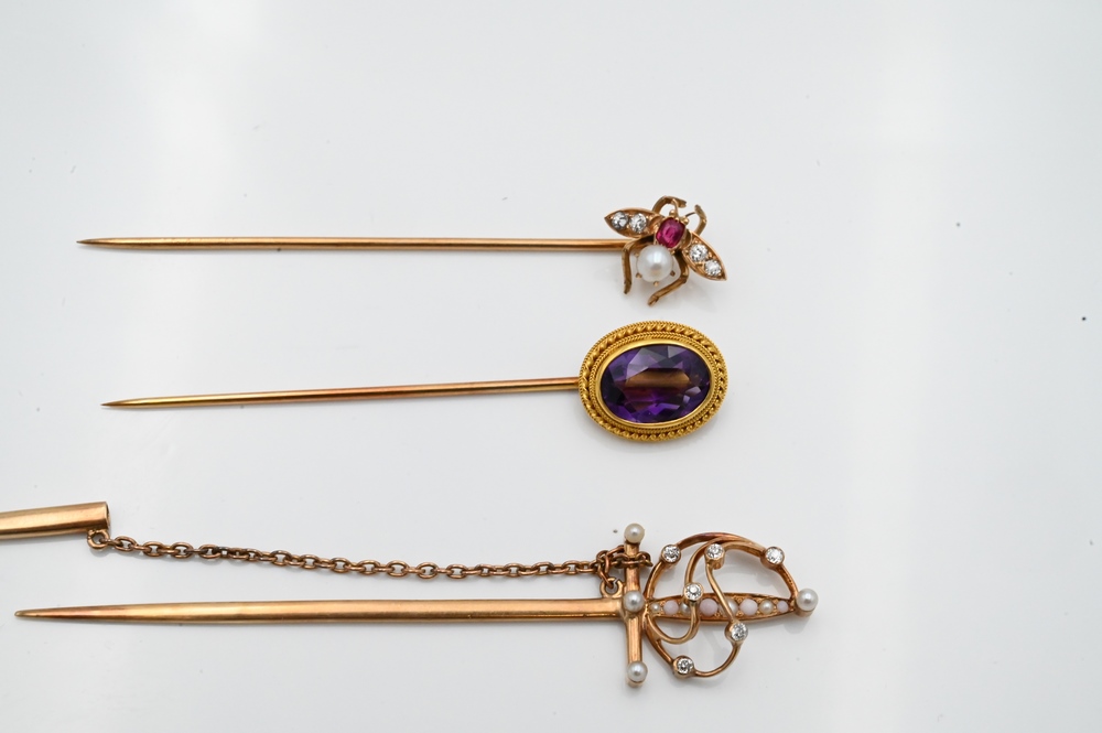 Three 14 Karat Gold Stick Pins, to include one fly with four diamonds, ruby, and one pearl; along with sword having diamonds, pearls, and one amethyst; 9.9 grams.