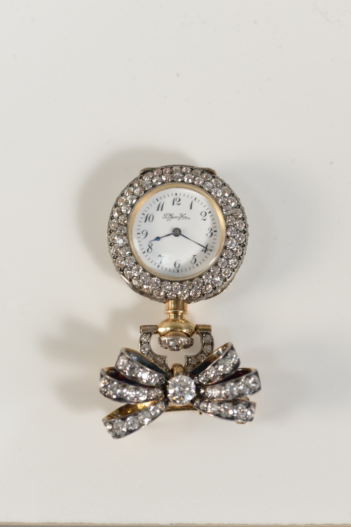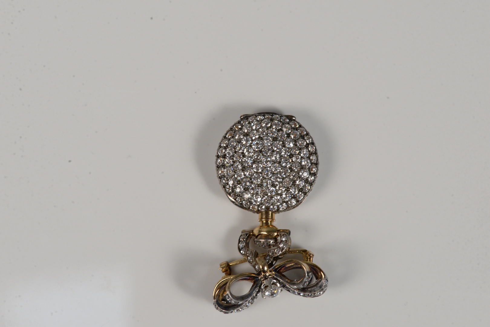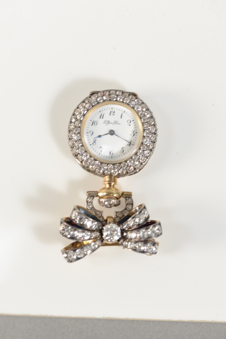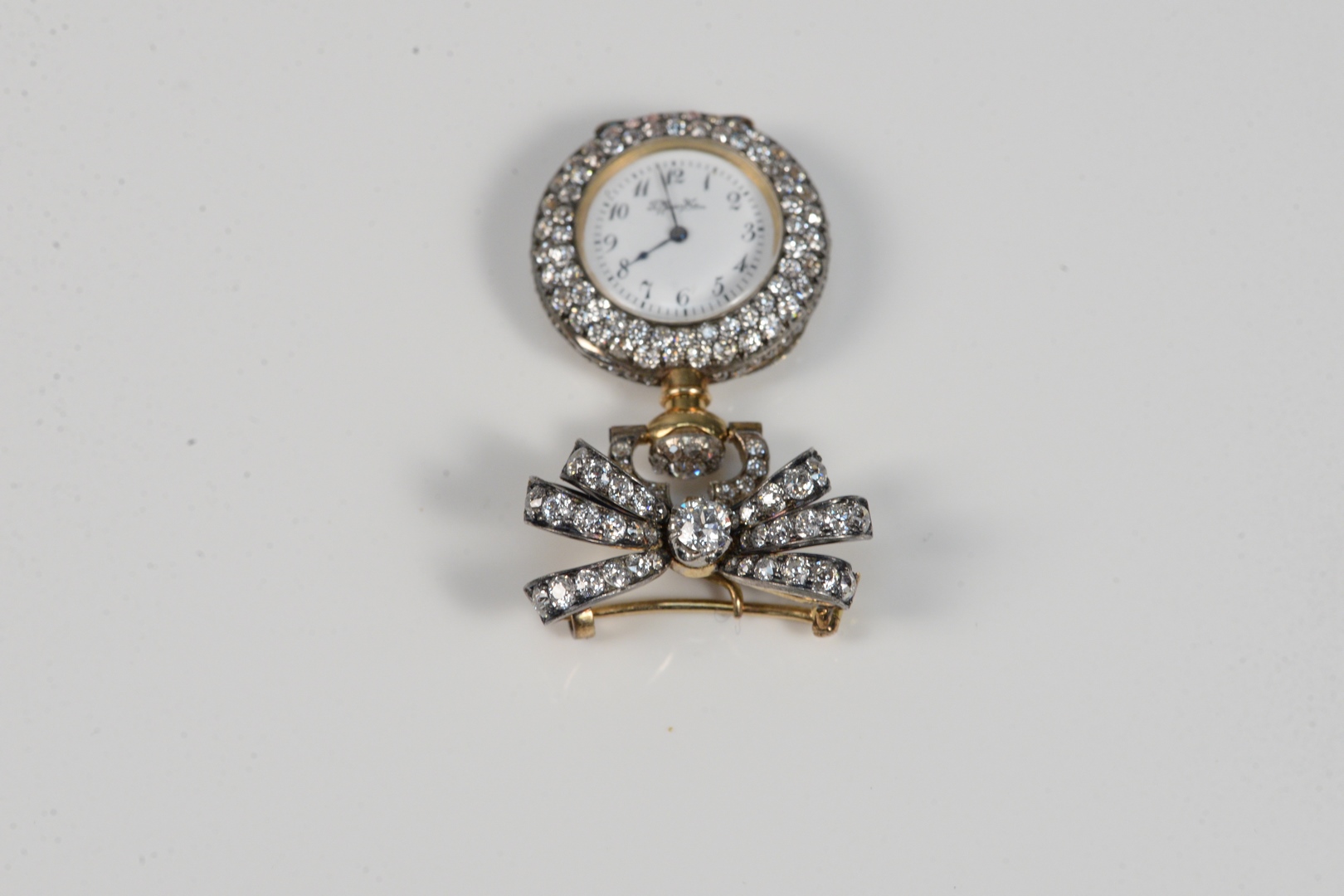 Lot 83: Tiffany & Company 18 Karat Yellow Gold and Diamond Open Face Lapel Watch case pave set with Old European cut diamonds, white Arabic …