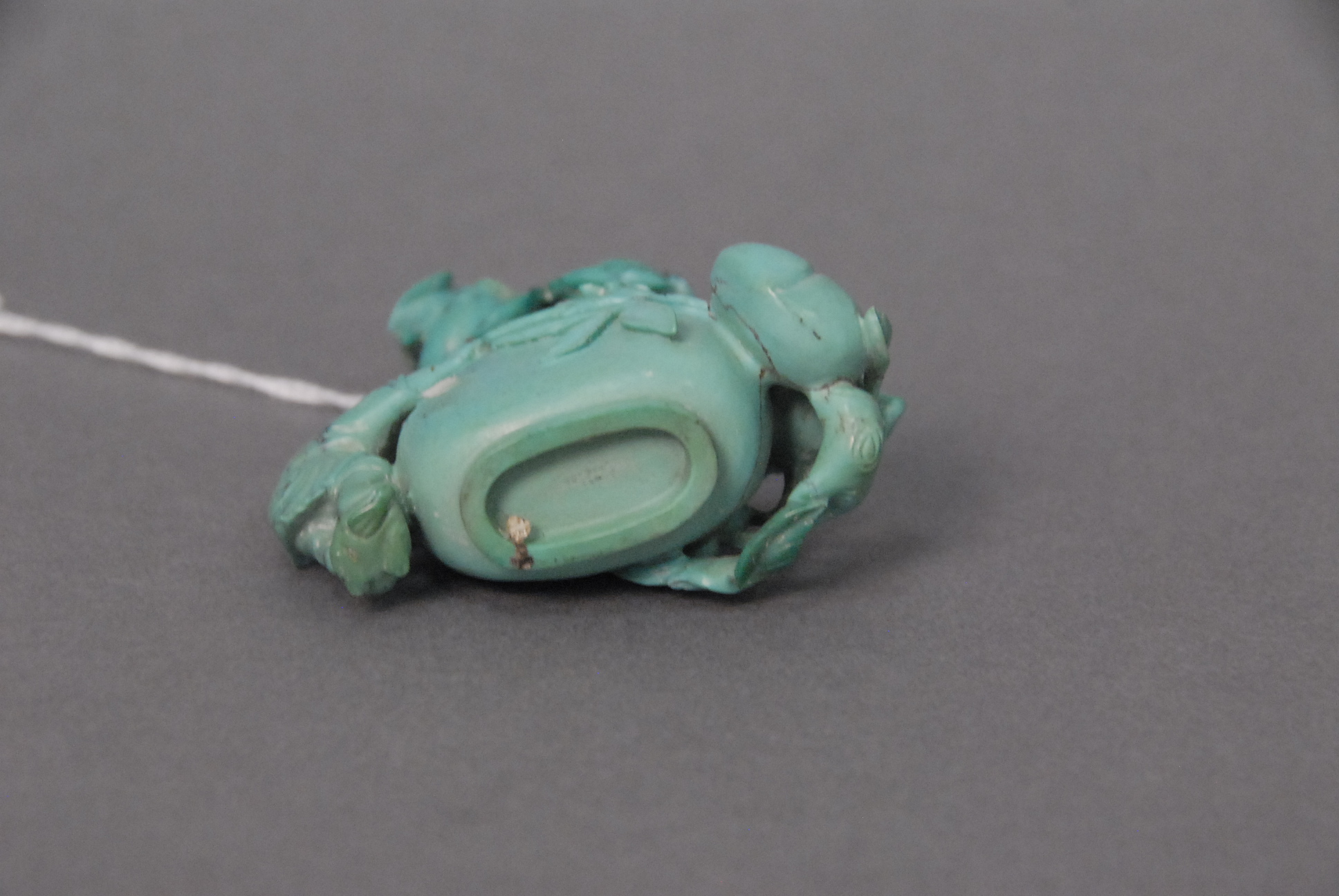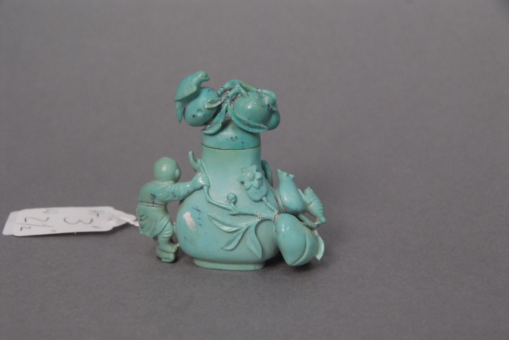 Lot 83: Turquoise snuff bottle, carved in high relief with a boy on a toad holding on by a bat, and having carved large fruit and vines, ori…