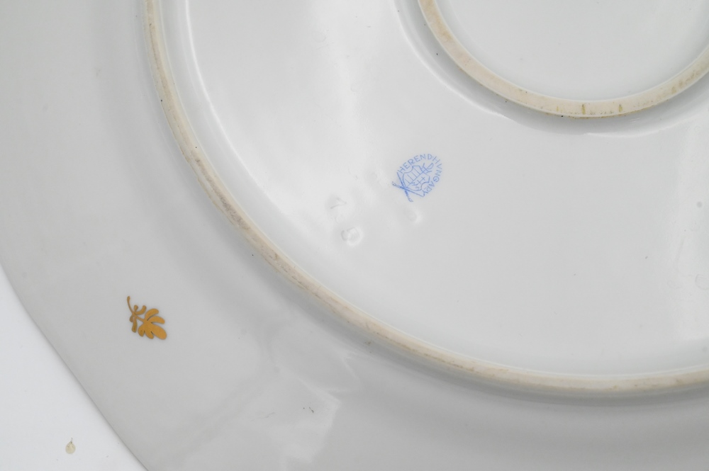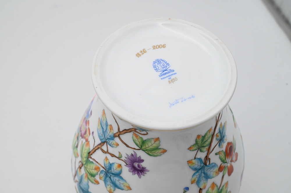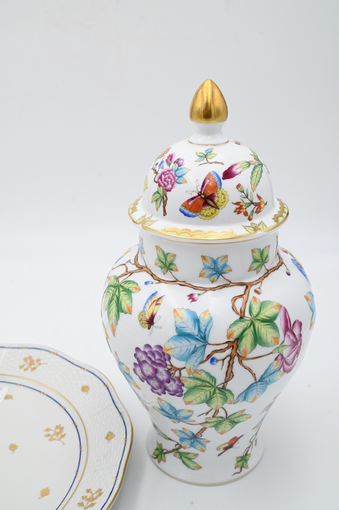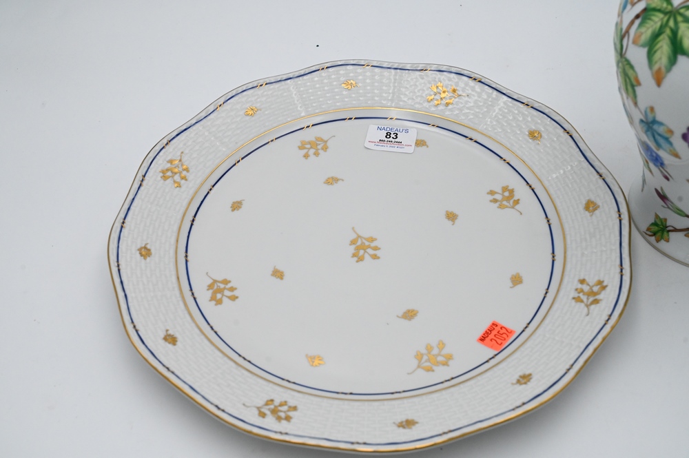 Lot 83: Two Herend Porcelain Pieces, to include covered urn or jar, having blossoming flowers butterflies and leaves along with a large charger, marked for Herend on the bottom, height 13 1/2 inches, charger diameter 13 3/4 inches.