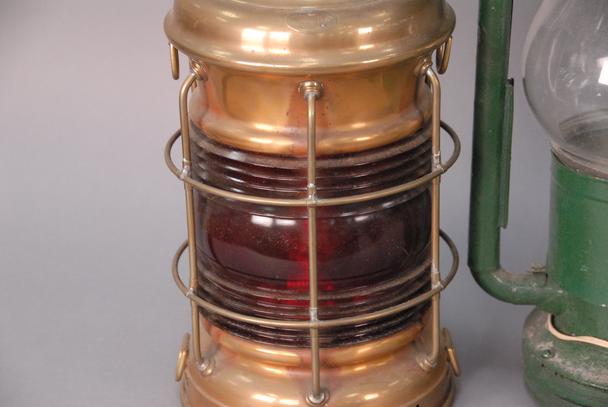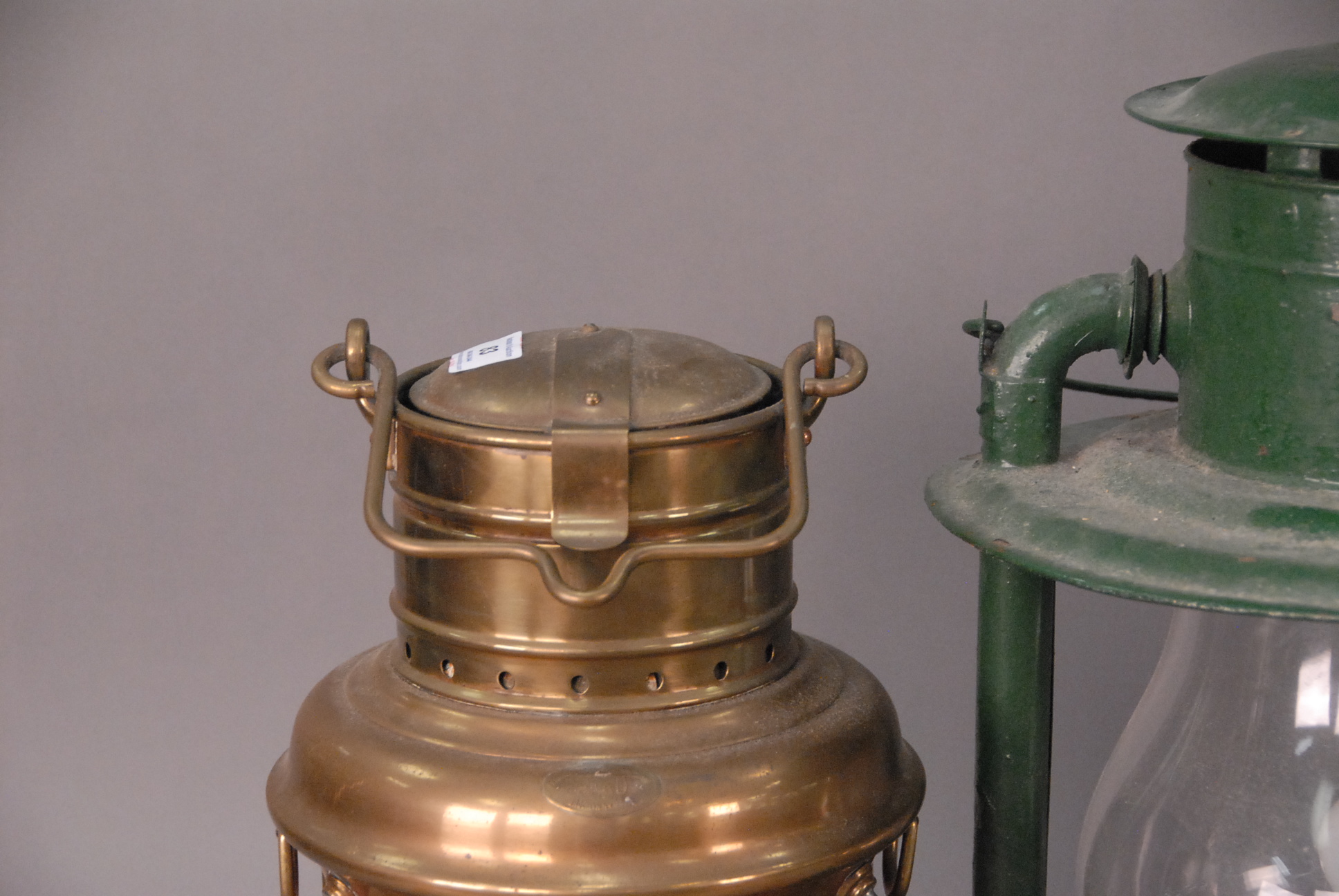 Lot 83: Two large nautical ship’s lanterns, one brass by Perkins marine lamp Perko Brooklyn and the other green painted copper.