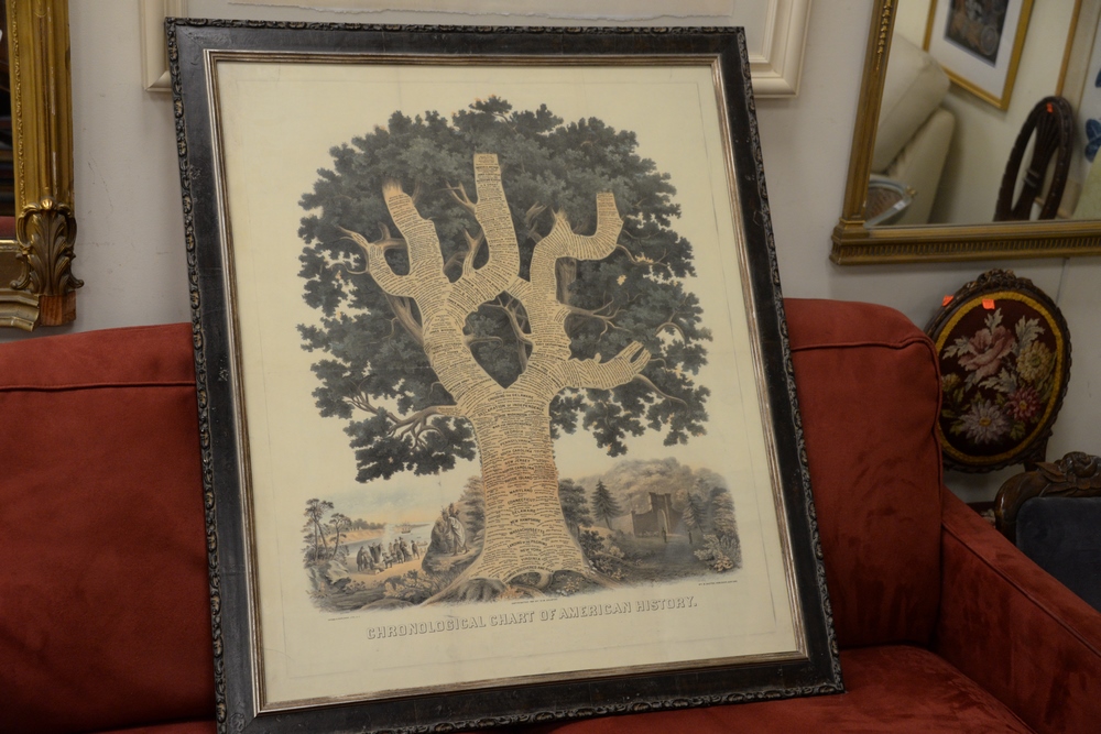 Two piece lot to include an After Basilius Besler (German, 1561-1629), “Pfeudofy Comorus” , oversized digital botanical print, sheet size 45 1/2″ x 30 1/2″, along with after Neuman & Dinglinger “Chronological chart of American history”, oversized framed digital print, Provenance: David and Cynthia Kim, 22 Stoney Wylde Lane, Greenwich, Connecticut. View home by visiting: https://www.zillow.com/homedetails/22-Stoney-Wylde-Ln-Greenwich-CT-06830/177238281_zpid/.