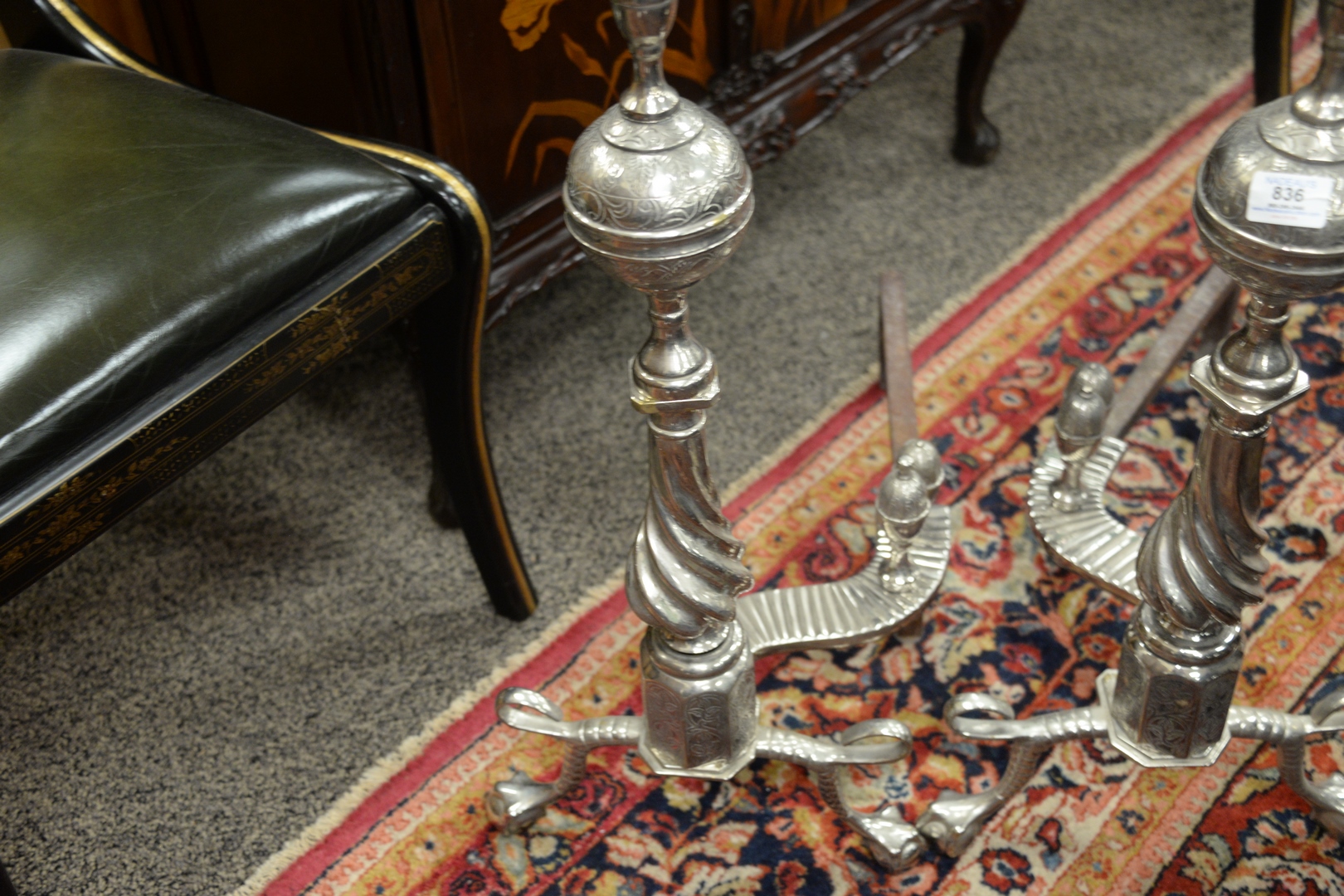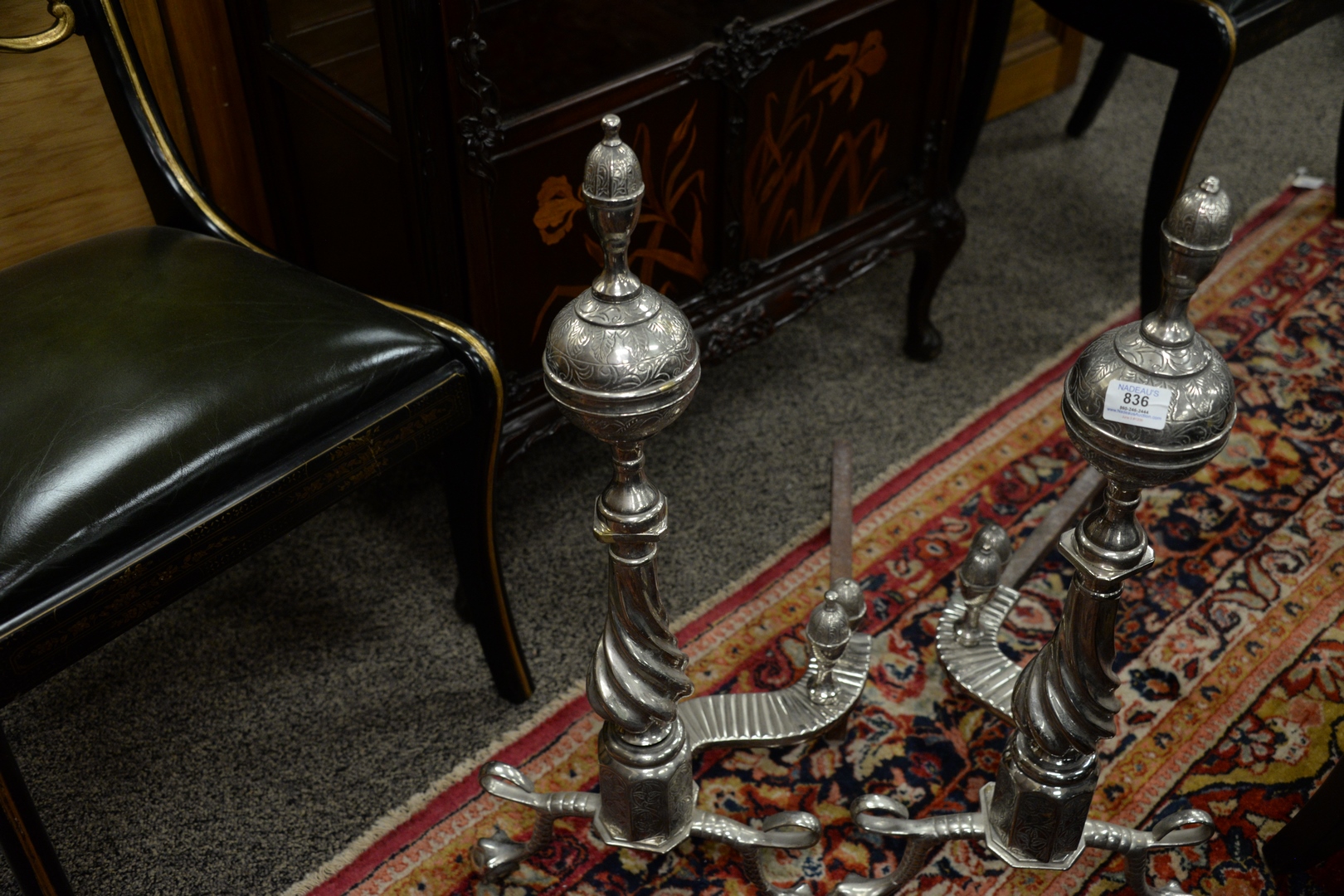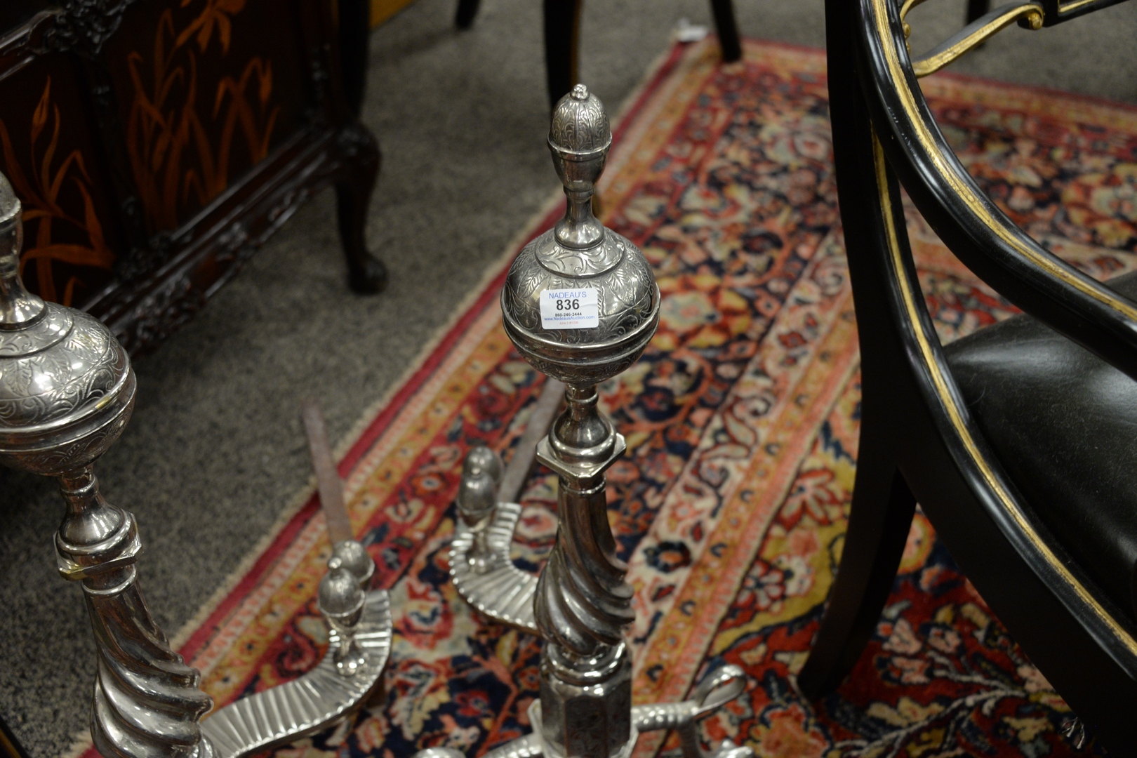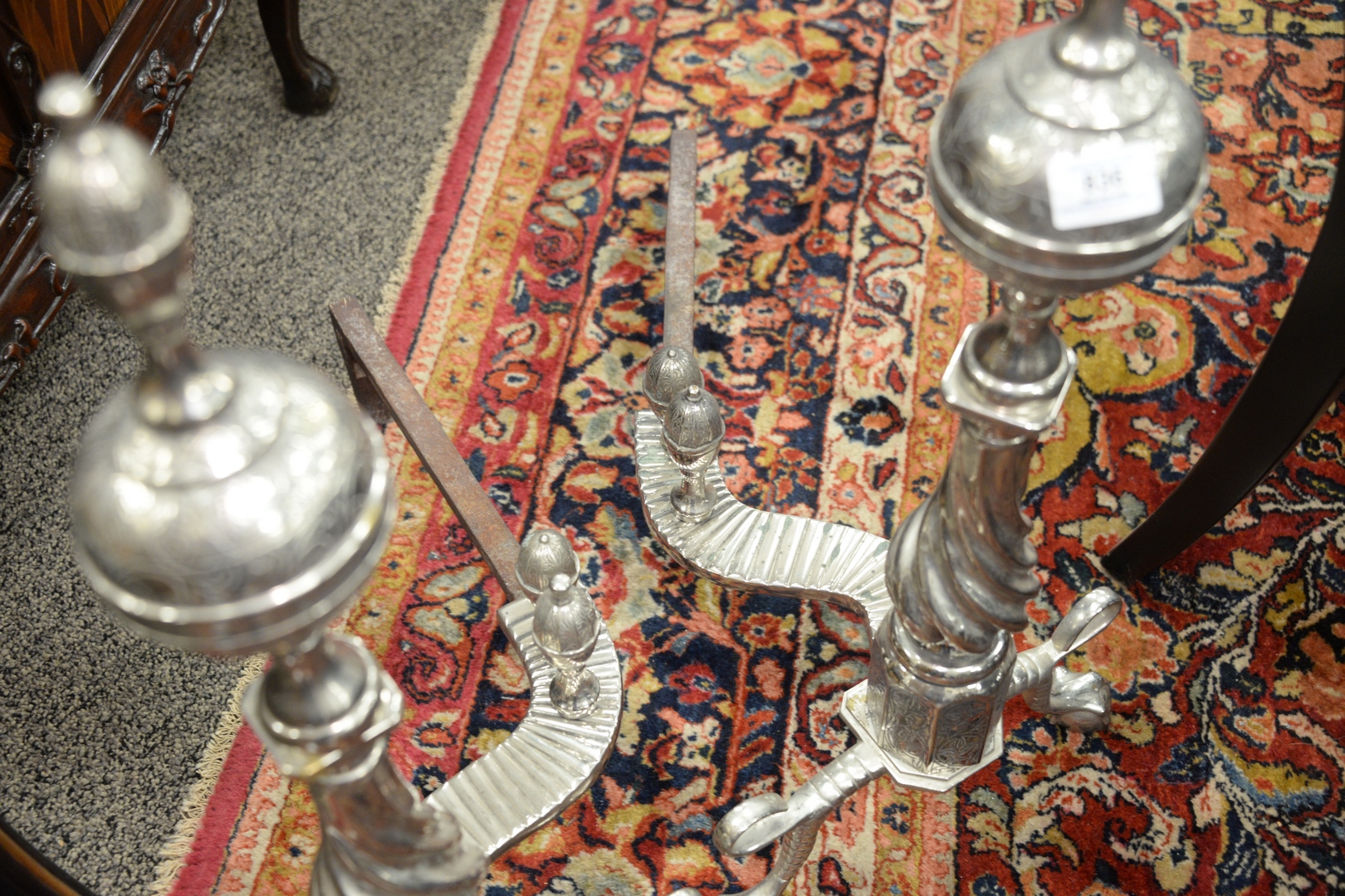 Pair of Silvered Tall Andirons, having log stops, height 30 inches.