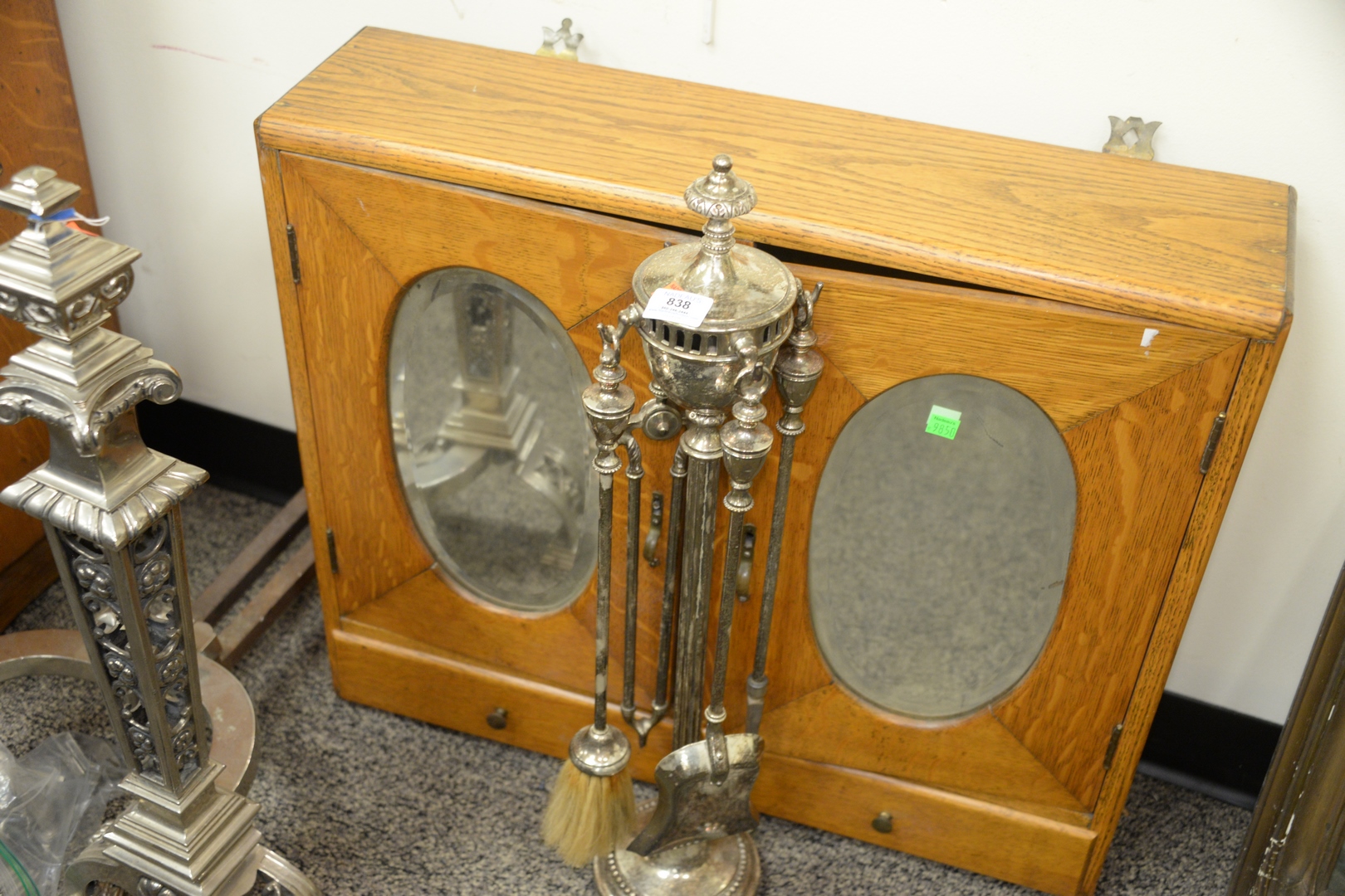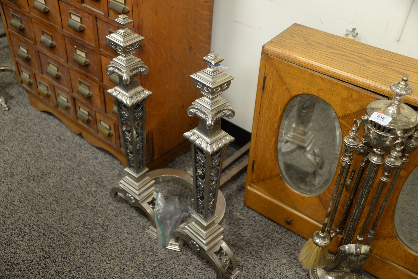 Lot 838: Pair of Tall Silvered Andirons, having log stops, height 28 inches.