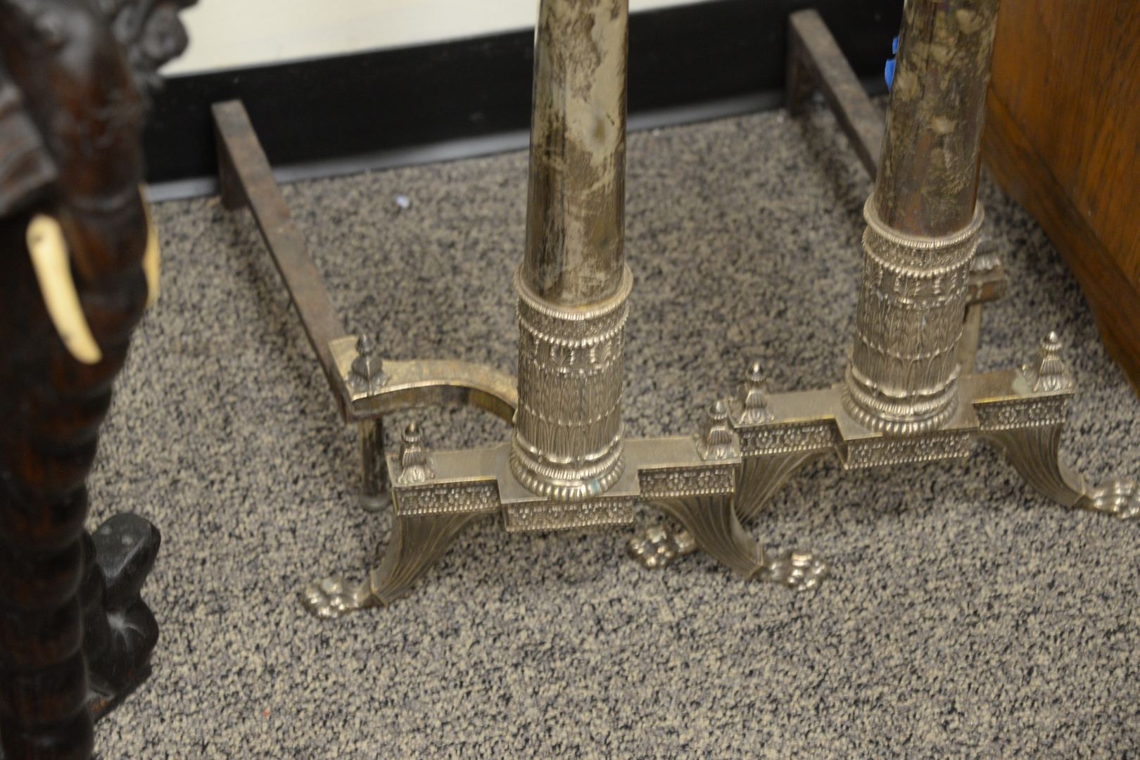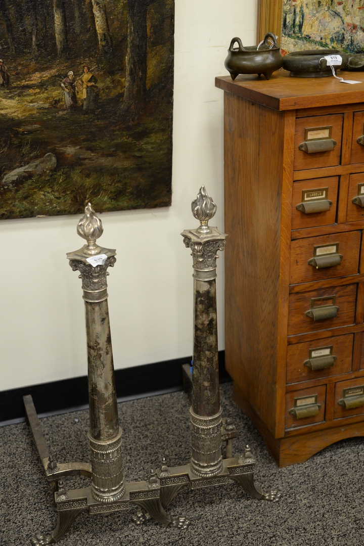 Pair of Tall Silvered Andirons, having flame finials, height 30 inches.