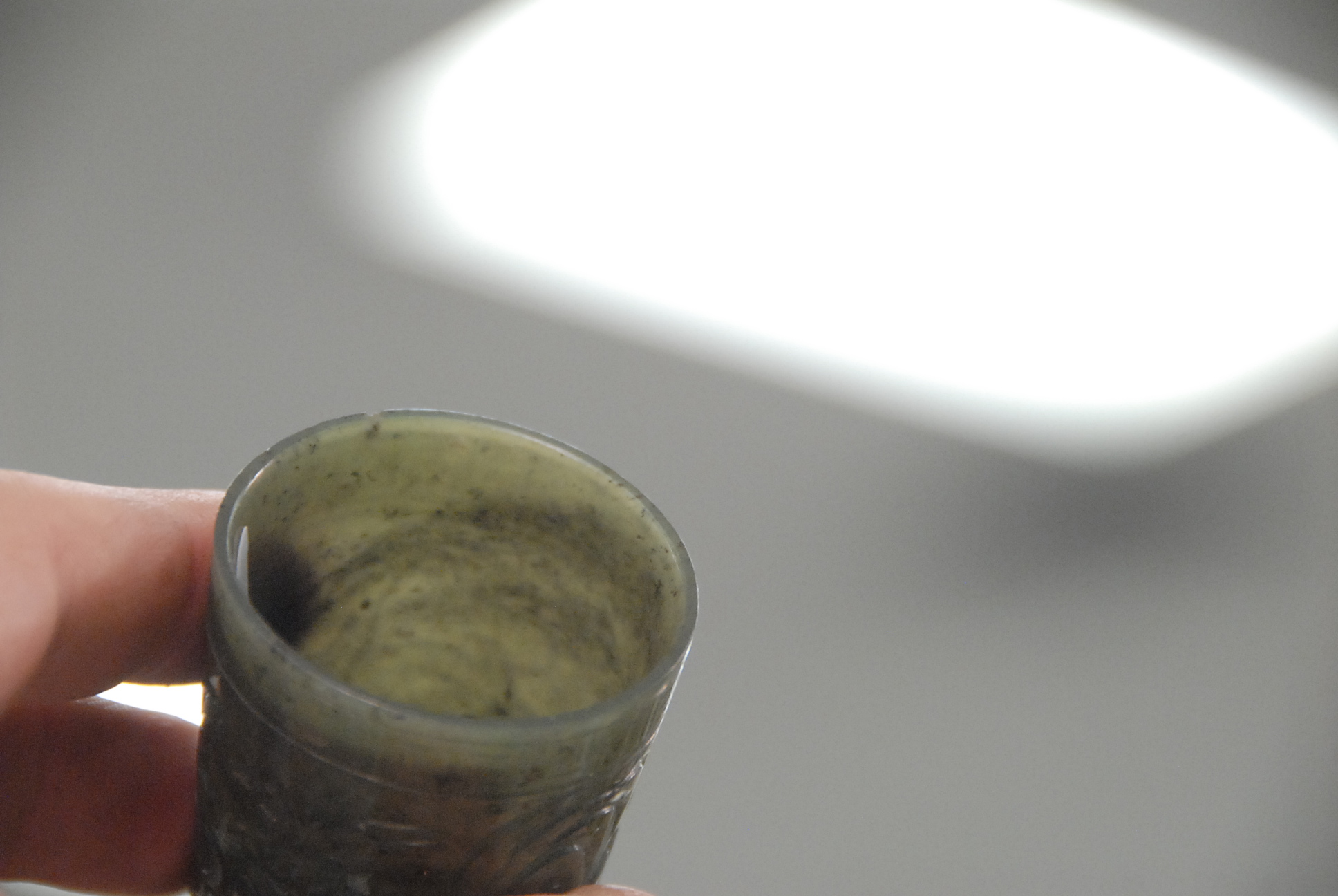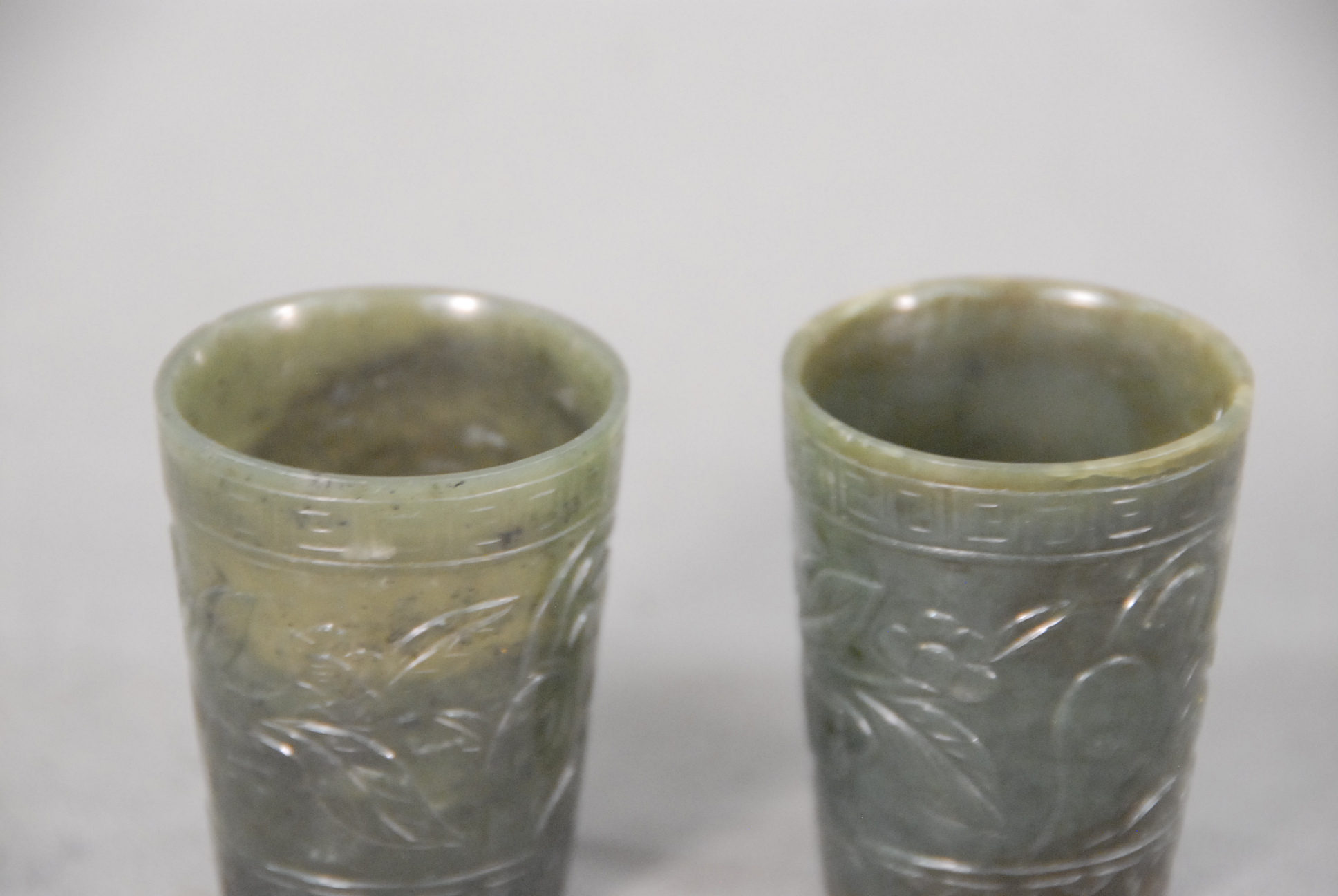 Pair of small spinach jade cups having incised sides of wild flowers.