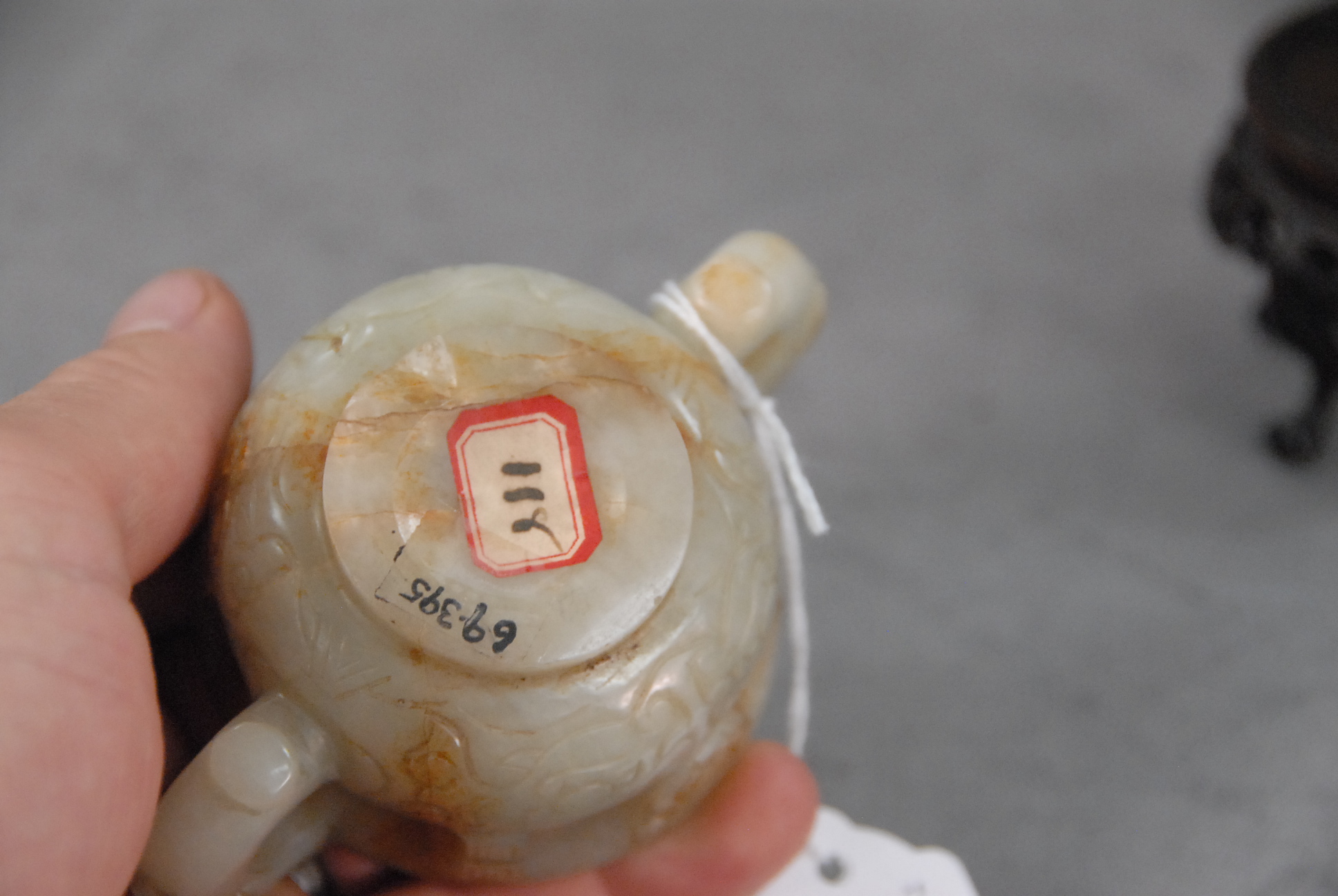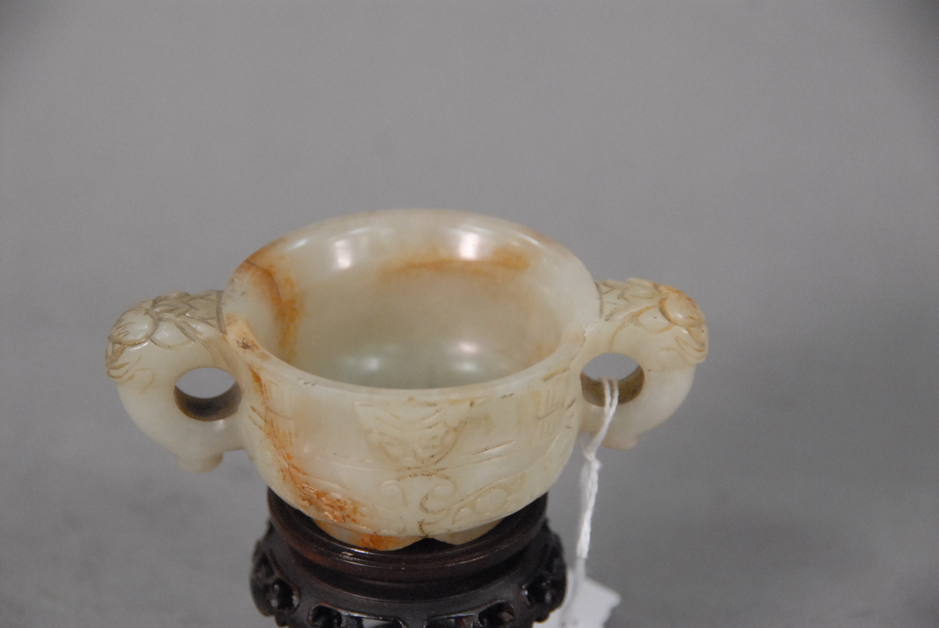 White jade two handled cup having an overall white with russet incised sides and handles having foo dog heads. small chip on rim