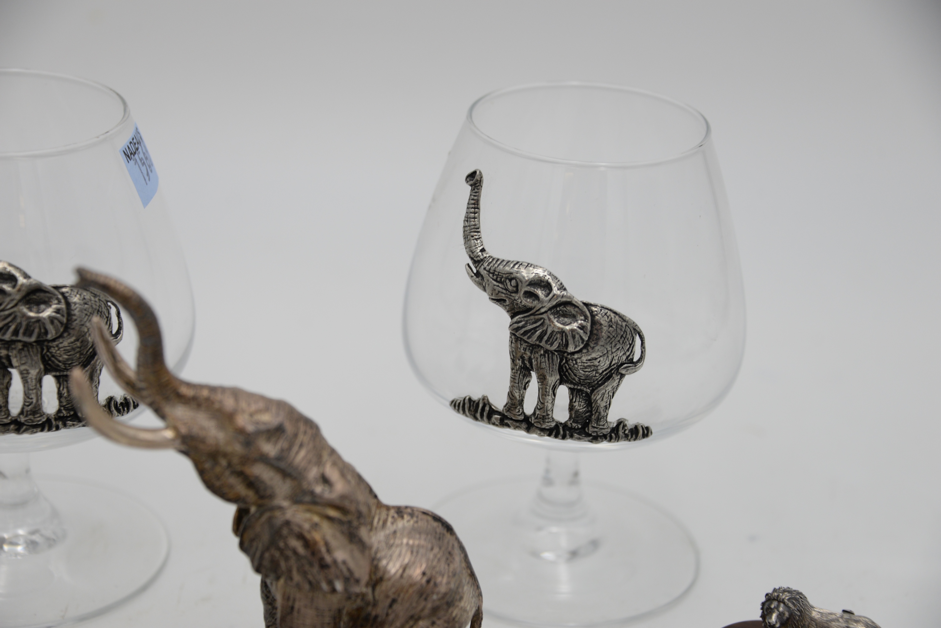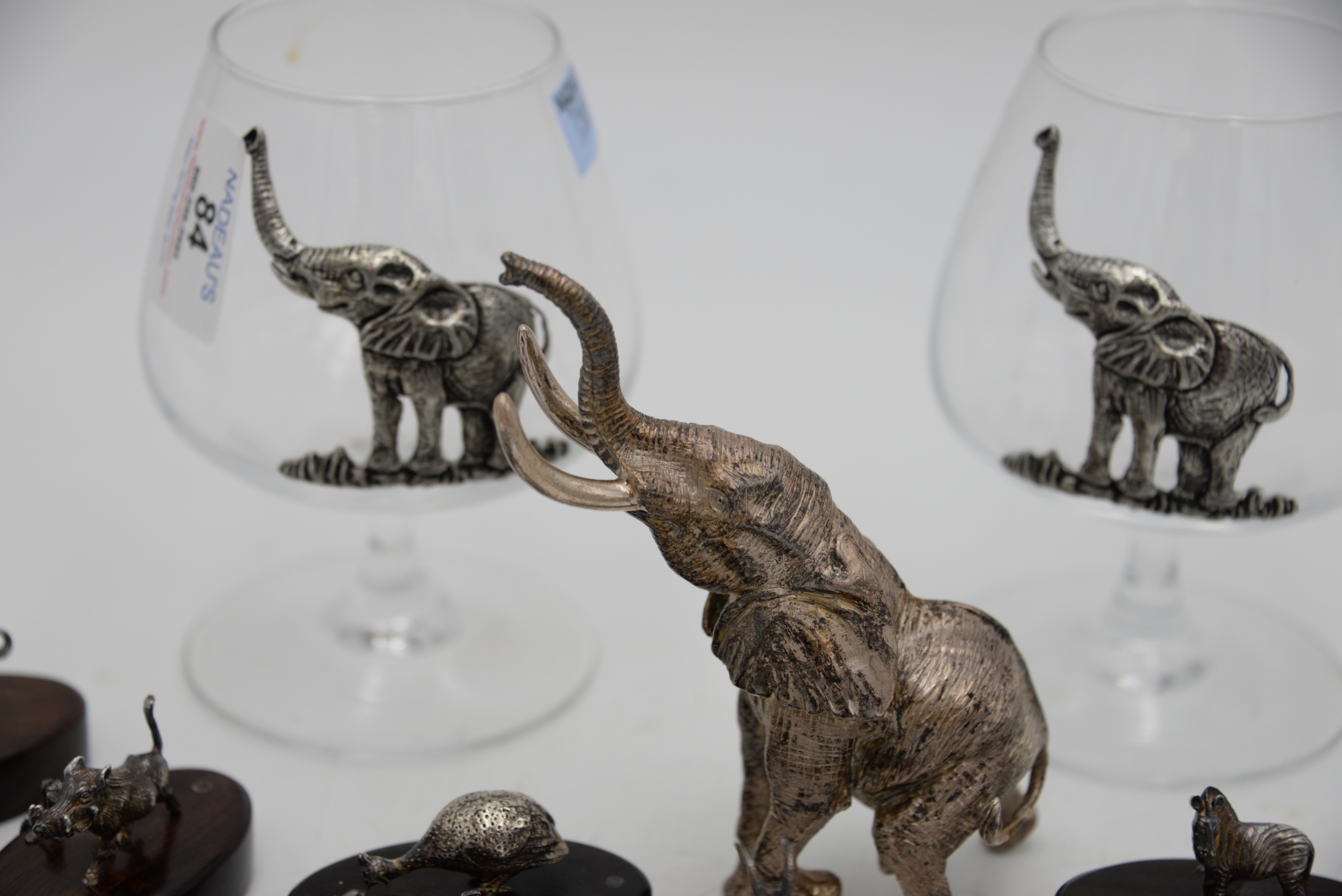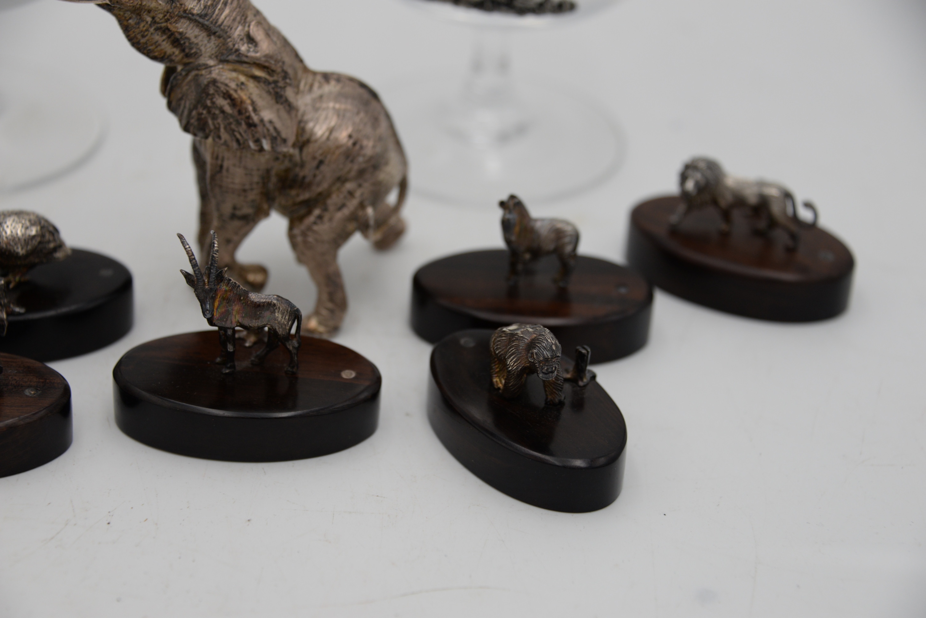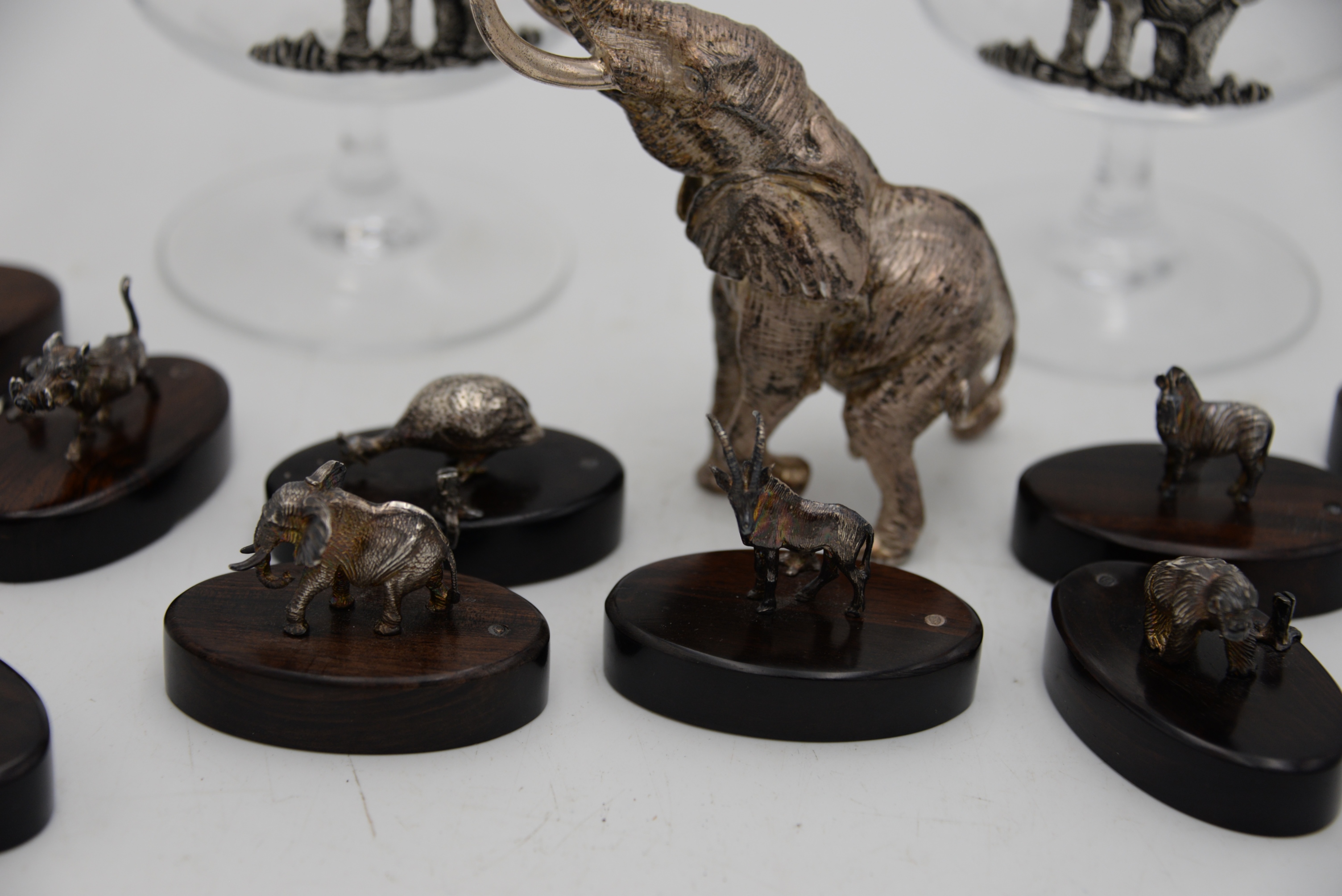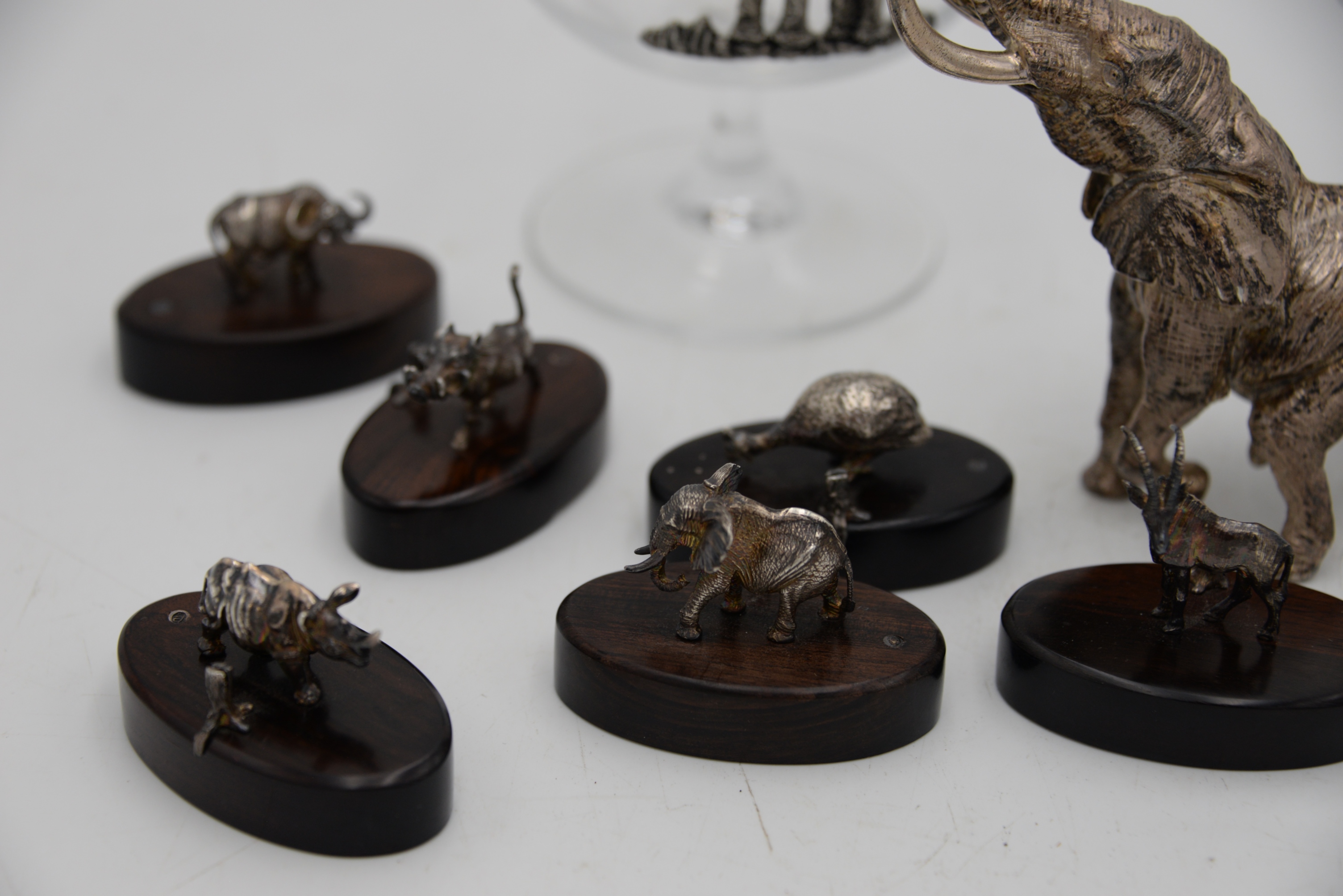 10 Piece Patrick Mavros (Zimbabwe) Sterling Silver Animal Lot, to include 9 place card holders on polished ebony wood bases, handcast inset with silver rounded stamped mark, height 1 1/2 inches, width 2 1/2 inches, depth 1 1/2 inches; two Makoulpa elephant brandy glasses, height 5 inches, diameter 4 1/2 inches, along with an elephant “Dande” sculpture, in sterling silver by Patrick Mavros, reaching bull elephant, signed and titled, inset with silver round stamped “PM” and with Zimbabwe triangular standard mark, height 5 inches.