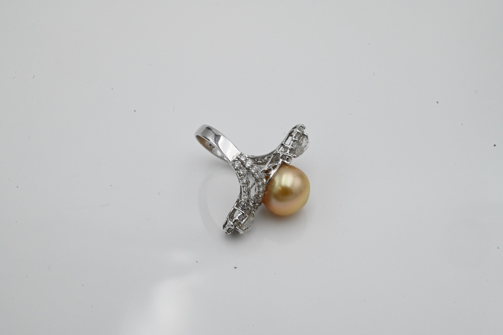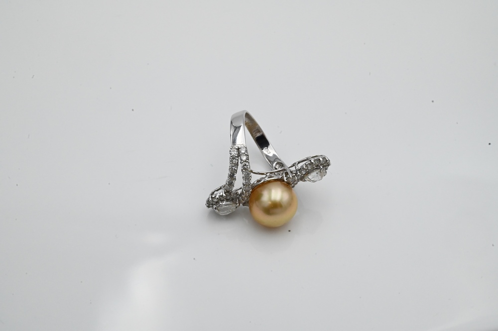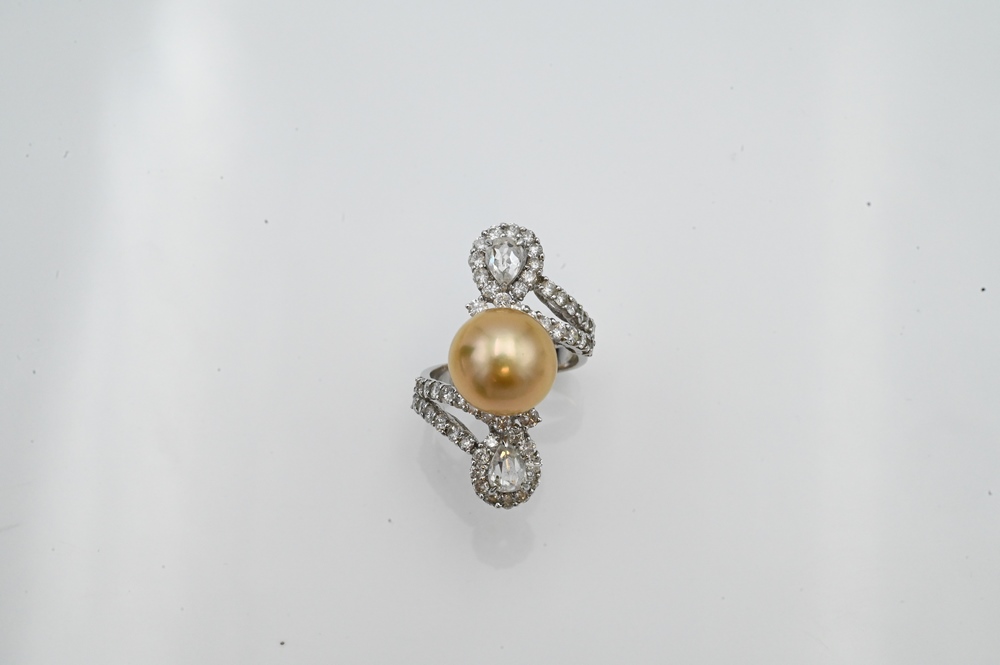 Lot 84: 18 Karat White Gold Ring, set with golden colored pearl having two pear shaped diamonds, along with round cut diamonds, size 6, 7.9 grams.