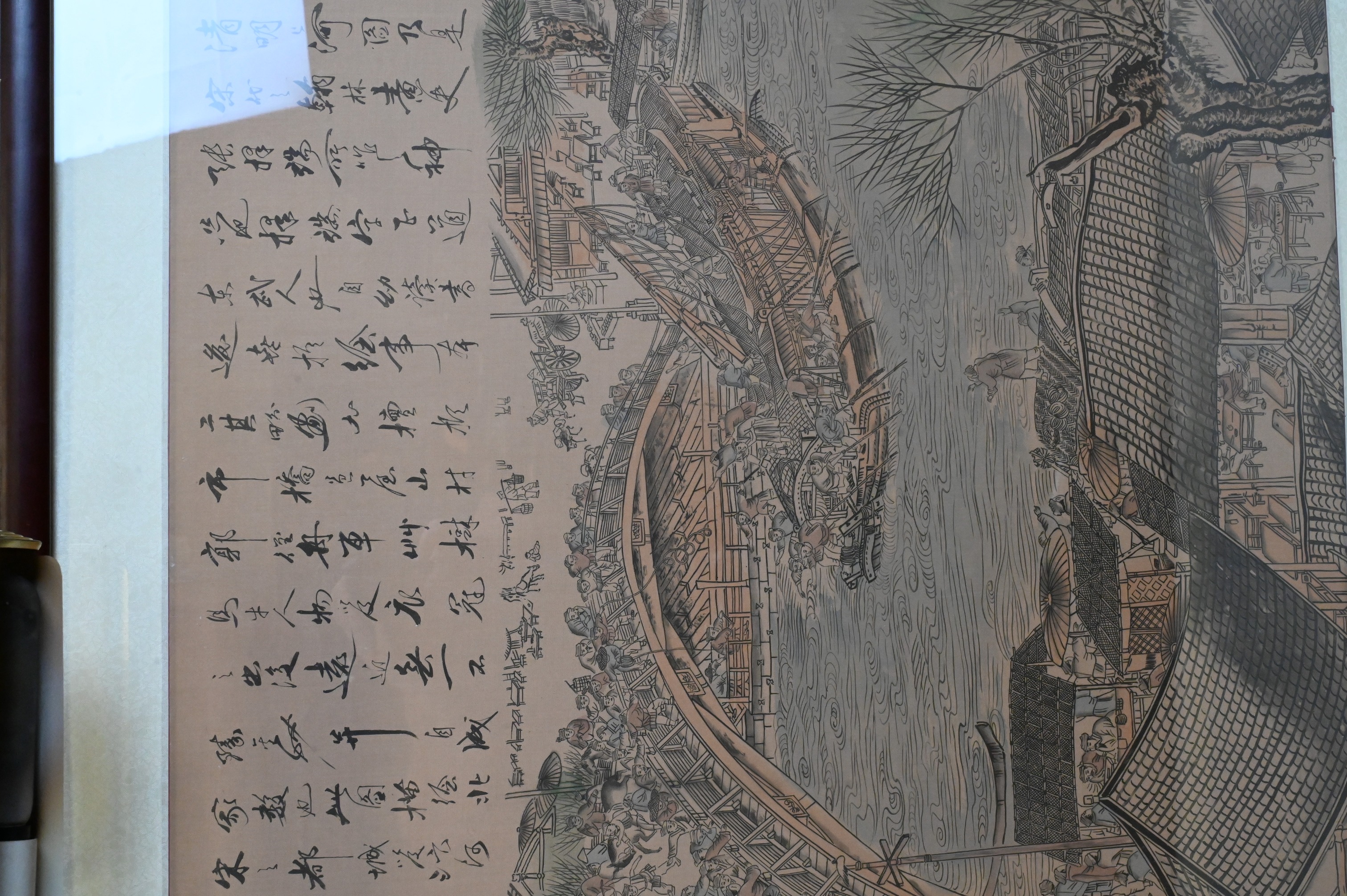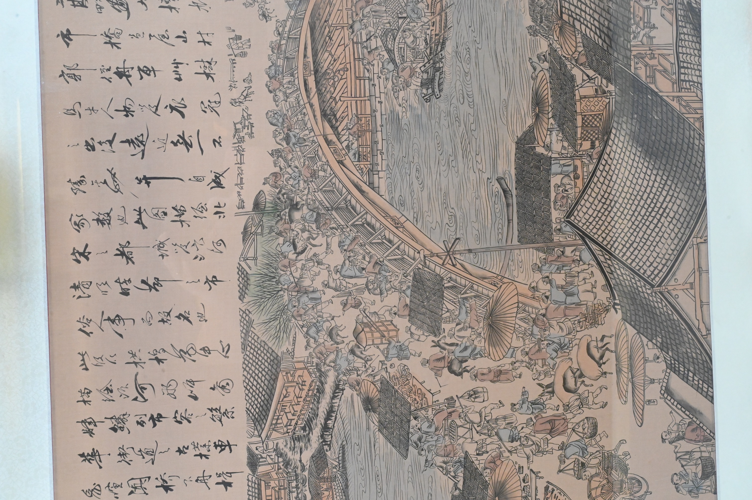 A large mounted silk scroll painting depicting bustling scenes of daily life along the river, after the celebrated Song dynasty handscroll Qingming Shanghe Tu (Along the River During the Qingming Festival). With extensive inscription and calligraphy above