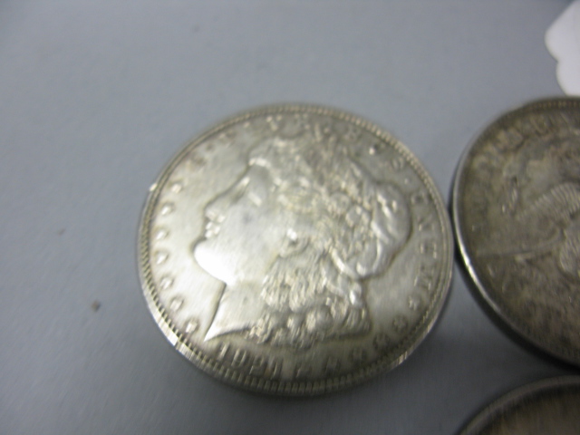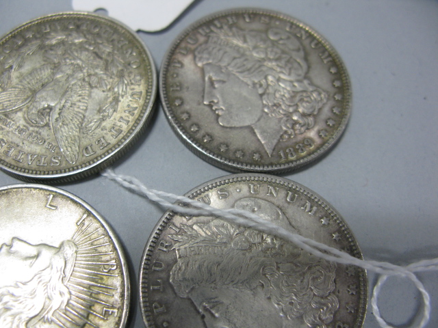 Coin lot of five silver dollars and a silver quarter.