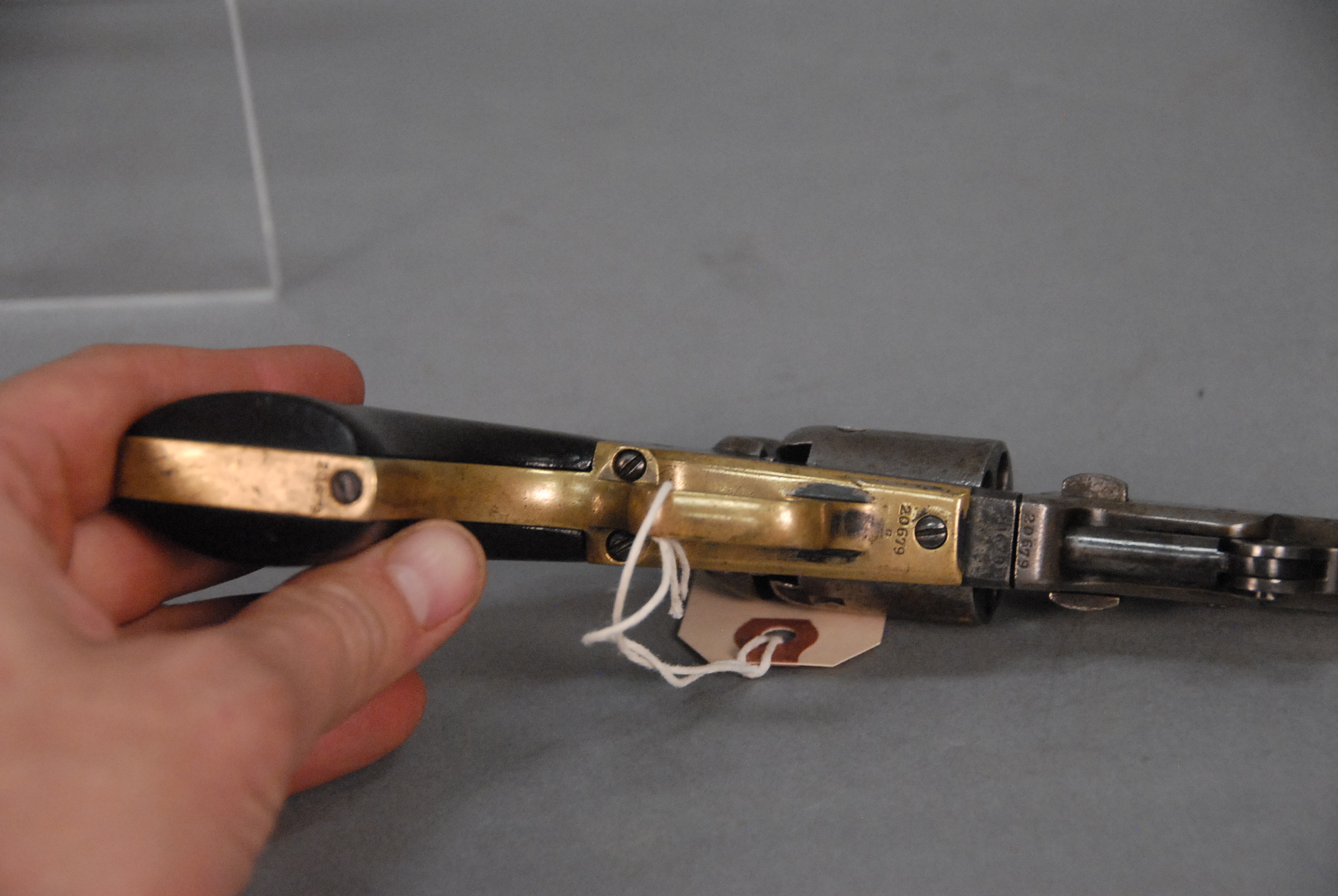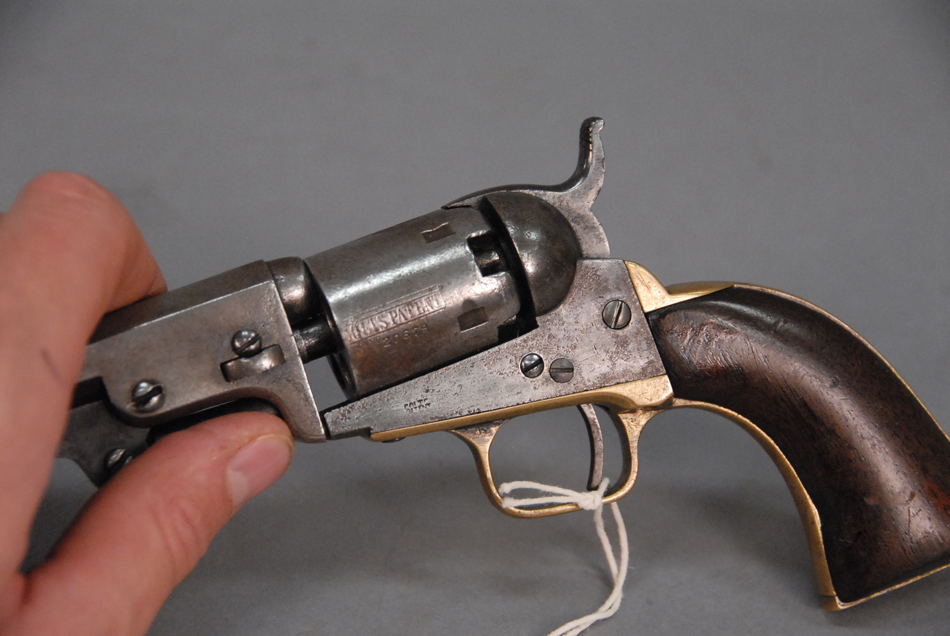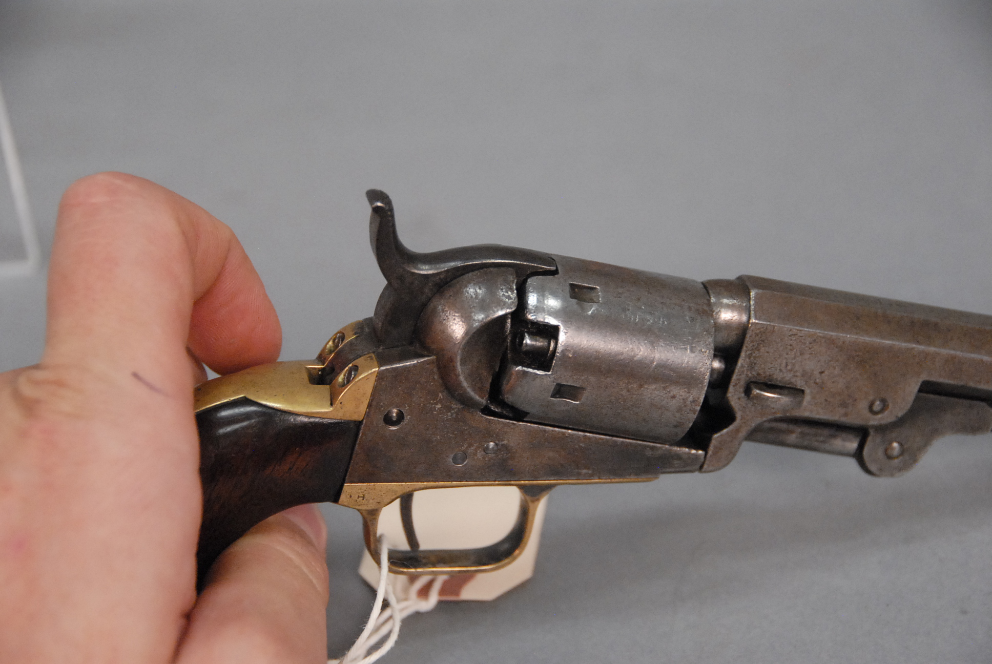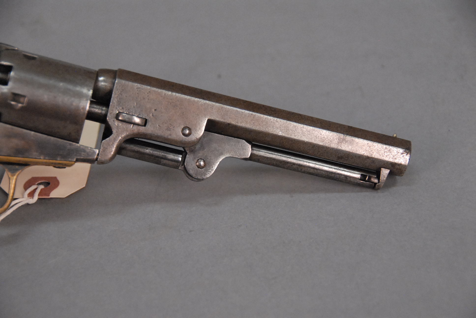 Lot 84: Colt model 1849 percussion pocket revolver, 5 octagon barrel, 5 shot cylinder with stagecoach scene, top of barrel marked Address…