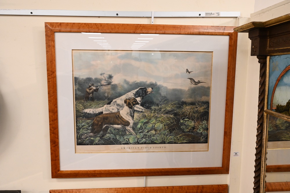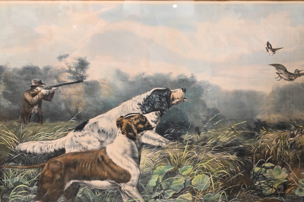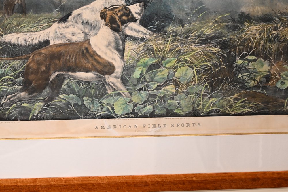 Lot 84: Currier and Ives after Arthur Fitzwilliam Tait “American Field Sport, 1857” lithograph with hand coloring on paper inscribed in plate throughout the lower margin image size 18 1/2 x 26 inches