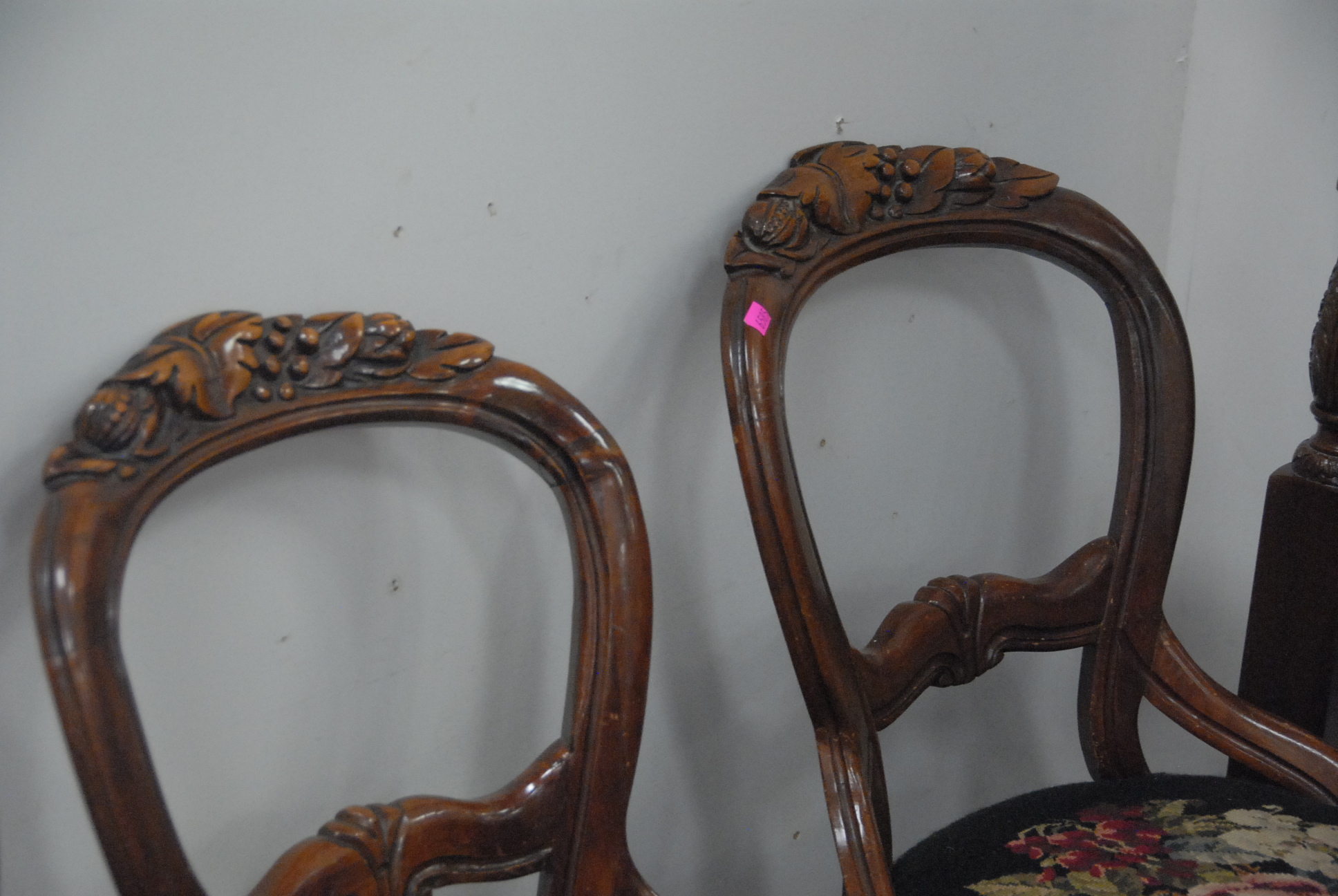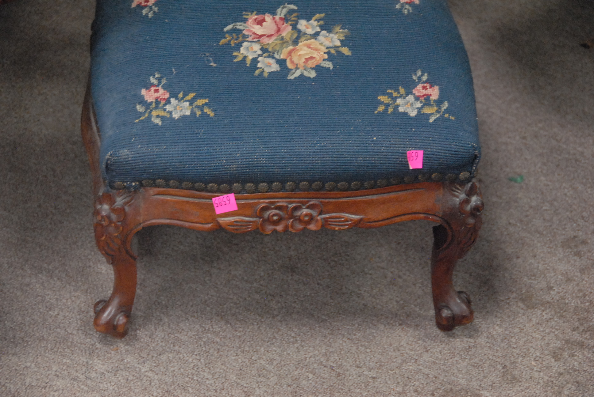 Lot 84: Five piece Victorian lot four Victorian side chairs with needlepoint seats and needlepoint foot stool.