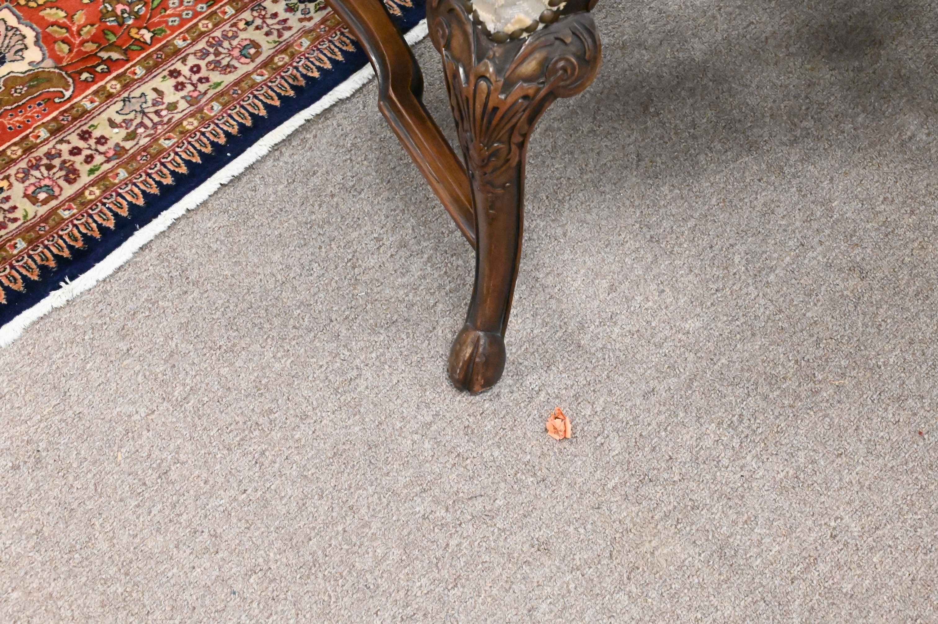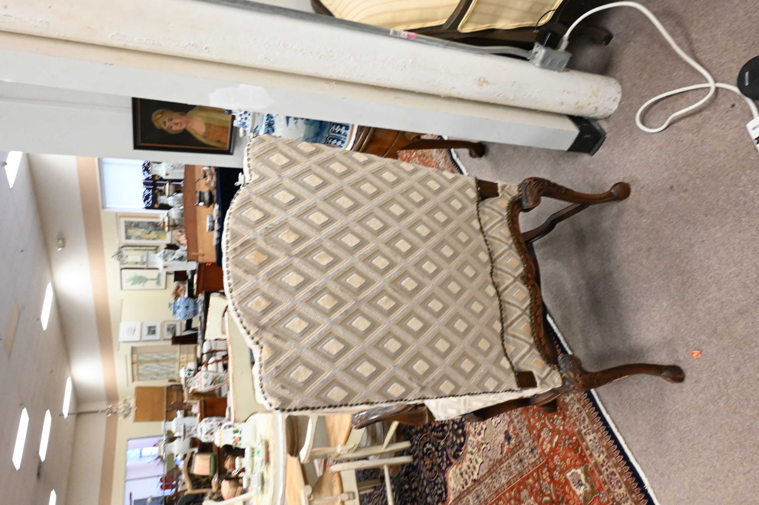 having custom upholstered and carved frame having stretcher base and hoof feet