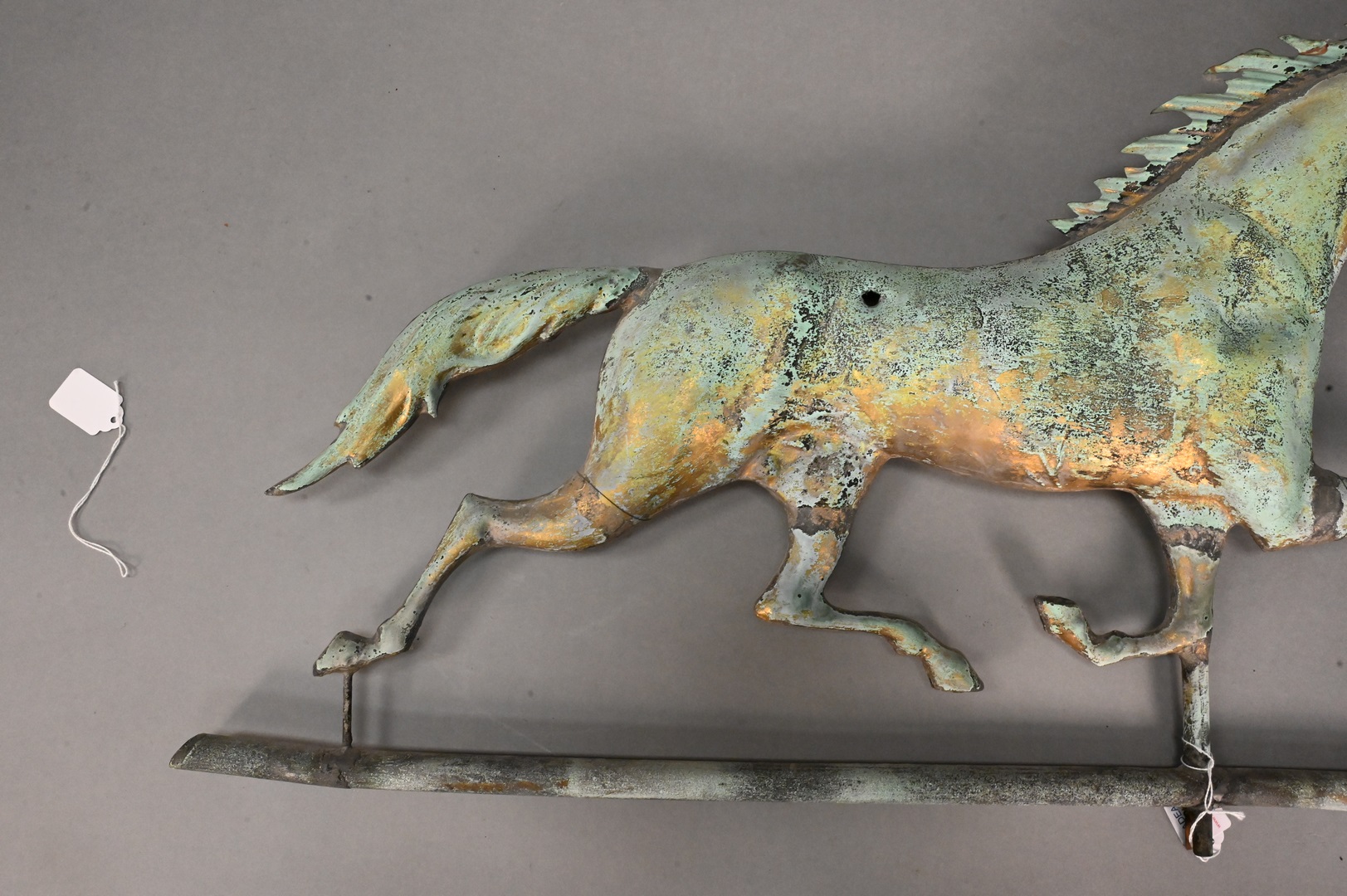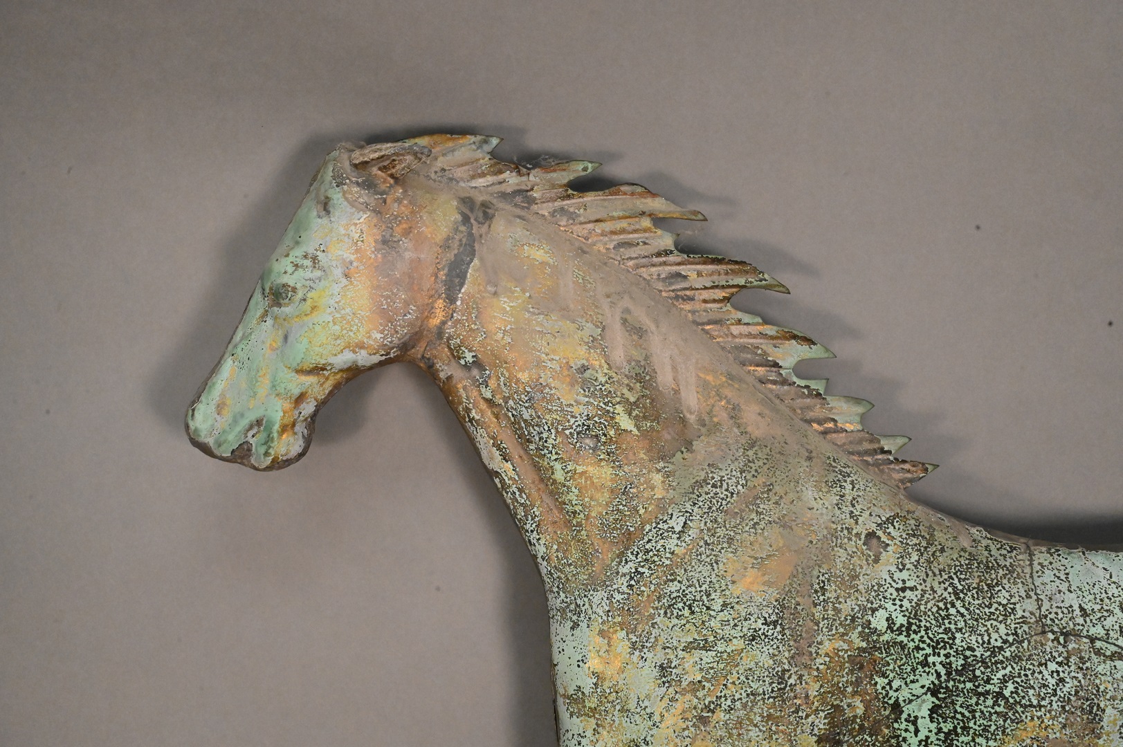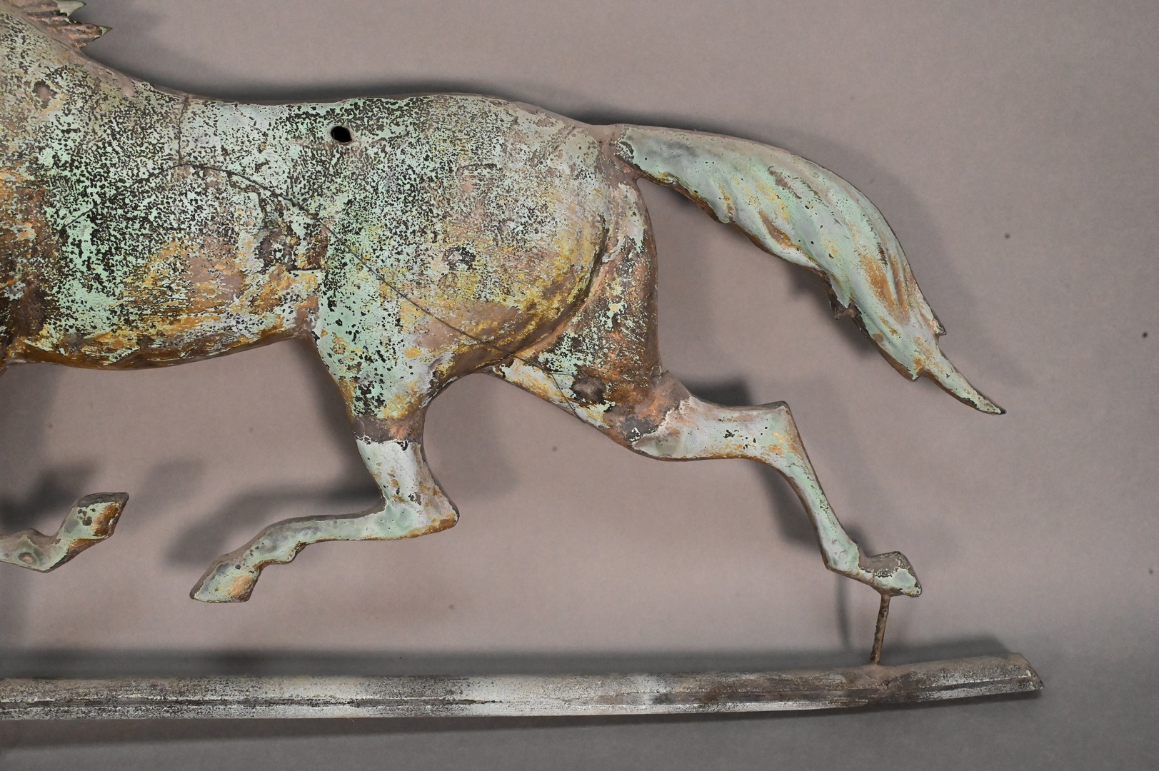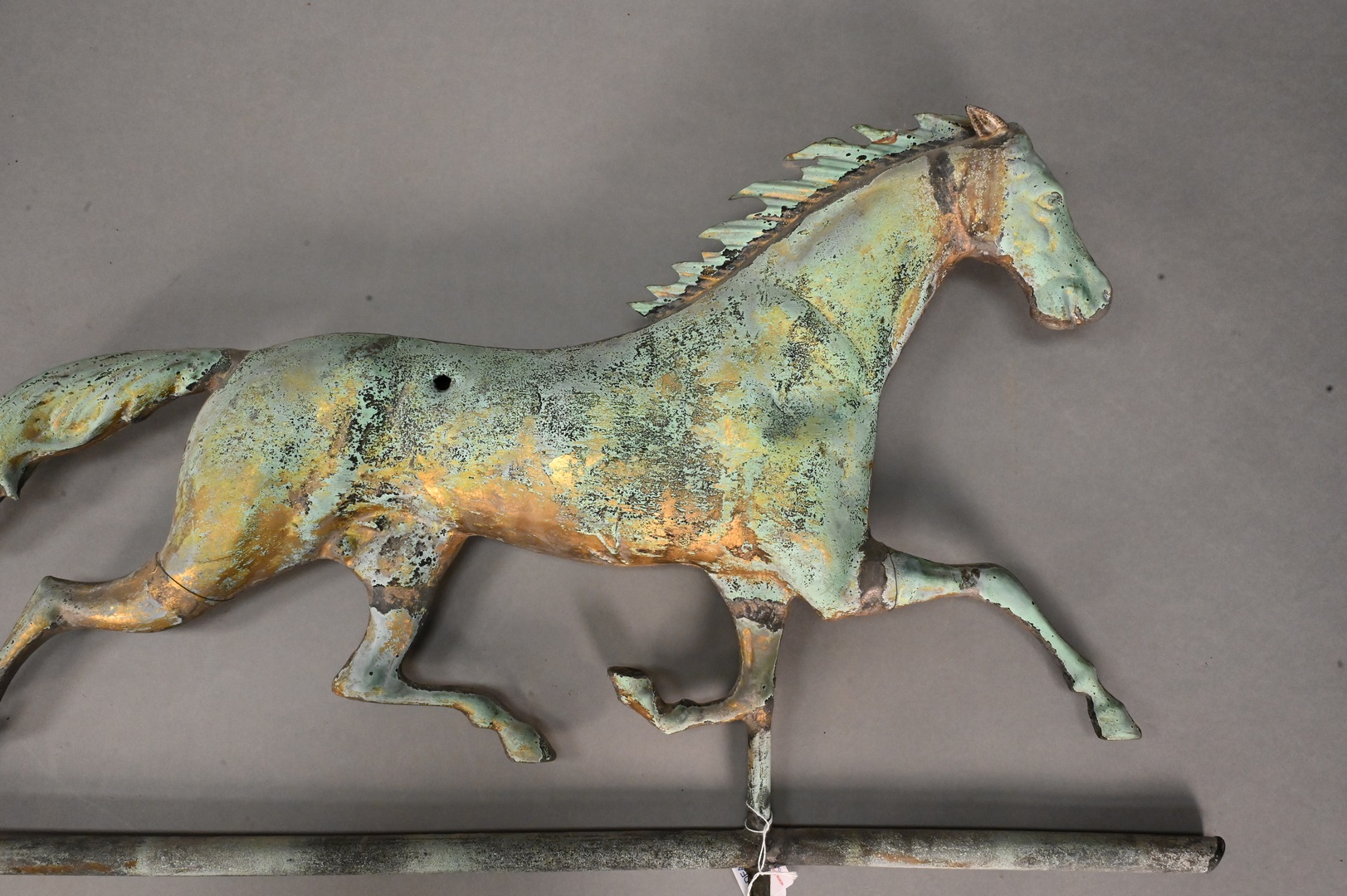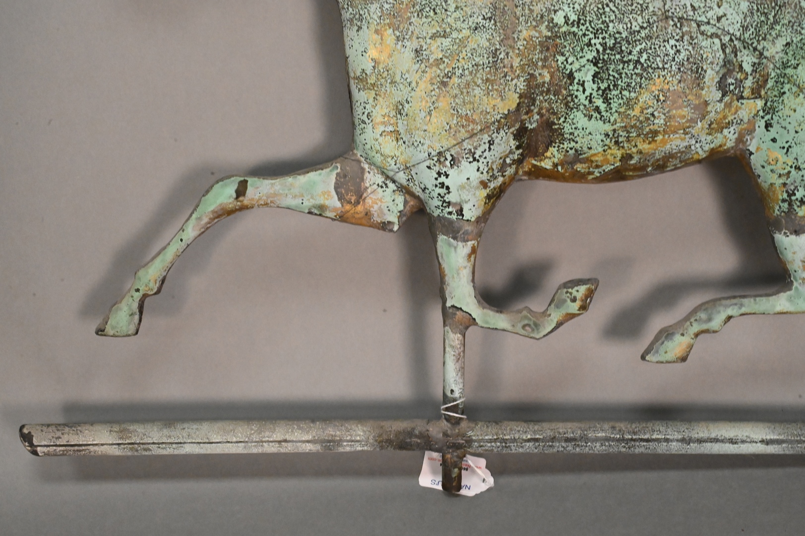 Full Bodied Copper Weathervane of Trotting Horse, in verdigris finish, retaining some original gold, along with directionals, East West is in two parts, one bullet hole, length 28 1/2 inches.