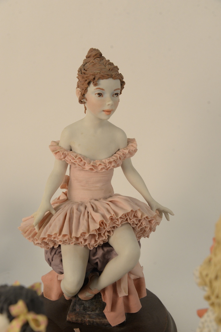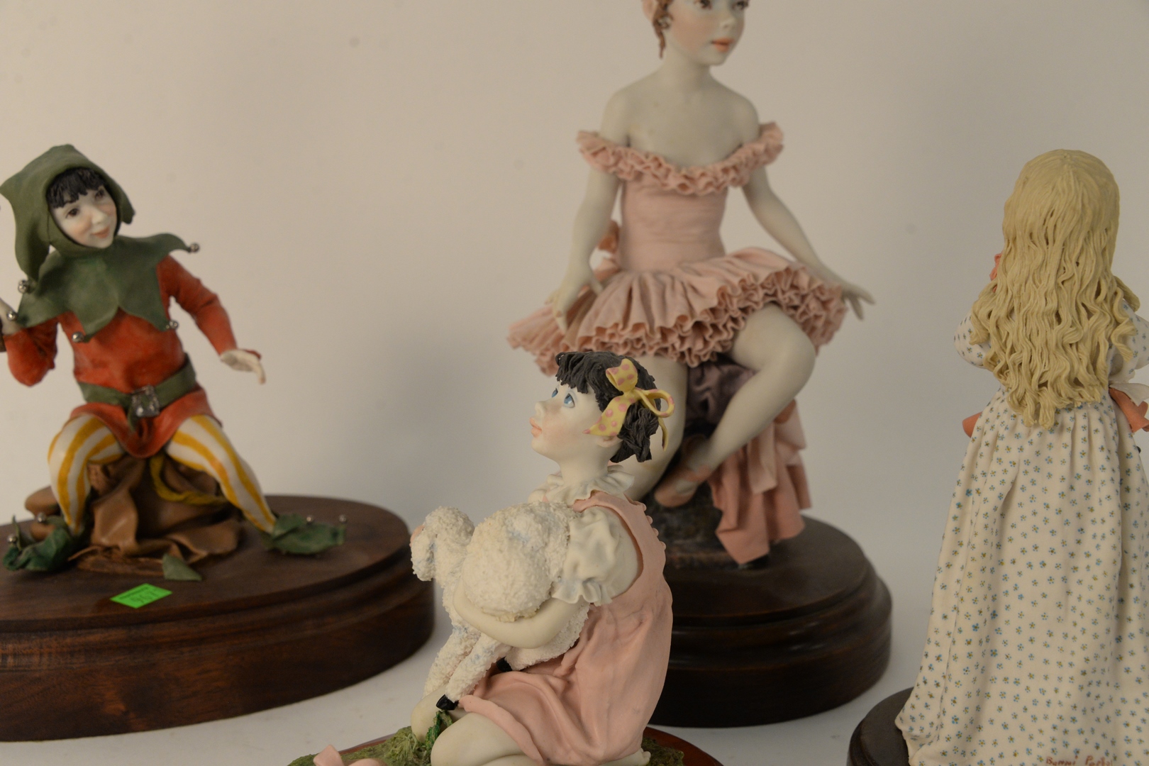 Group of Four Bonni Porter Porcelains, to include a ballerina; two little girls with a lamb; and a doll; along with a jester; three signed, (jester and ballerina with broken pieces), tallest 13 inches.