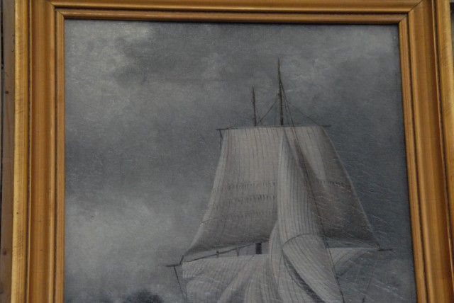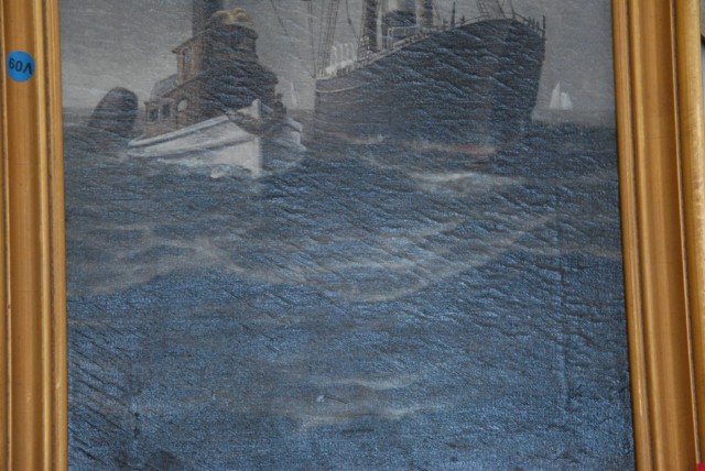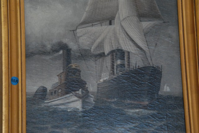 Oil on canvas of tugboat and steamship.