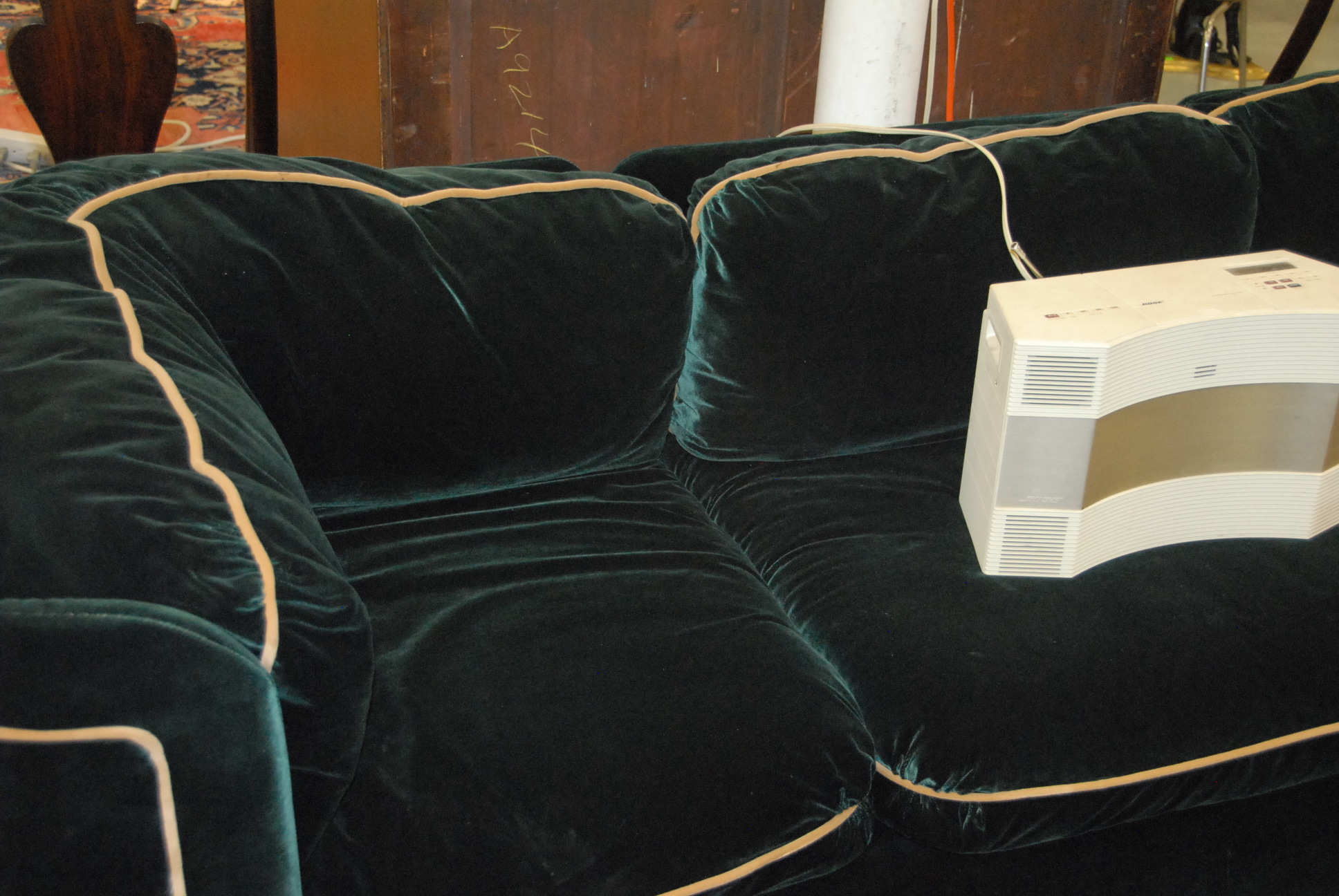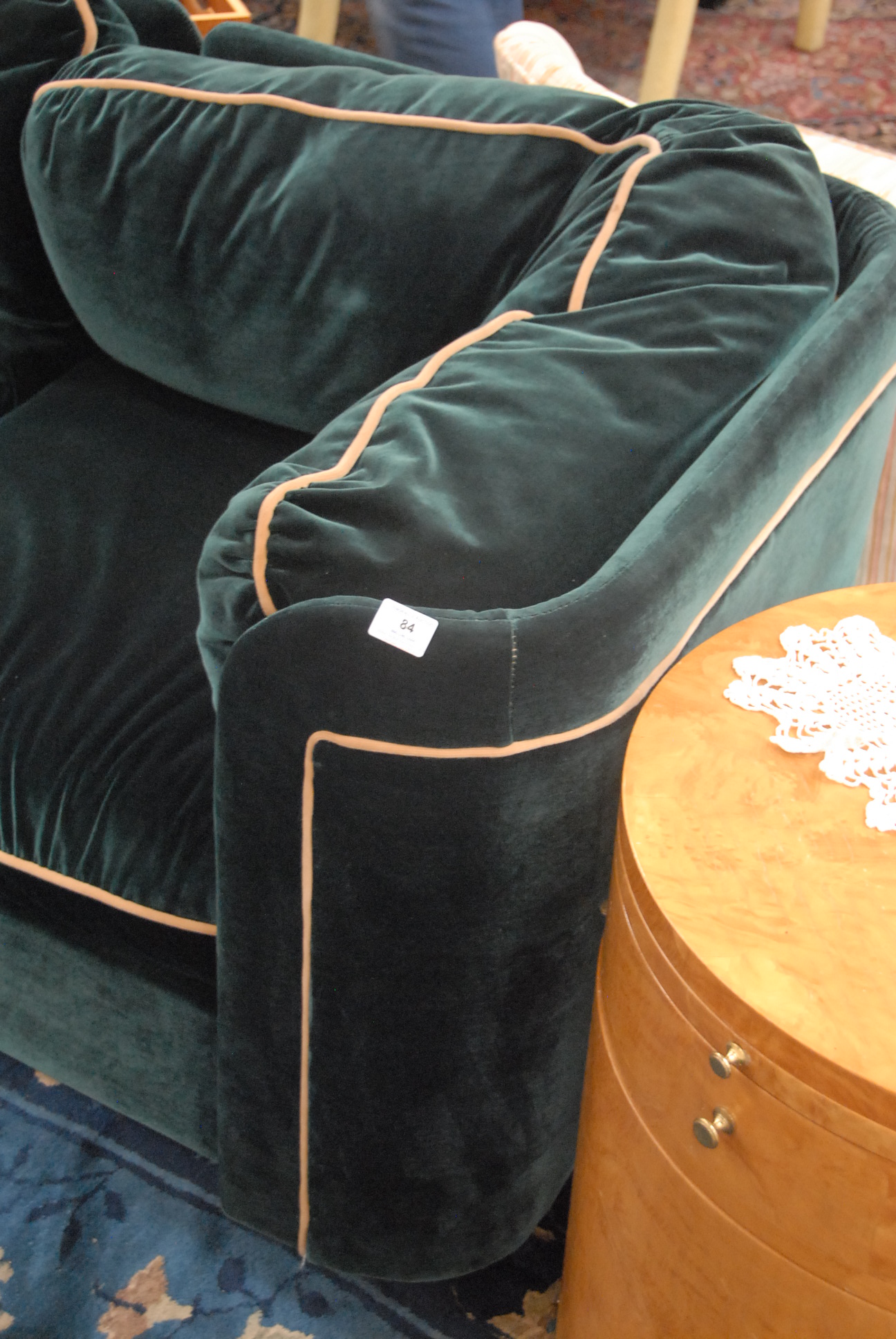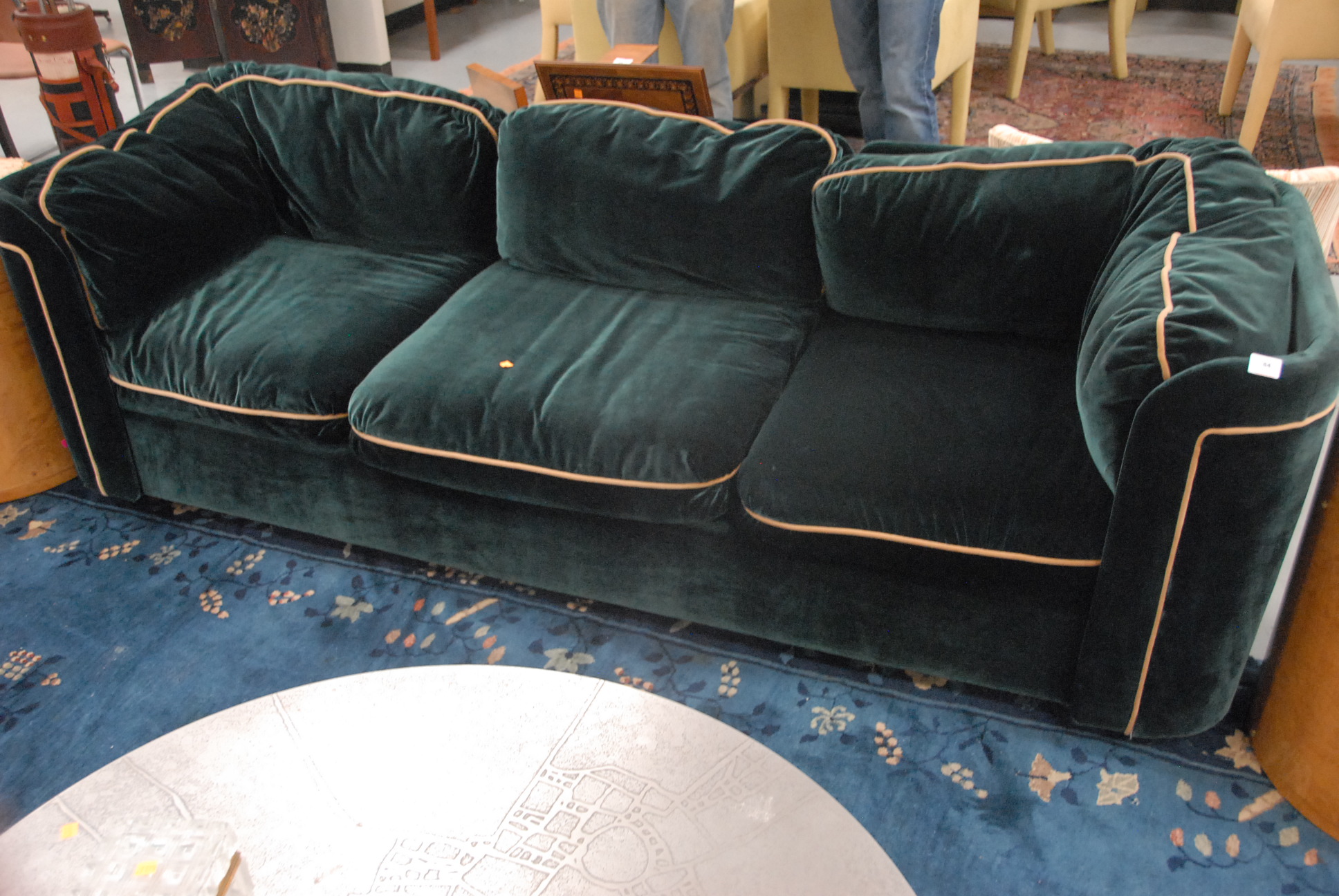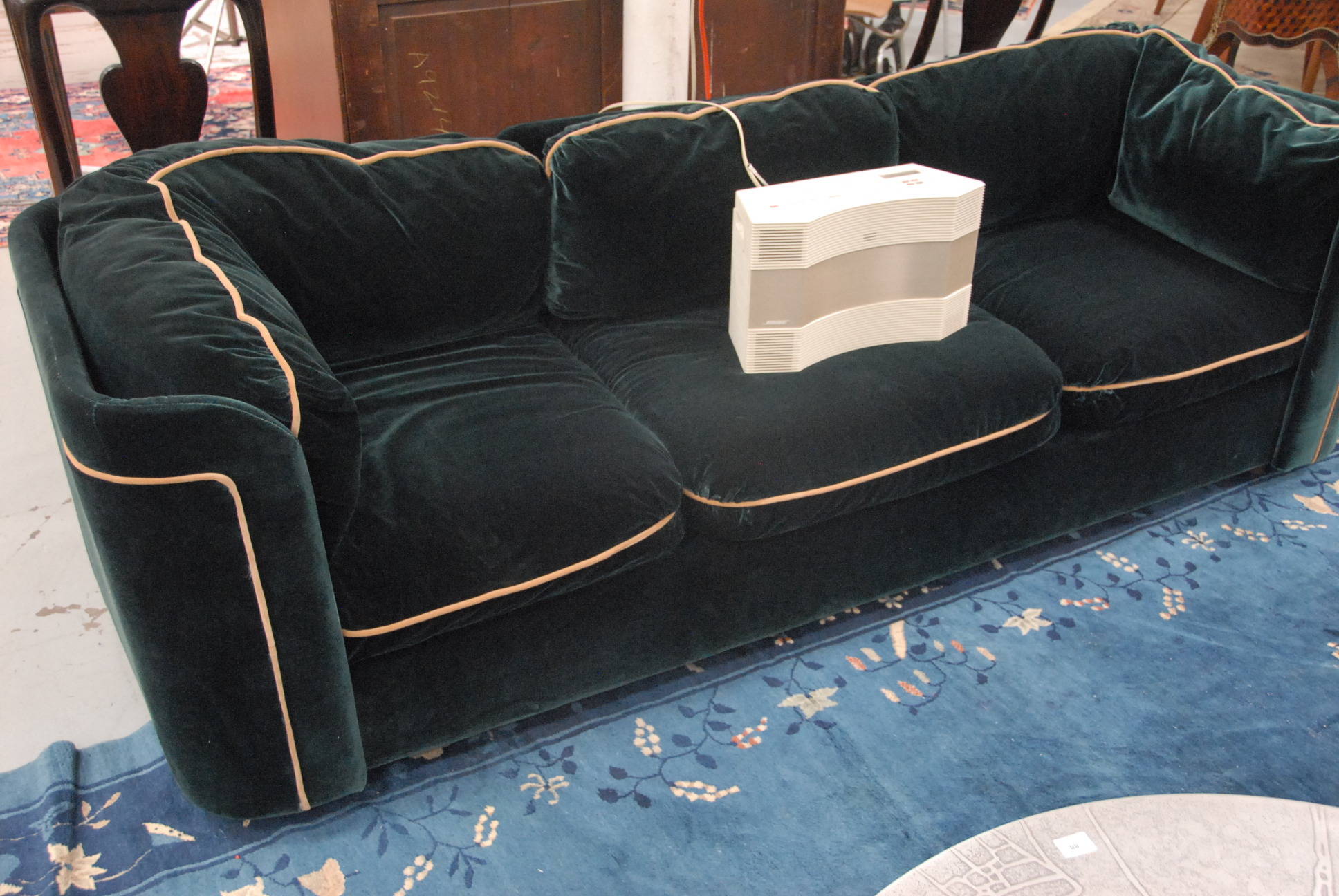 Lot 84: Pair of Charlton Company sofas green and ivory mohair in very good condition, lg. 99 1/2in. seat ht. 16in.