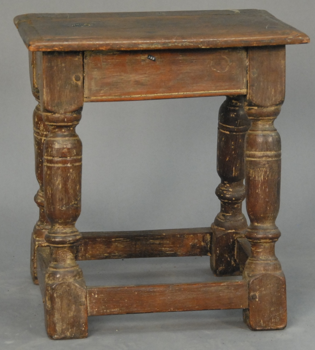 Lot 84: Pair of early English oak joint stools, each with rectangular tops, splayed block and turned legs and box stretchers. ht. 18 1/4in. top: 11 1/4 x 17