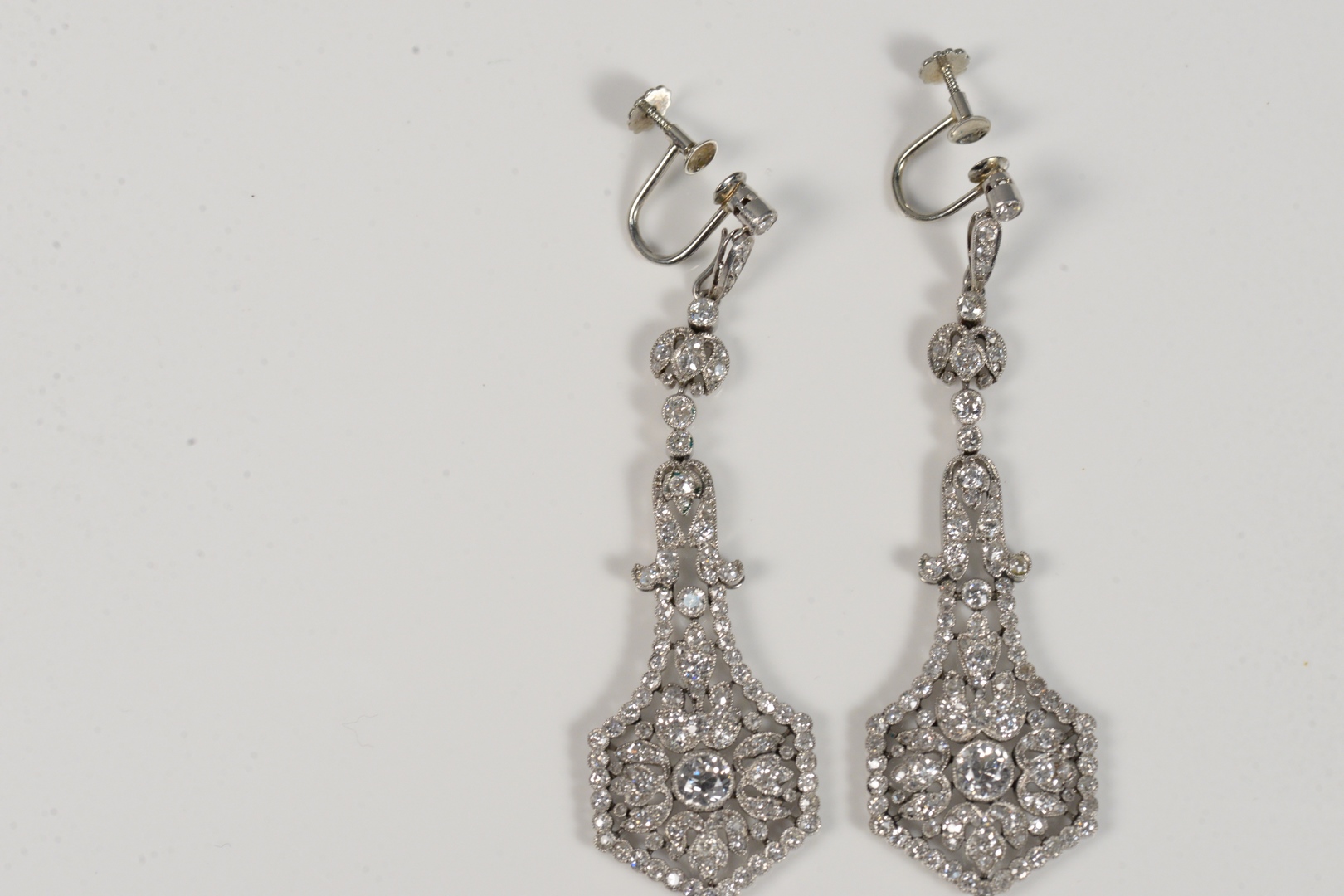 Lot 84: Platinum Diamond Earrings Edwardian period pendeloque style day/night earrings each measuring 2 1/2 inches long, earrings are non-pi…