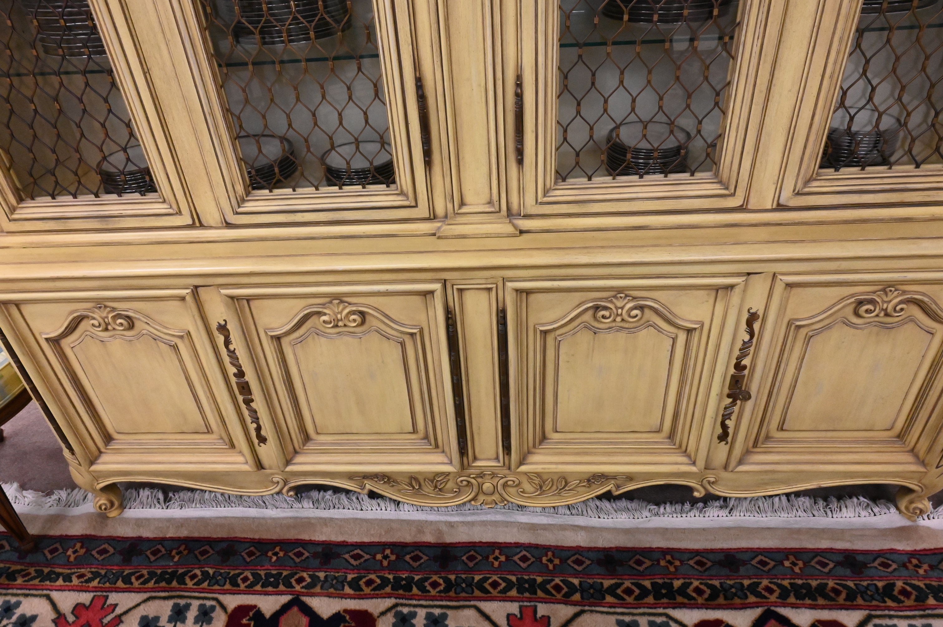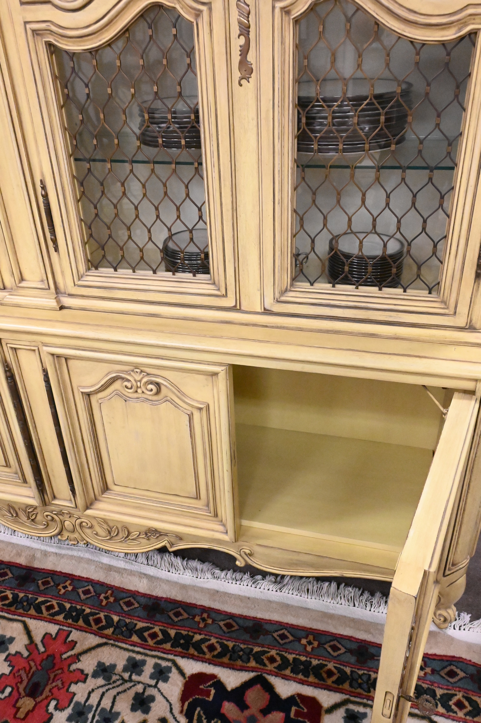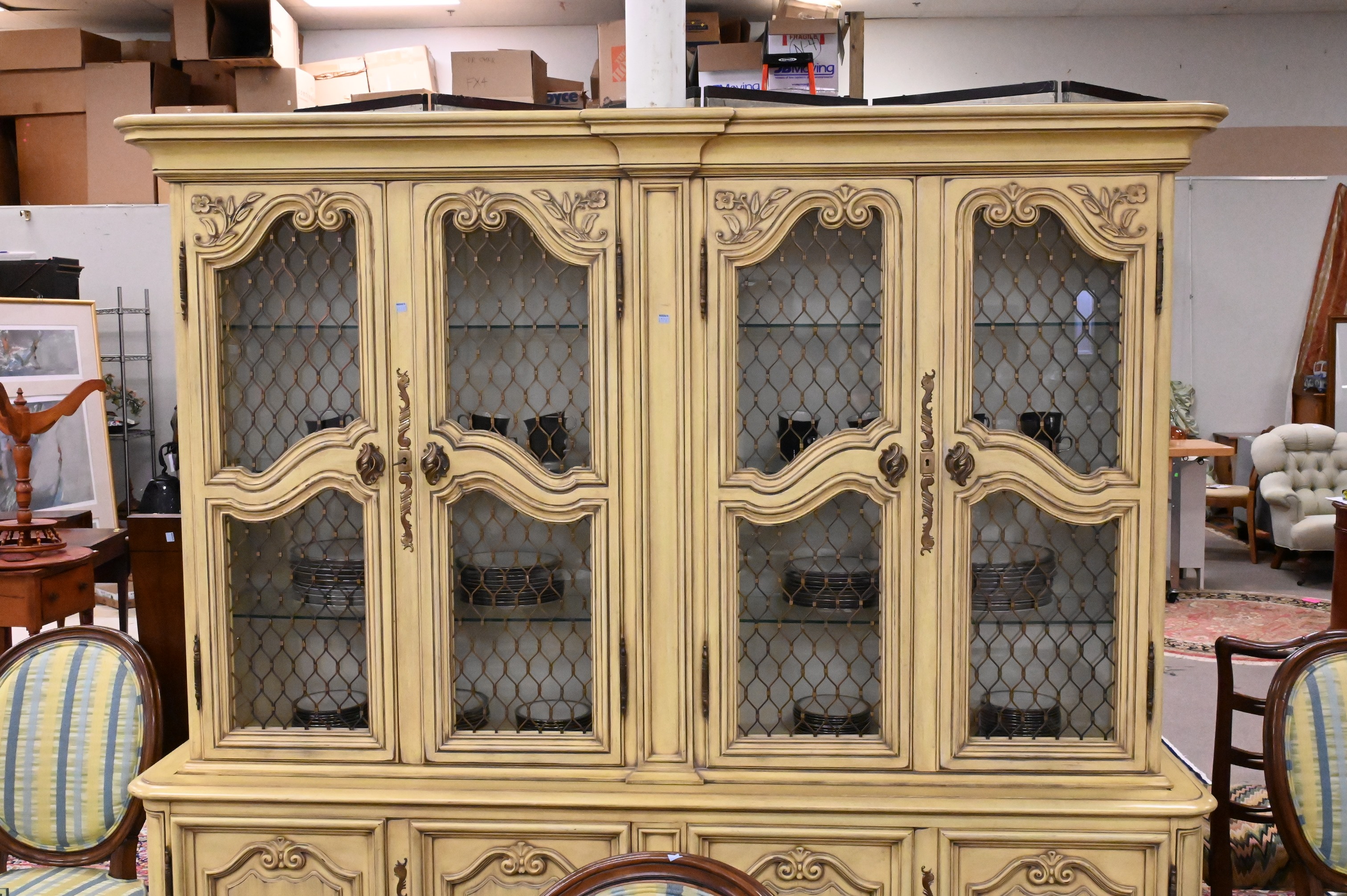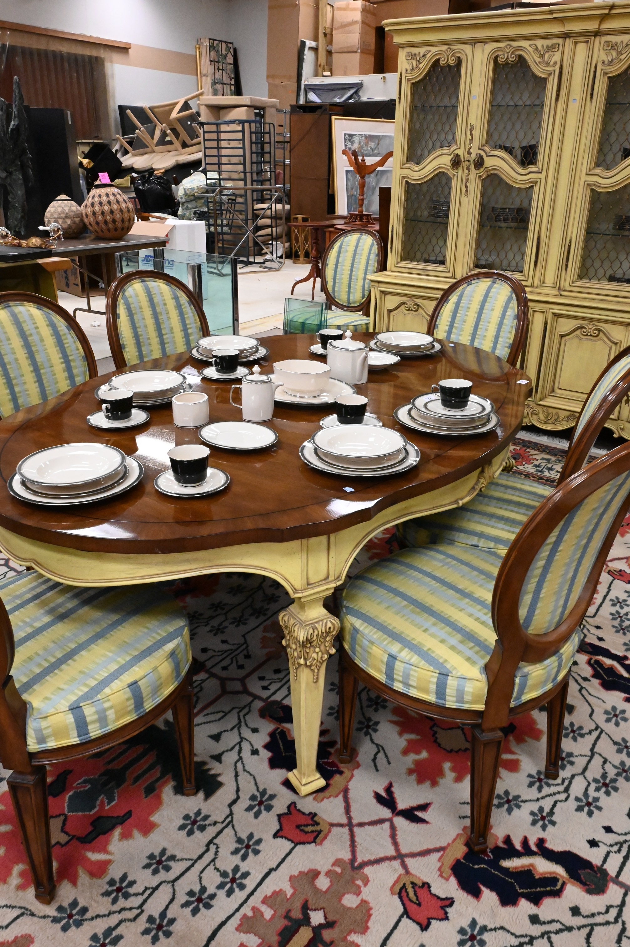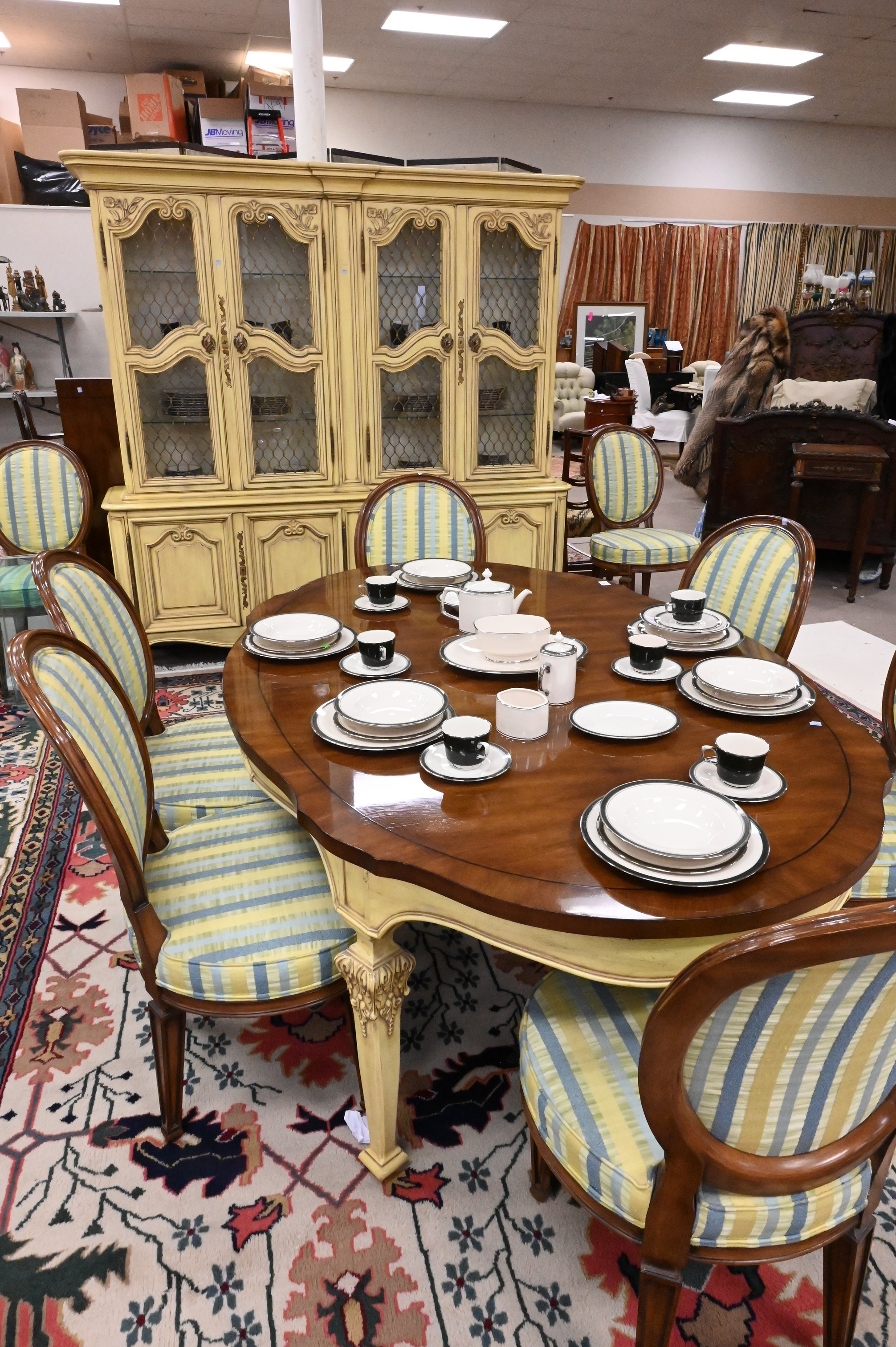 Ten Piece Karges Dining Room Set, including eight chairs labeled Karges, and a shaped table with breakfront and glass shelves, also has three leaves and pads, breakfront is 78 inches tall and 72 inches wide, table length is 130 inches open (70 inches closed) and 29 inches tall, chair height is 37 1/2 inches tall