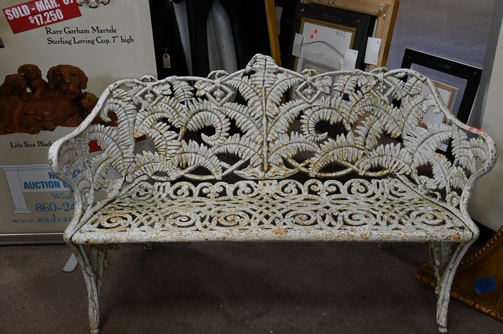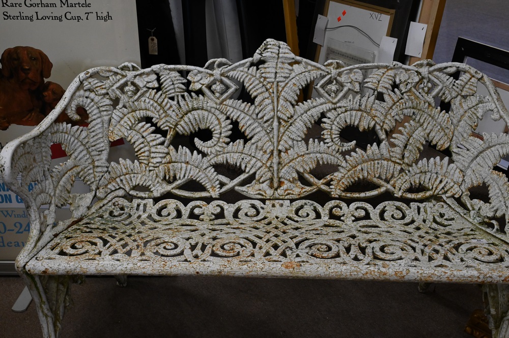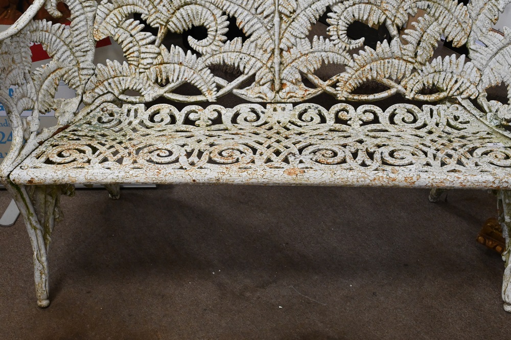 Victorian Iron Bench, fern pattern, attributed to Fisk, height 33 inches, width 55 inches.