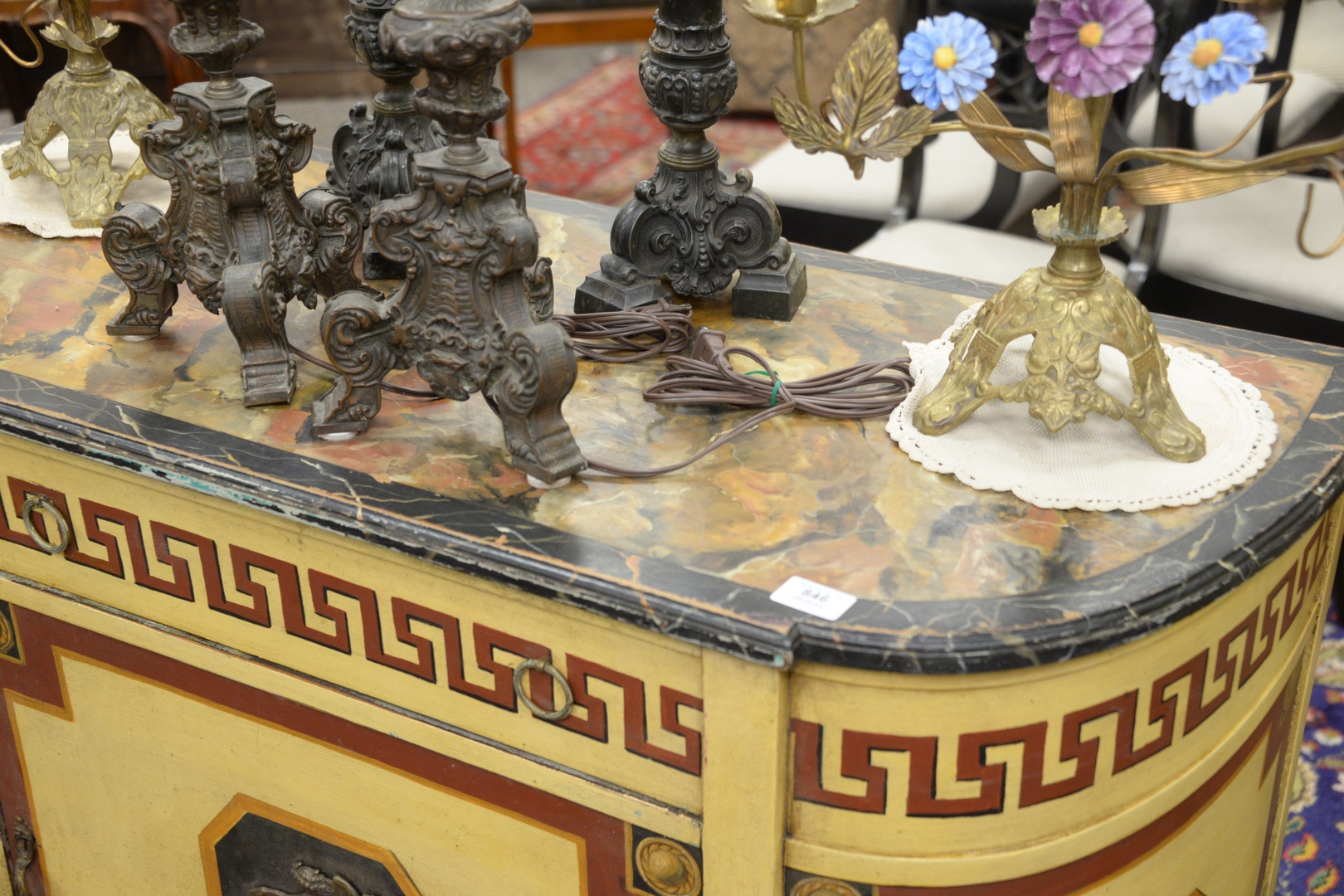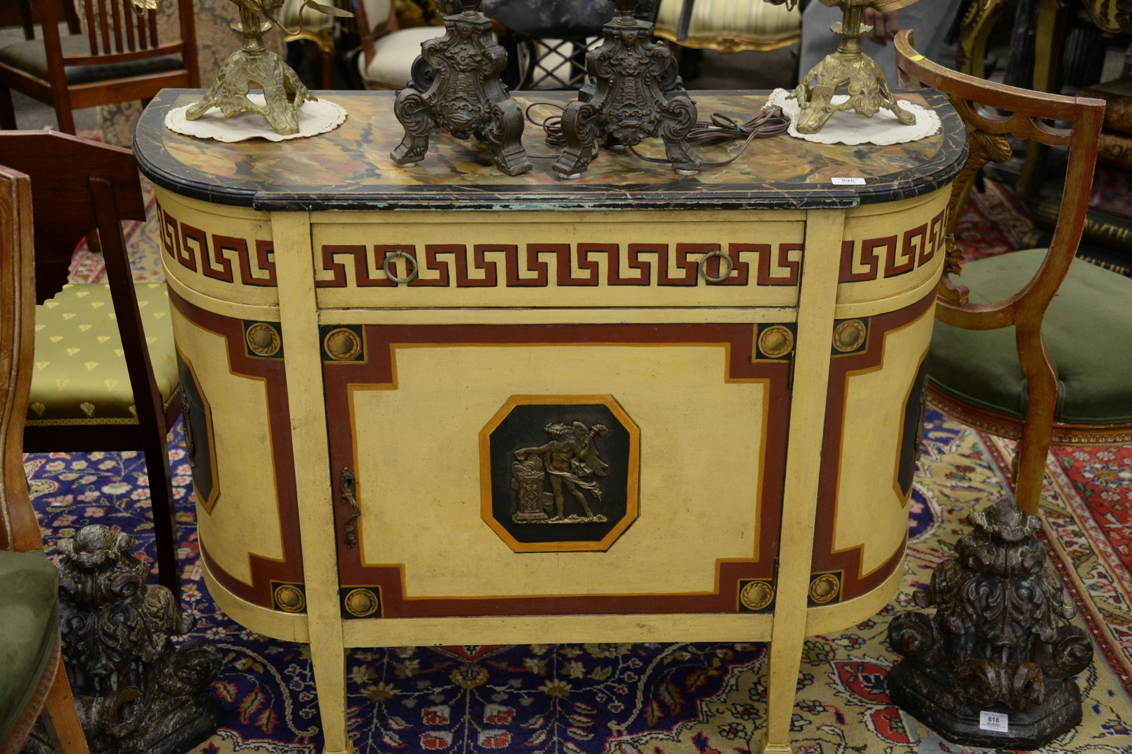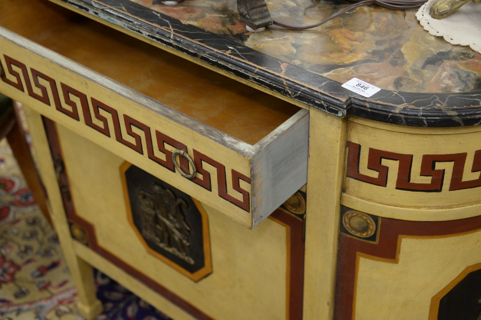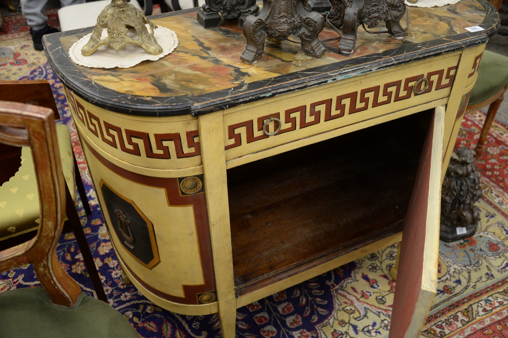 Lot 846: Neoclassical Paint Decorated Commode, having one drawer over one door, height 35 inches, width 45 inches, depth 18 inches.
