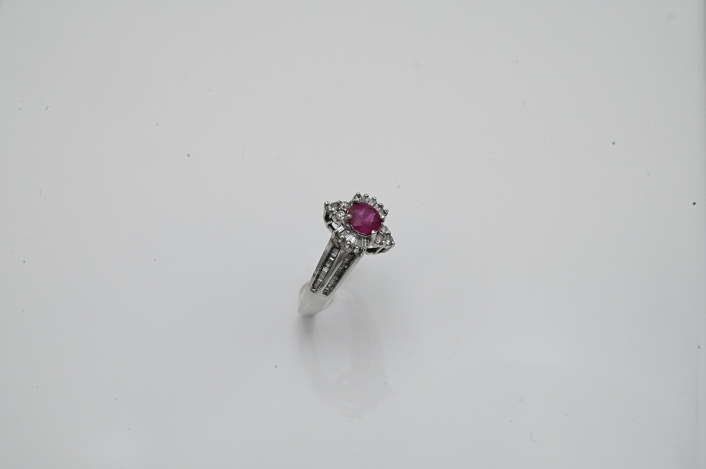 Lot 85: 14 Karat White Gold Ring, set with center round ruby surrounded by round and baguette diamonds, size 7, 5.1 grams.