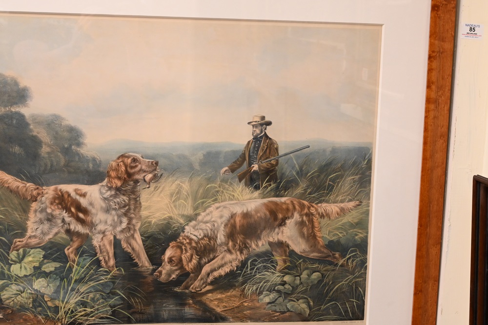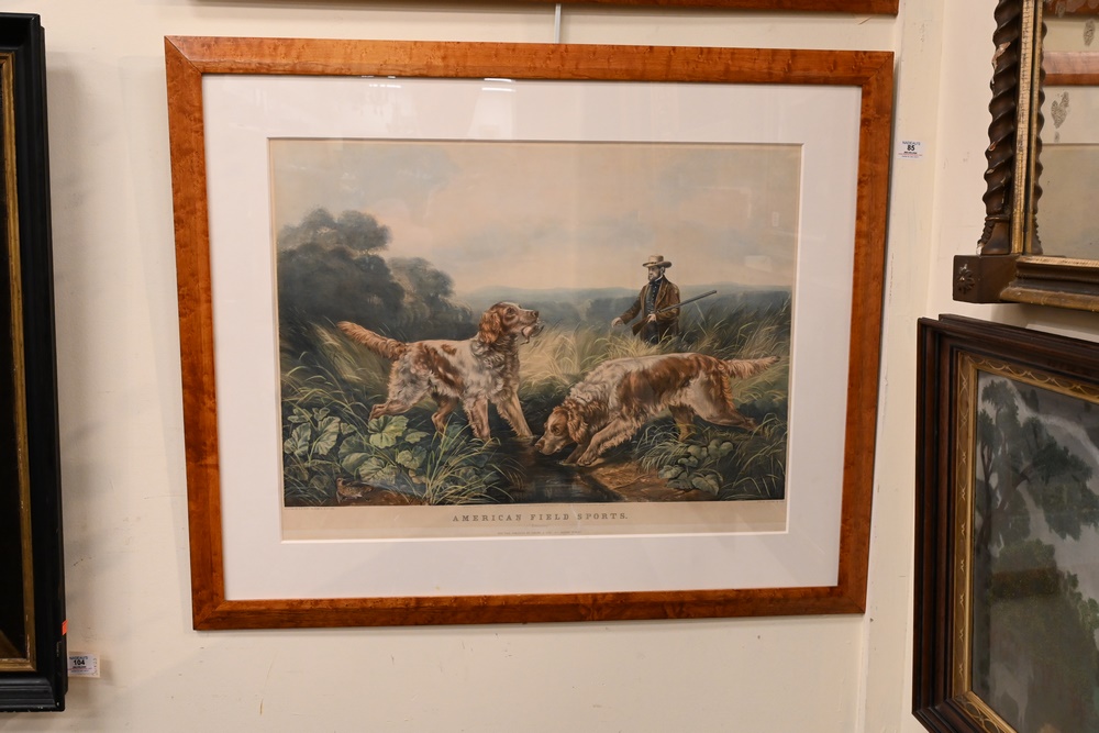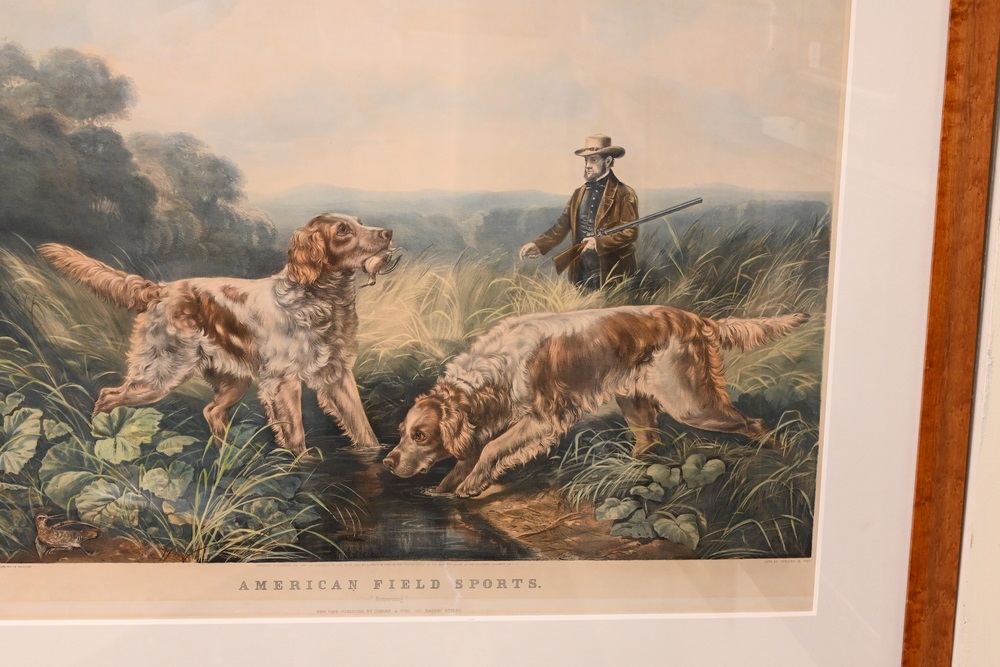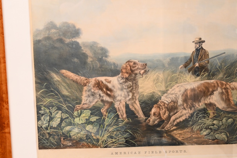 Lot 85: Currier and Ives after Arthur Fitzwilliam Tait American, 1819 – 1905 “American Field Sports, Retrieving” lithograph in colors on paper inscribed in plate throughout the lower margin image size 18 3/4 x 26 1/2 inches