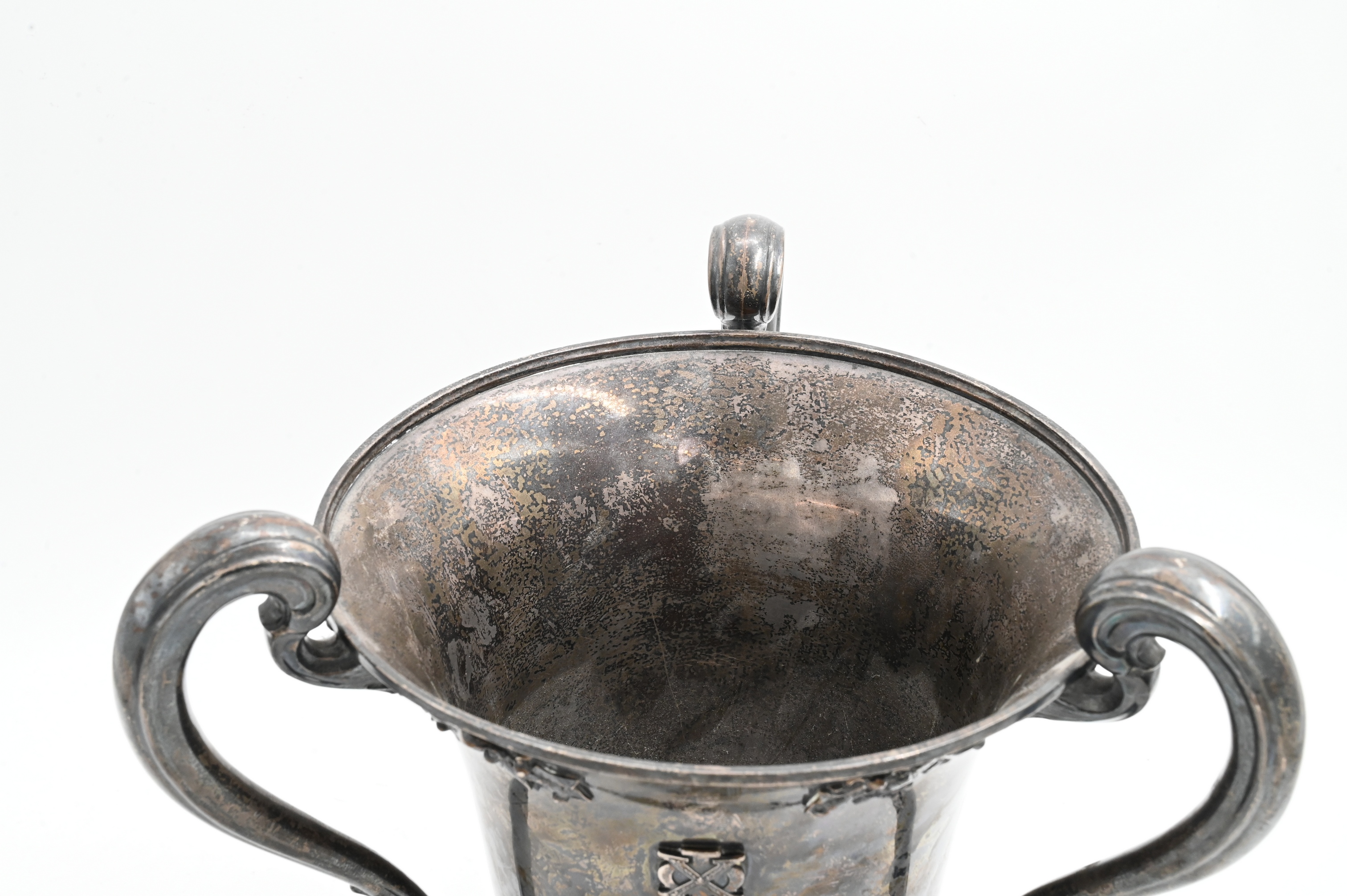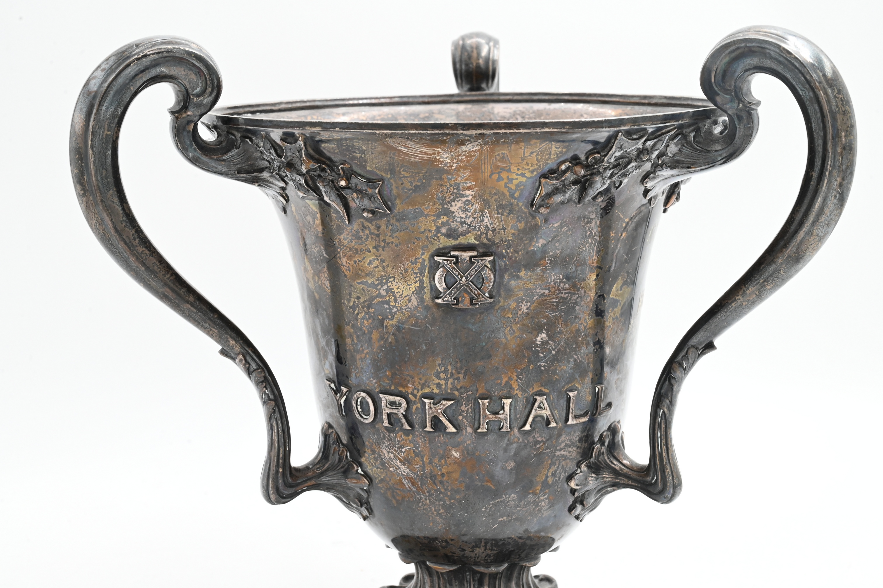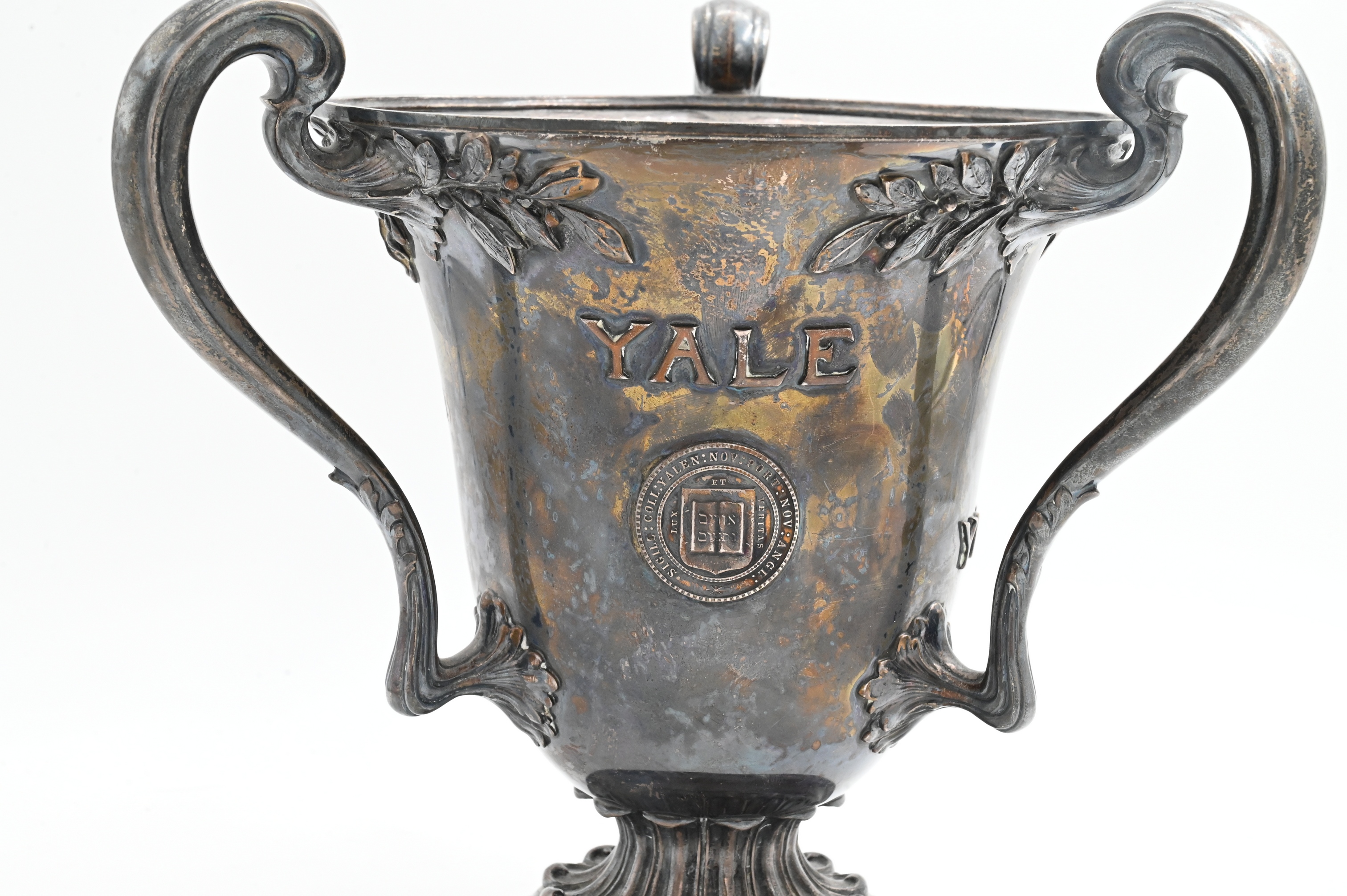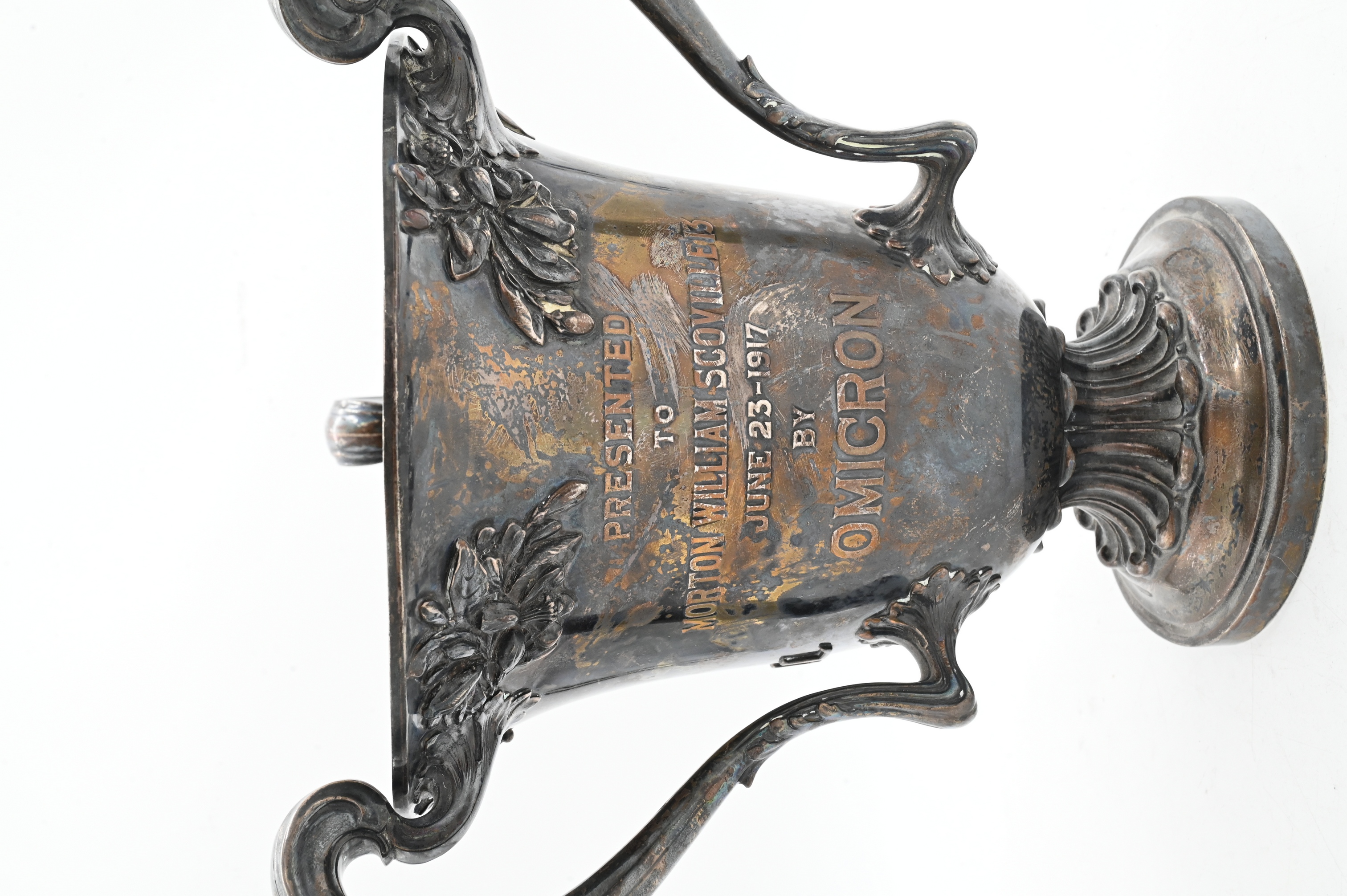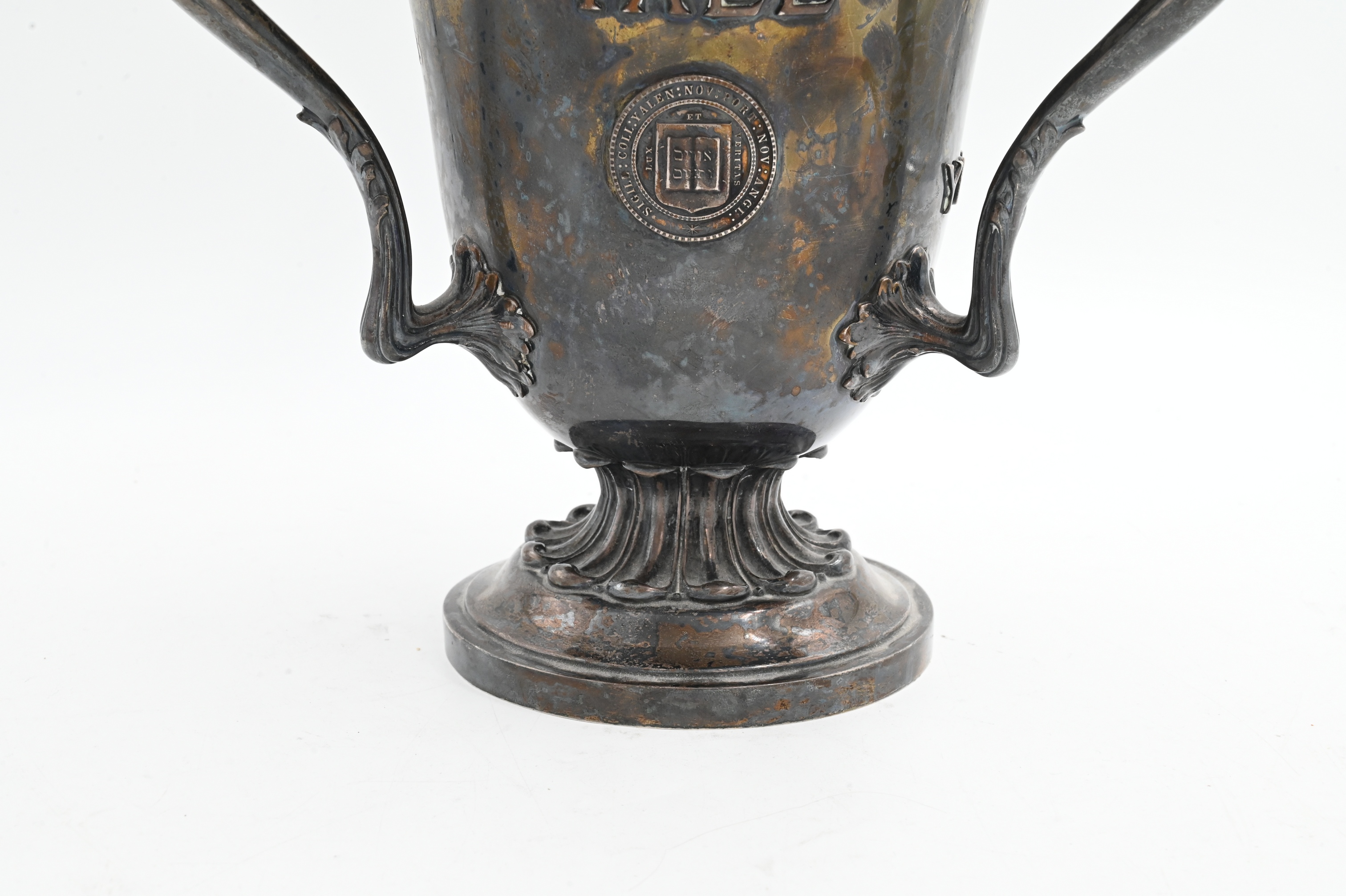 of urn form having three handles, emblazoned with the words “Yale”, “York Hall”, “Presented to William Scoville June 23, 1917 by Omicron”, etcetera