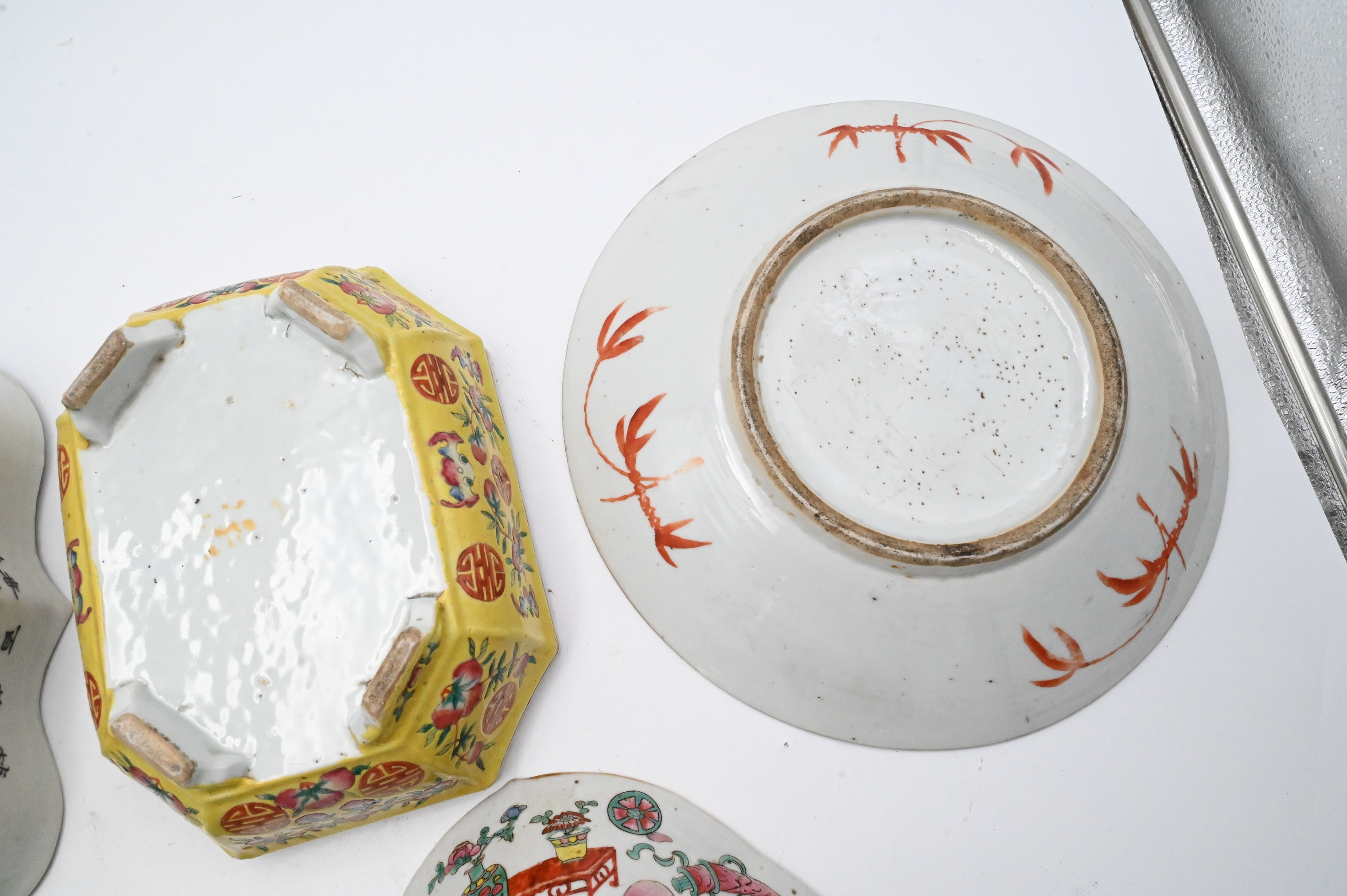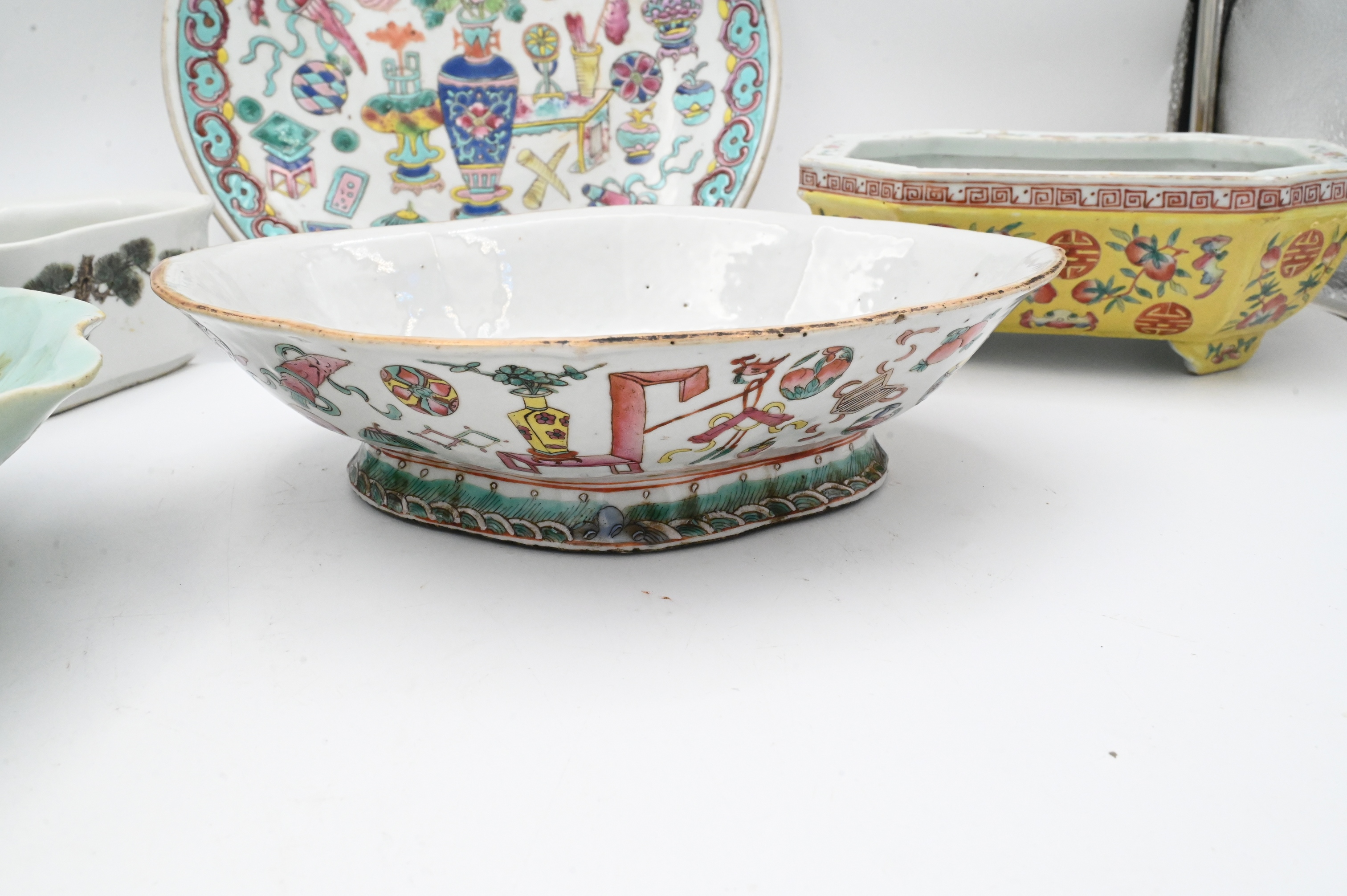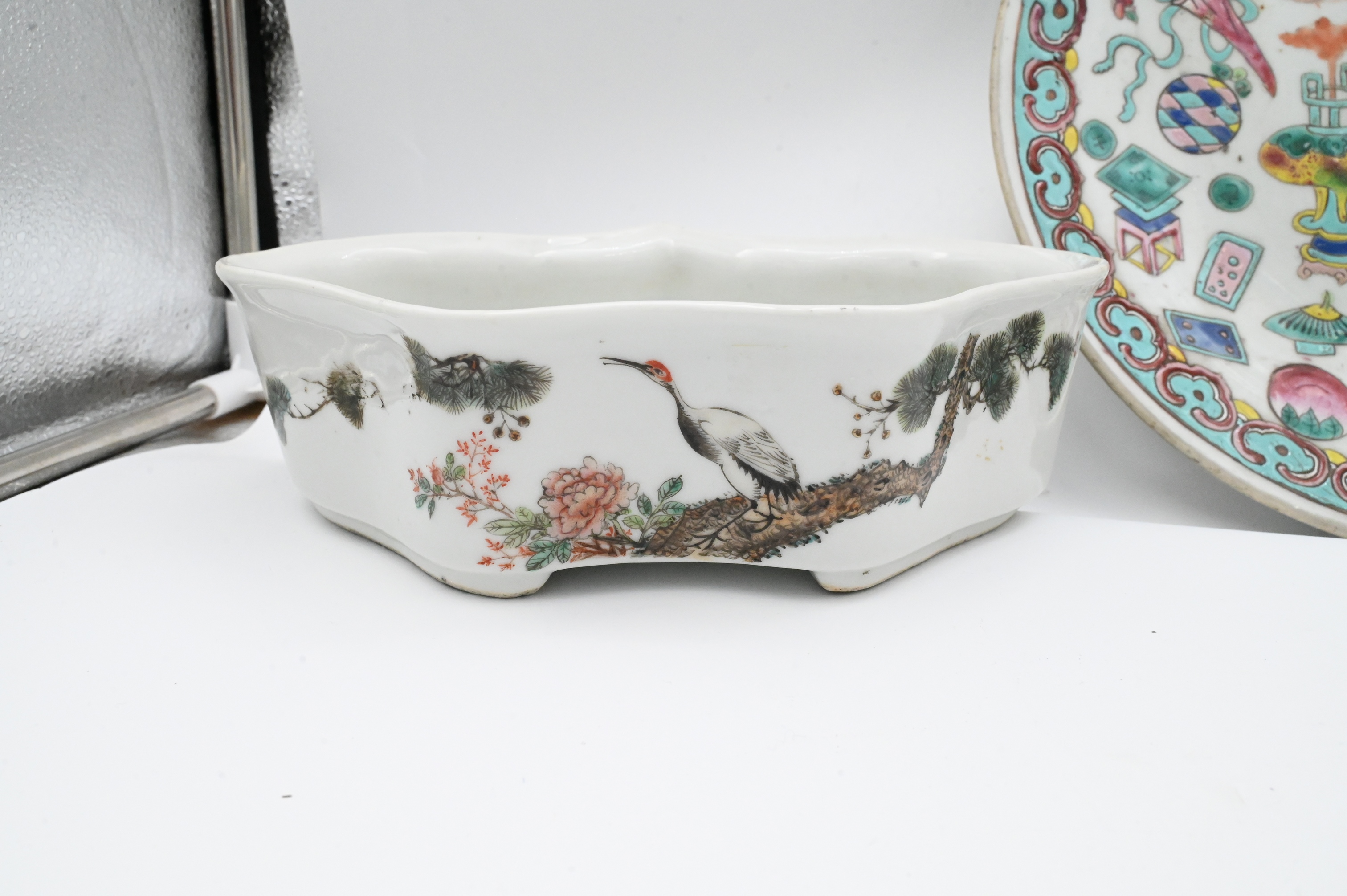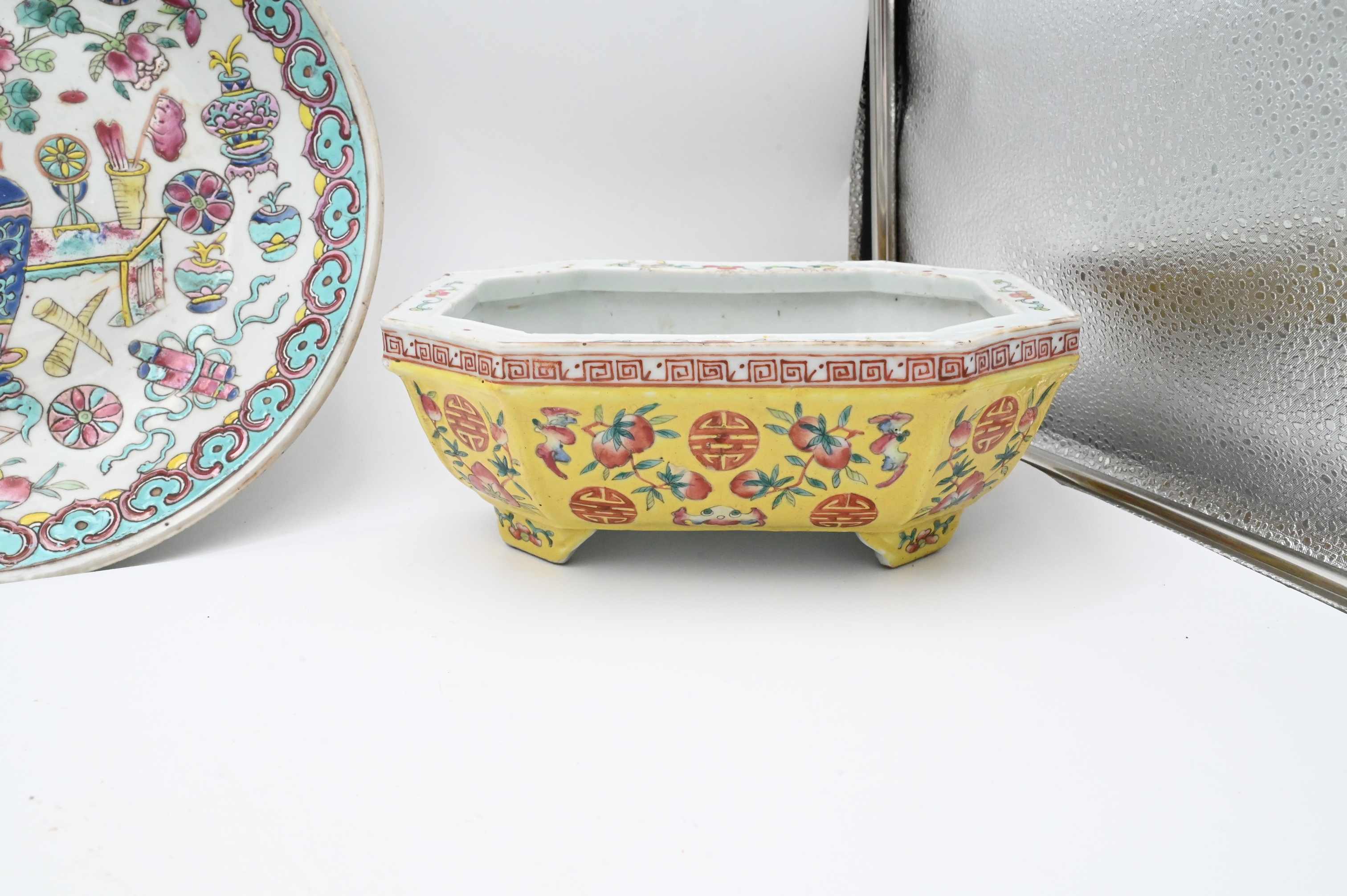 famille jaune yellow ground footed planter, butterfly/moth shaped underplate with heron/crane design, round plate and footed dish with ceremonial vases and antiquities design, along with floral celadon dish
