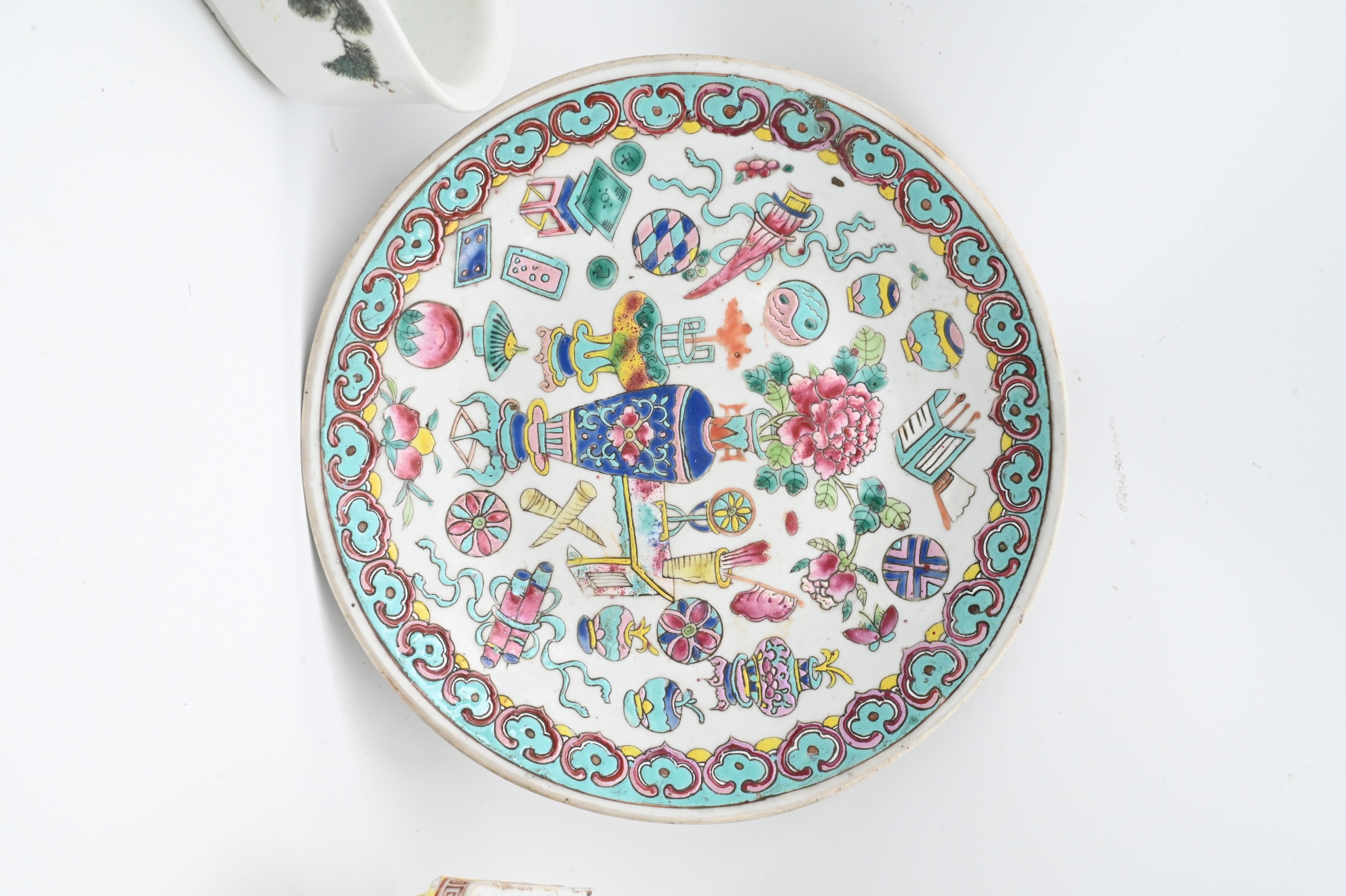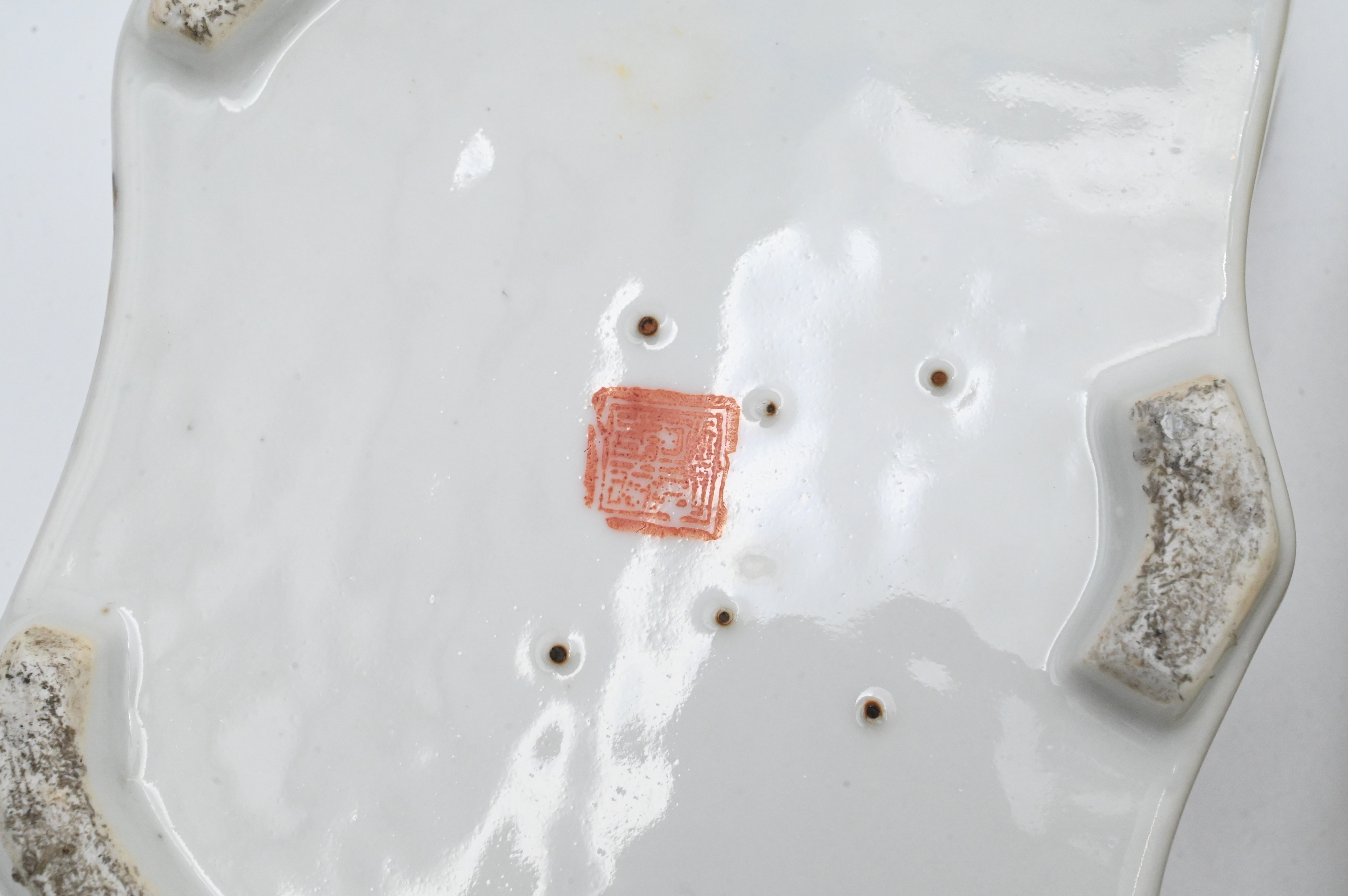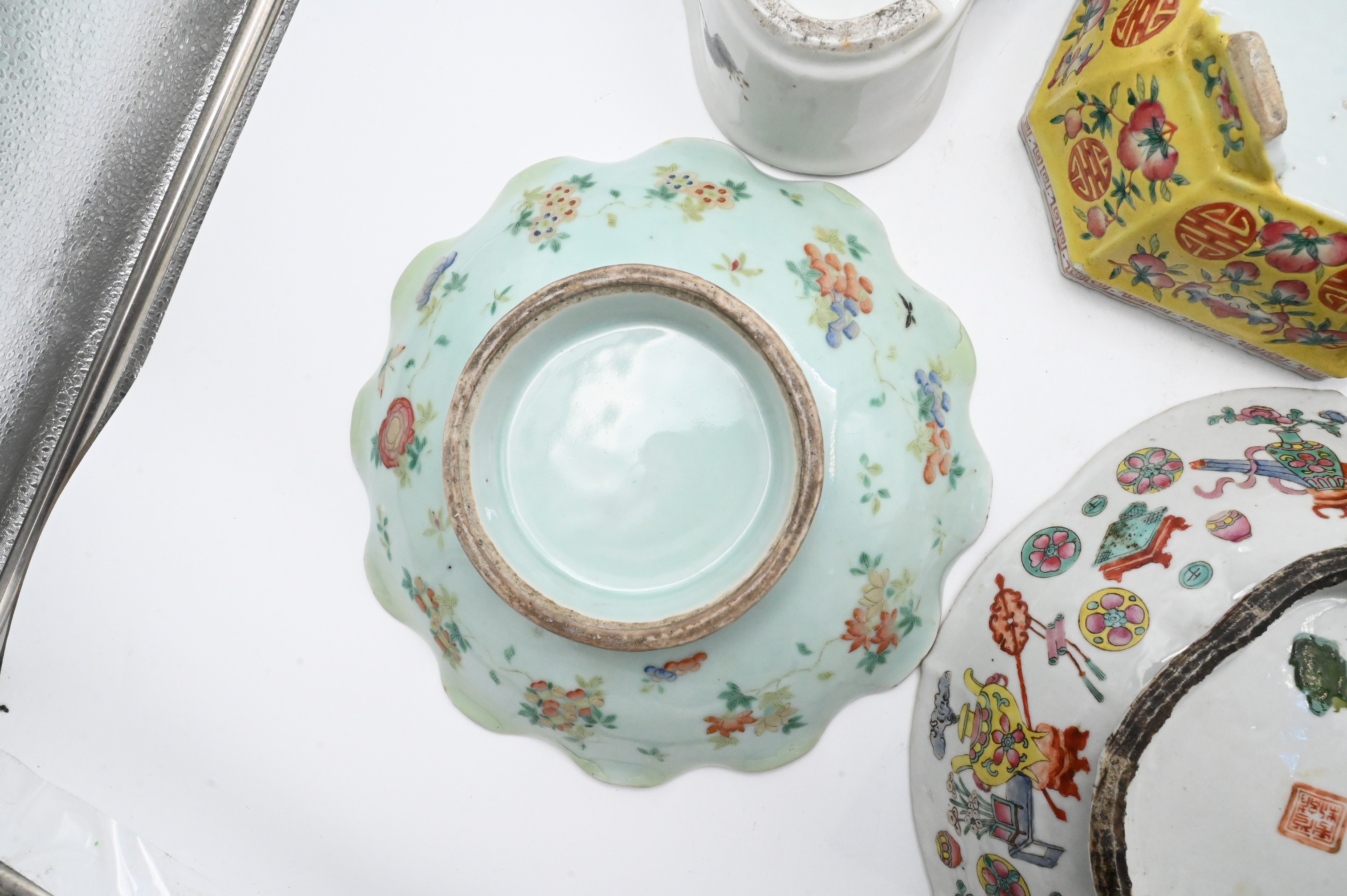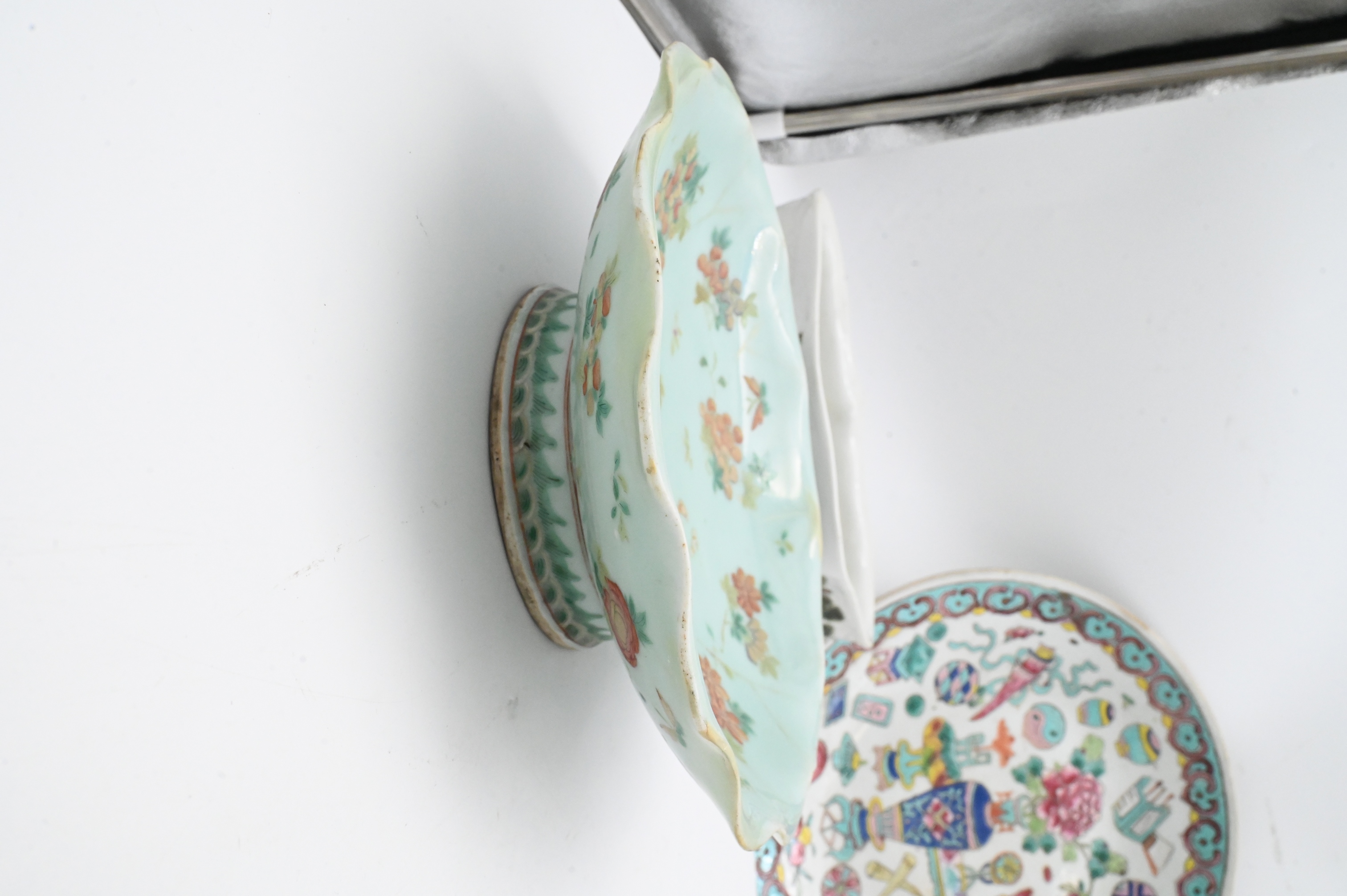 famille jaune yellow ground footed planter, butterfly/moth shaped underplate with heron/crane design, round plate and footed dish with ceremonial vases and antiquities design, along with floral celadon dish
