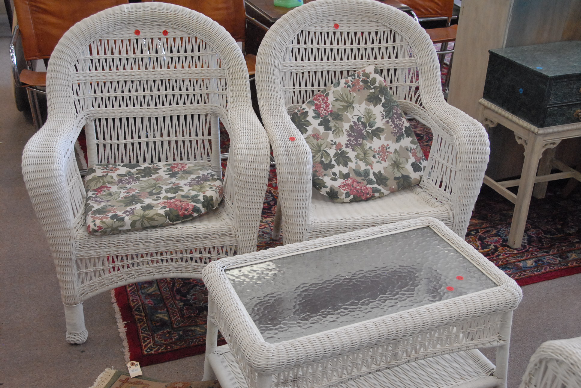 Lot 85: Five piece wicker lot to include four armchairs