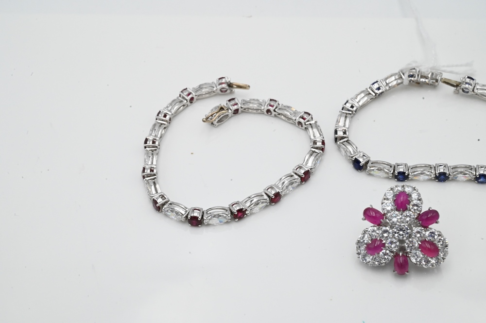 Group of Sterling and Cubic Zirconia Costume Jewelry Pieces, to include ruby and cubic zirconia floral earrings, ruby and cubic zirconia bracelet, along with a sapphire and cubic zirconia bracelet.