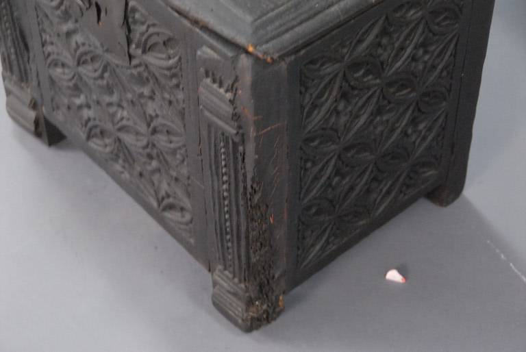 Jacobean lift top box with carved panels, oak, probably 17th century one foot replaced. ht. 14in. wd. 16in. dp. 11in. Being sold to benefit a Connecticut Museum.