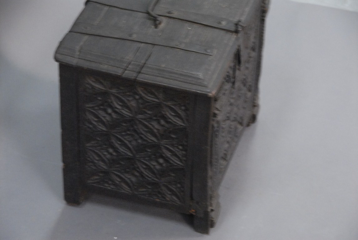Lot 85: Jacobean lift top box with carved panels, oak, probably 17th century one foot replaced. ht. 14in. wd. 16in. dp. 11in. Being sold…