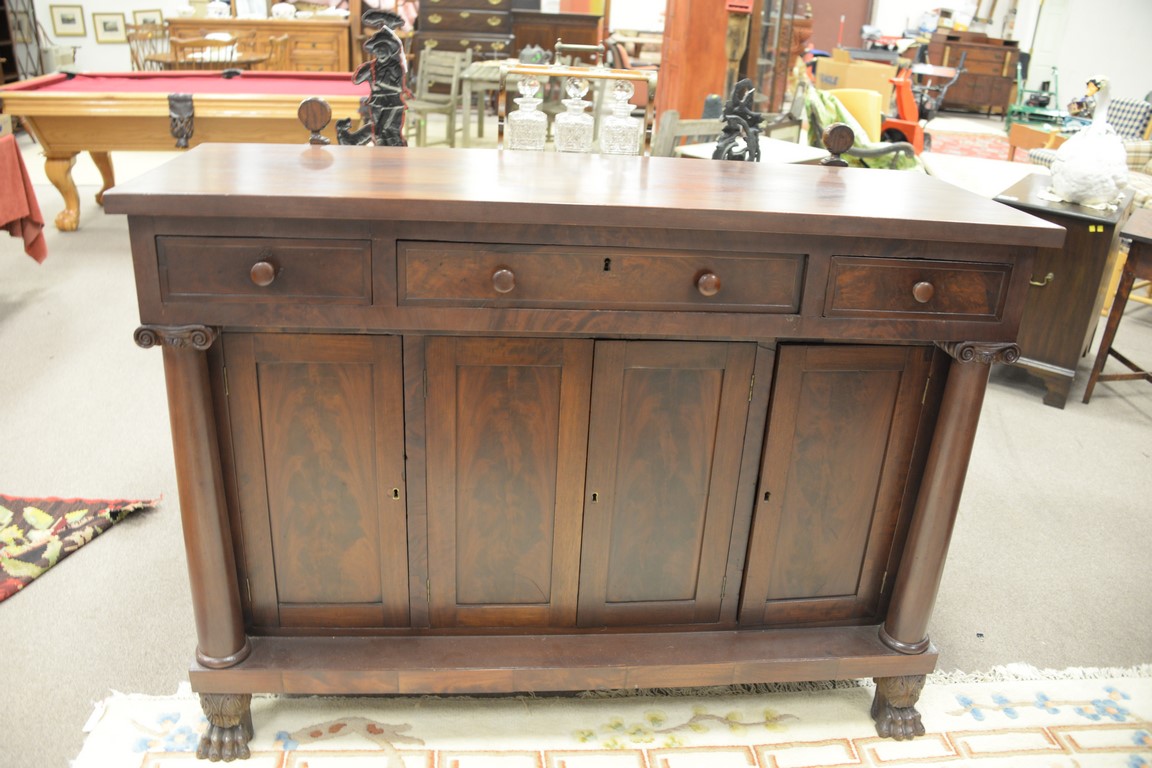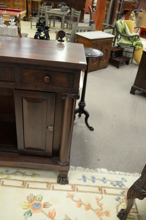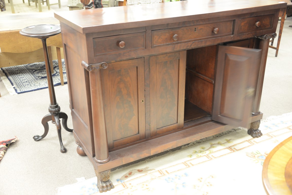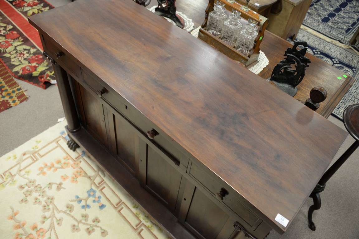 Lot 85: Large Victorian mahogany server having three drawers over four doors on claw feet. ht. 43in., lg. 60in.