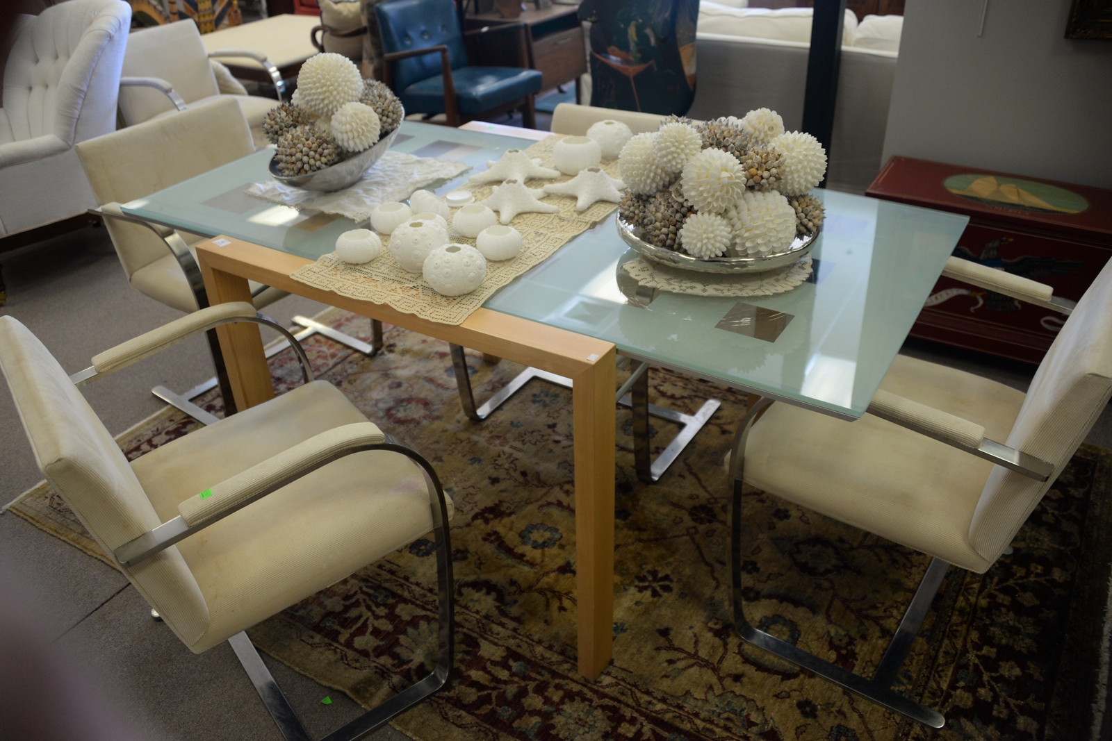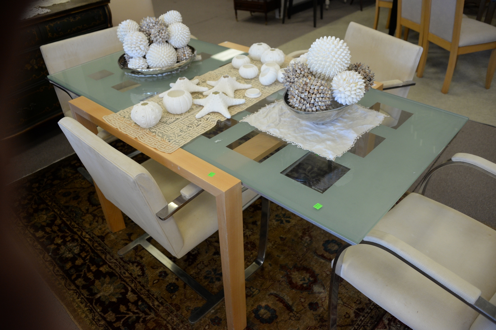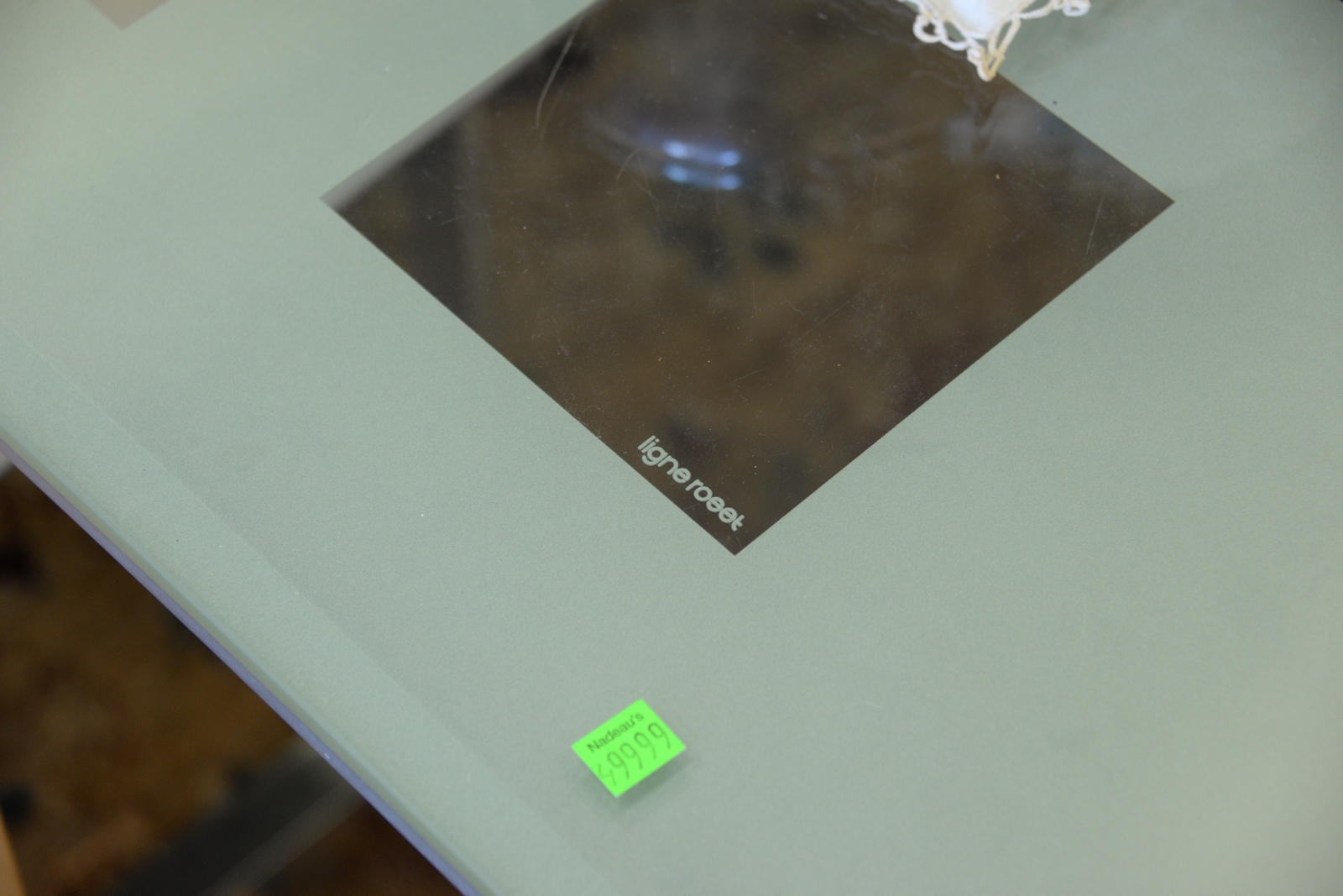 Lot 85: Ligne Roset contemporary glass top extending table. ht. 29in., top closed: 37 x 37, top open: 37 x 67