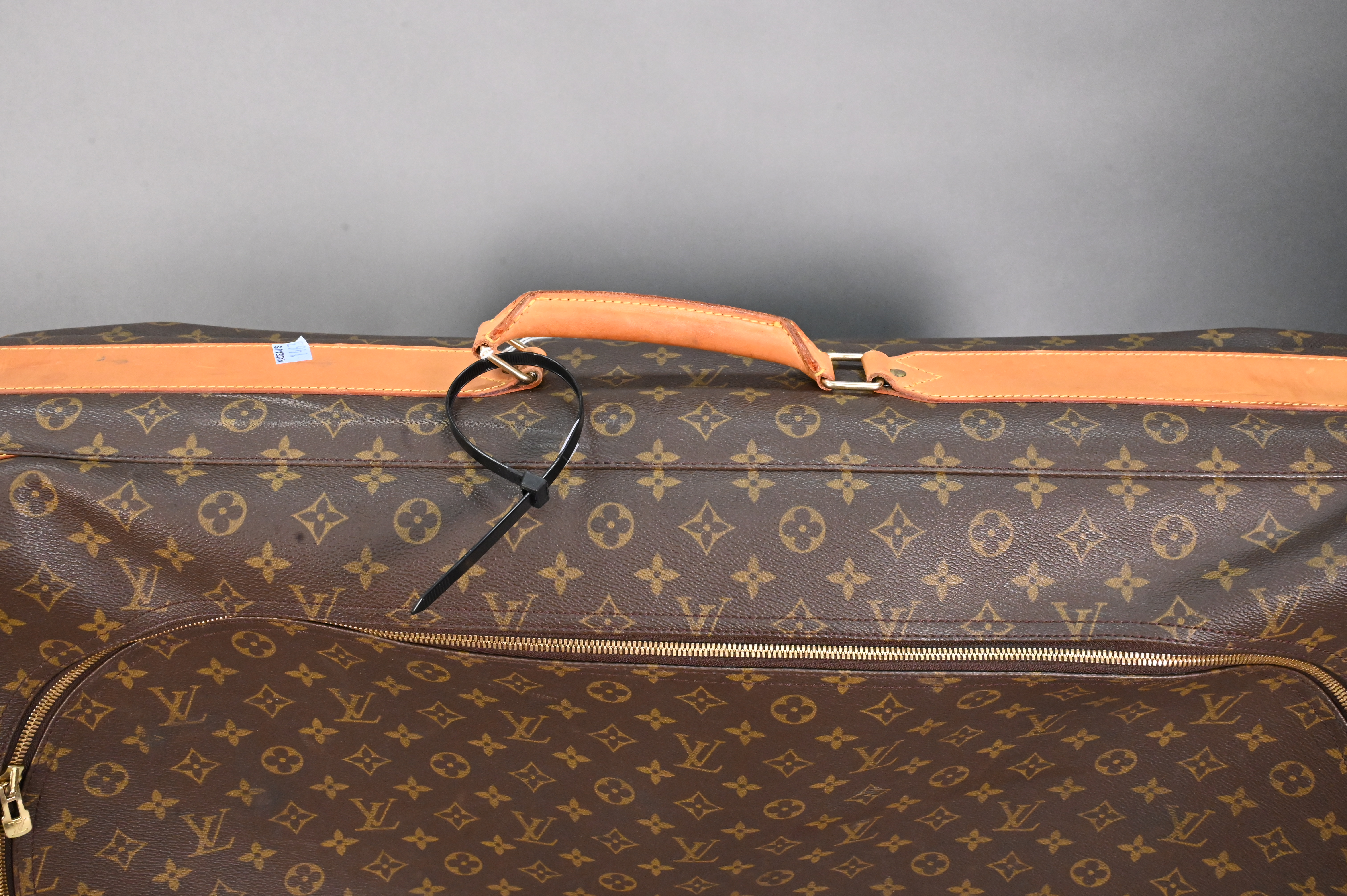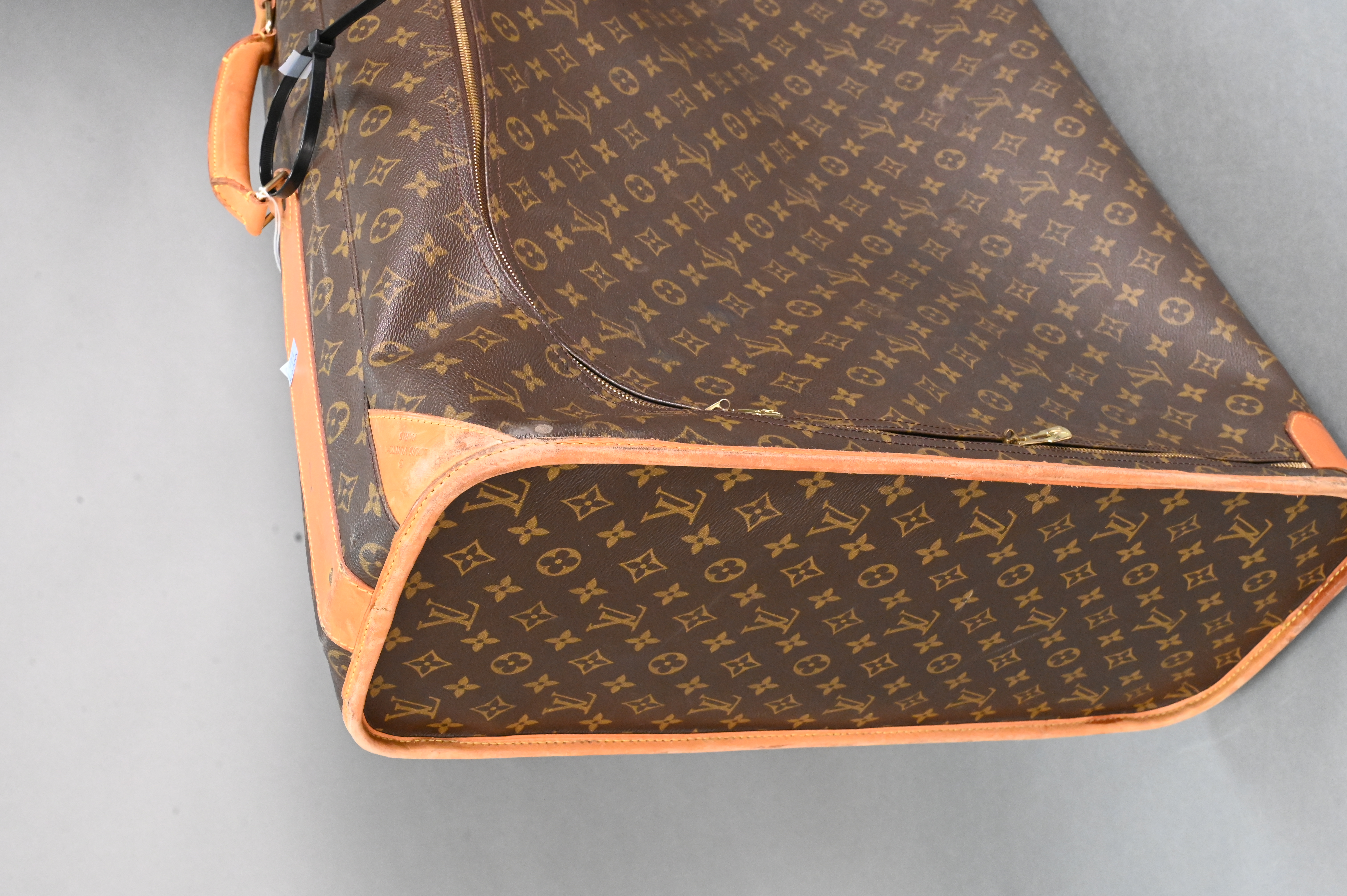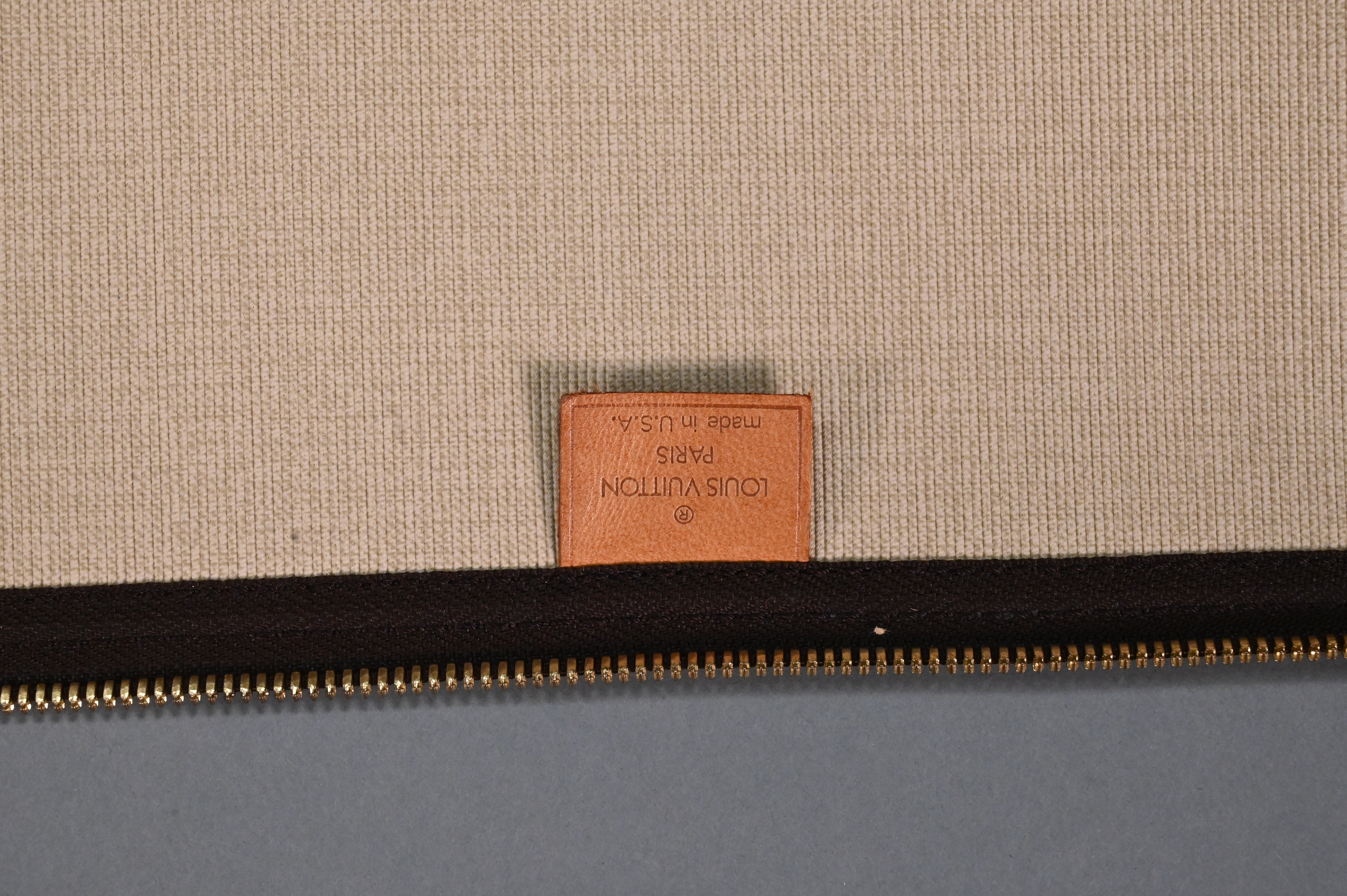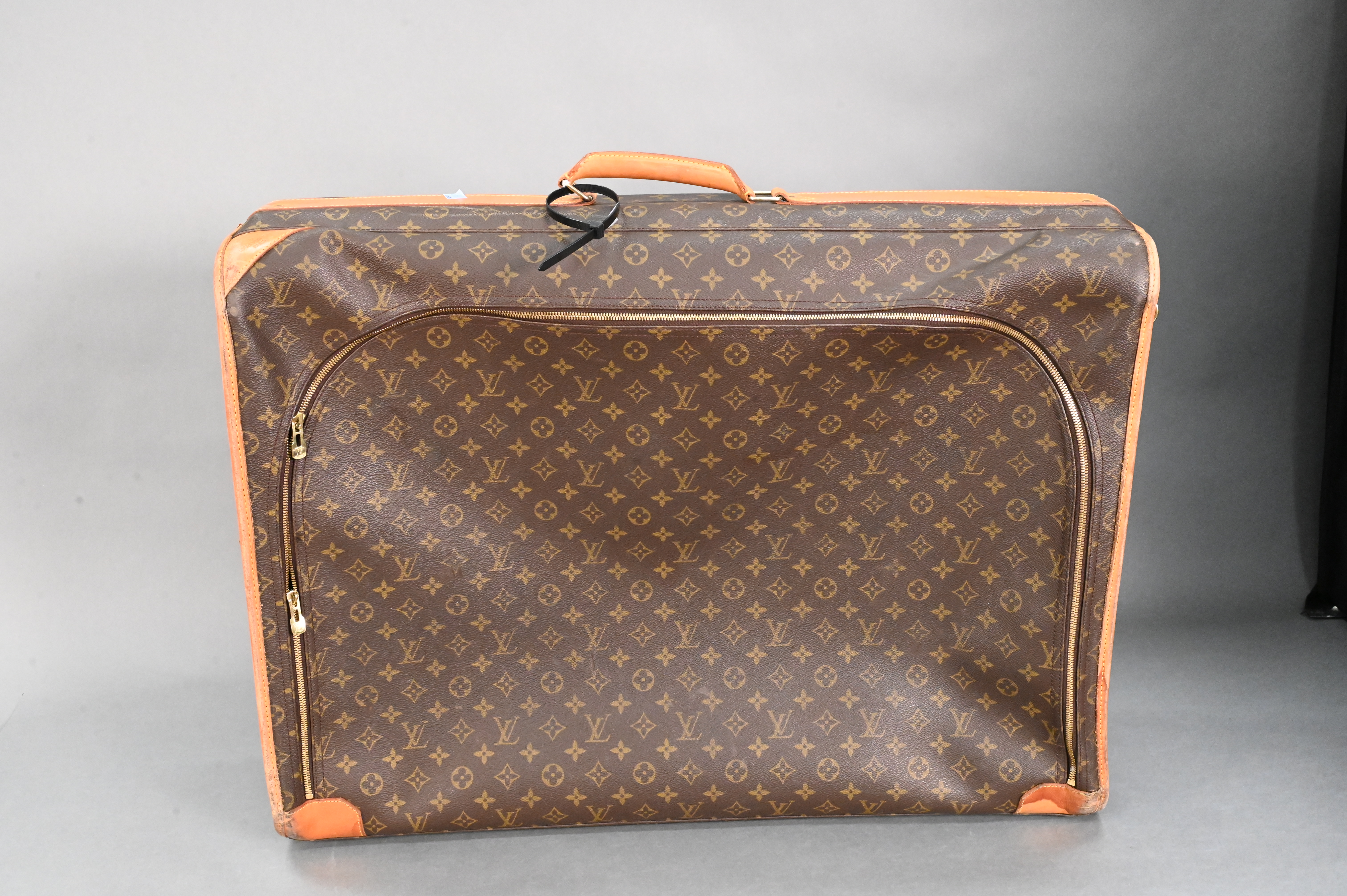Louis Vuitton Monogrammed Soft Side Suitcase, canvas with tan leather corners, height 21 inches, width 29 inches, depth 9 inches.