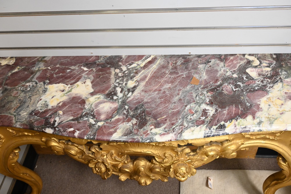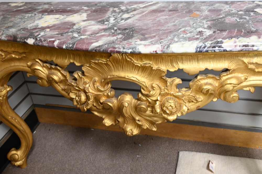 Lot 85: Louis XV Style Wall Mounted Table, having shaped marble top and carved gilt base, height 27 inches, top 49 x 14 inches.