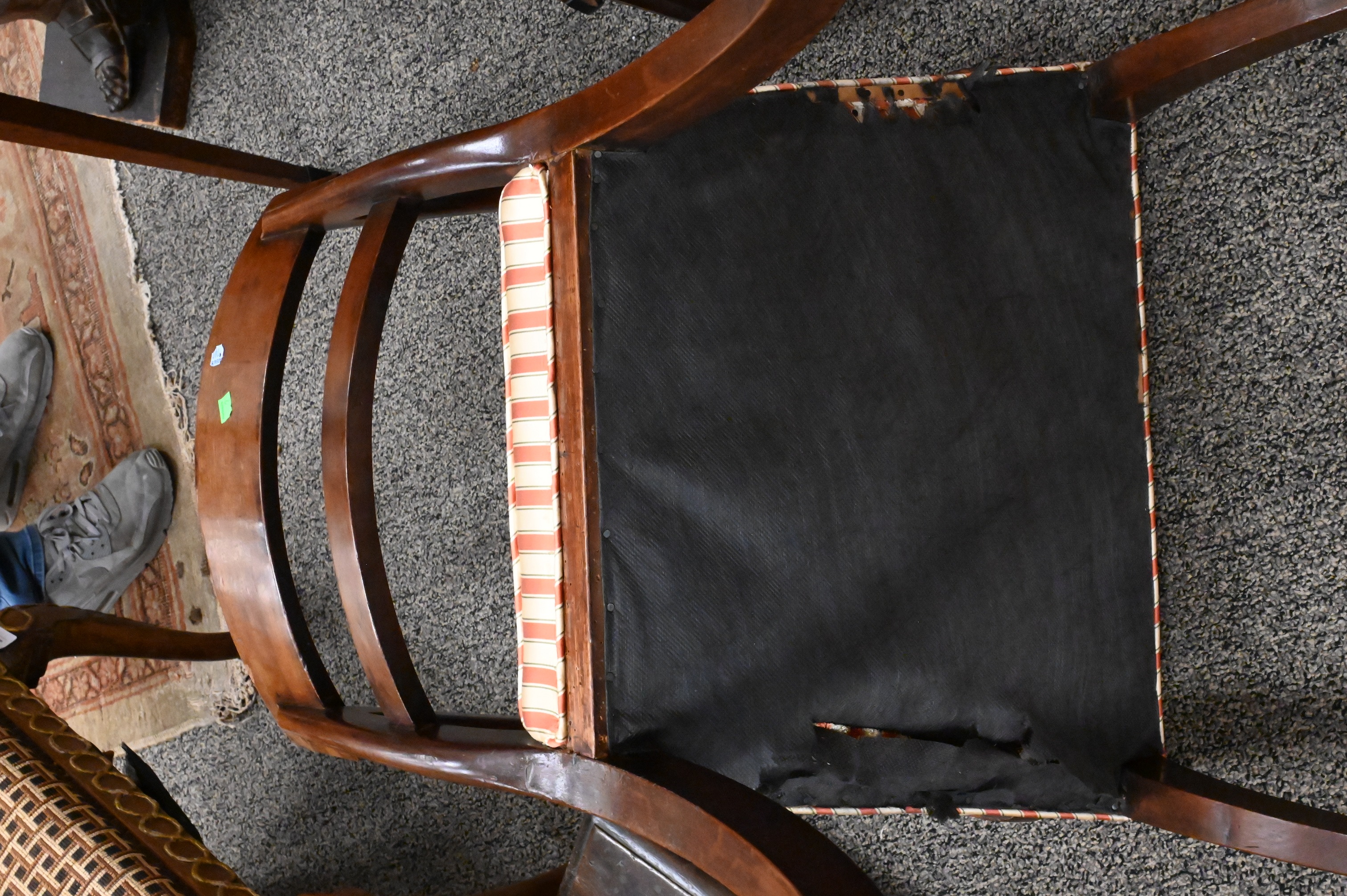 regency mahogany armchair with a carved and ebonized Greek-key motif to the back support, scrolling arms with reeded supports, and shaped front legs with gentle saber-form rear legs, upholstered seat in striped fabric, English, Regency Period, C. 1810